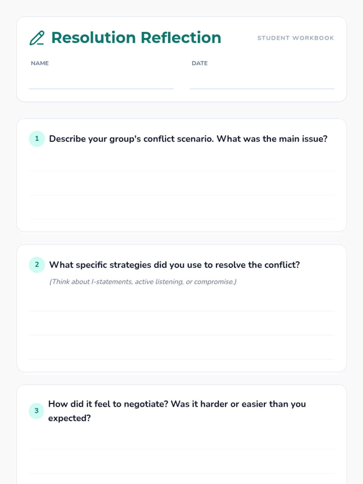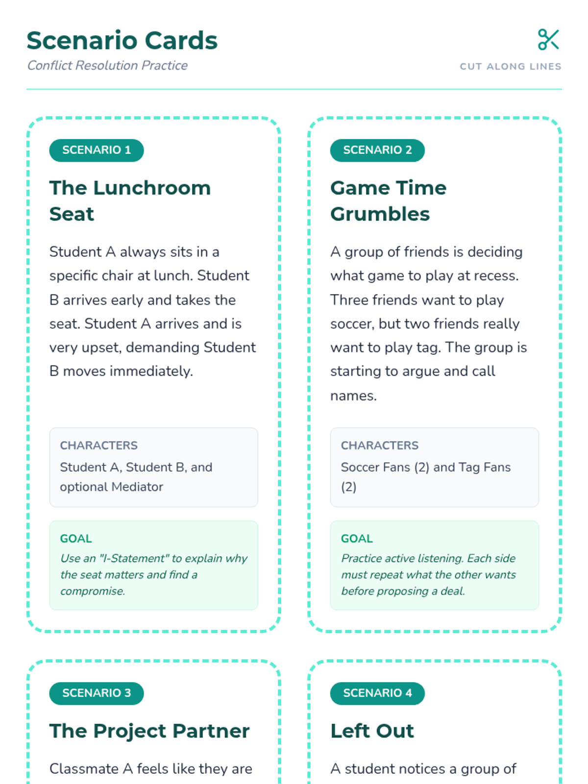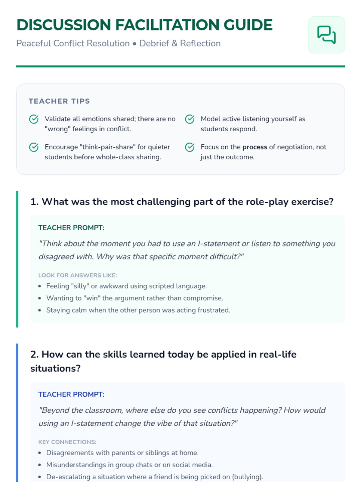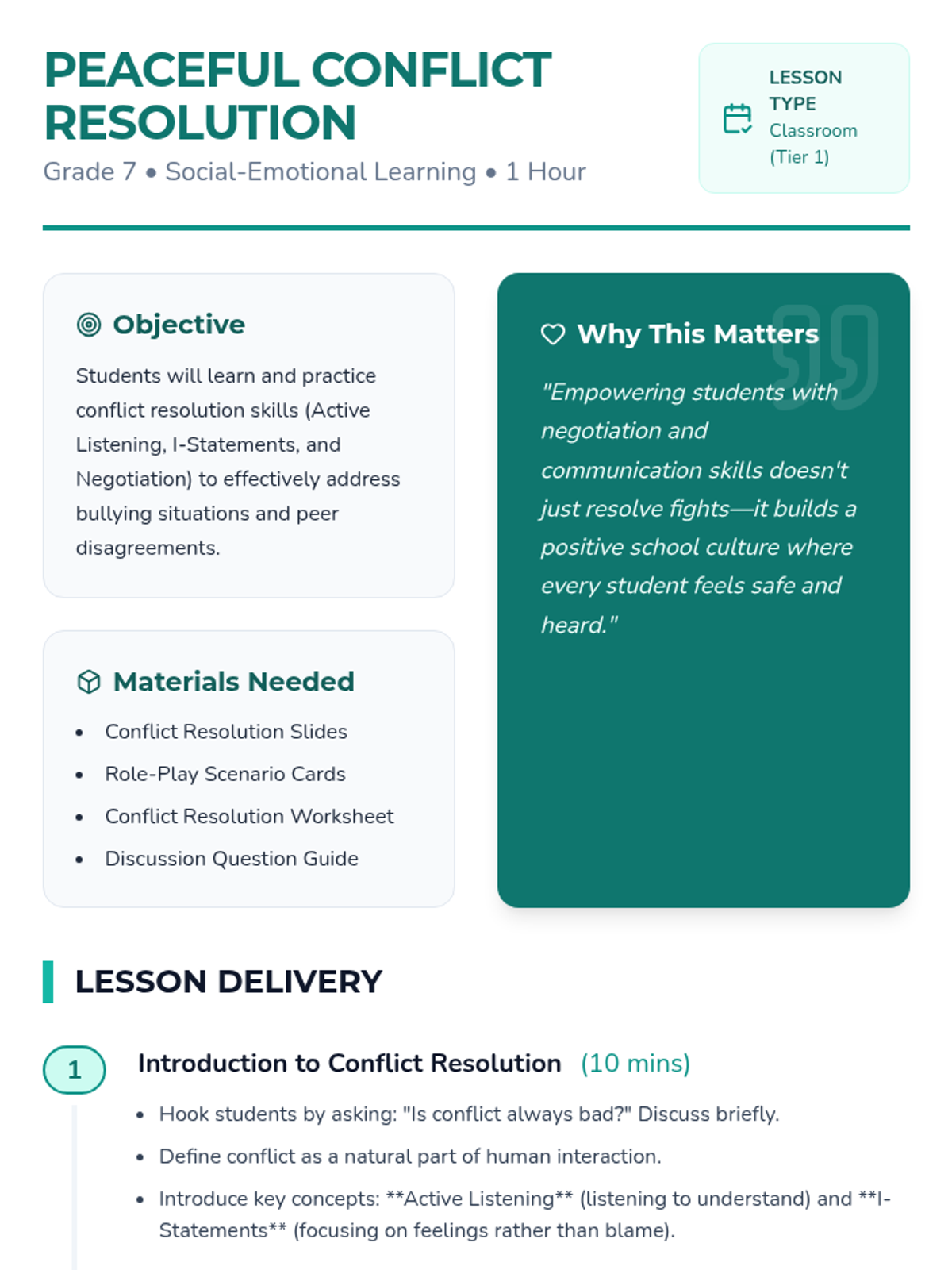 A 1-hour lesson for 7th graders focused on developing communication and negotiation skills through role-playing to resolve conflicts peacefully and address bullying.