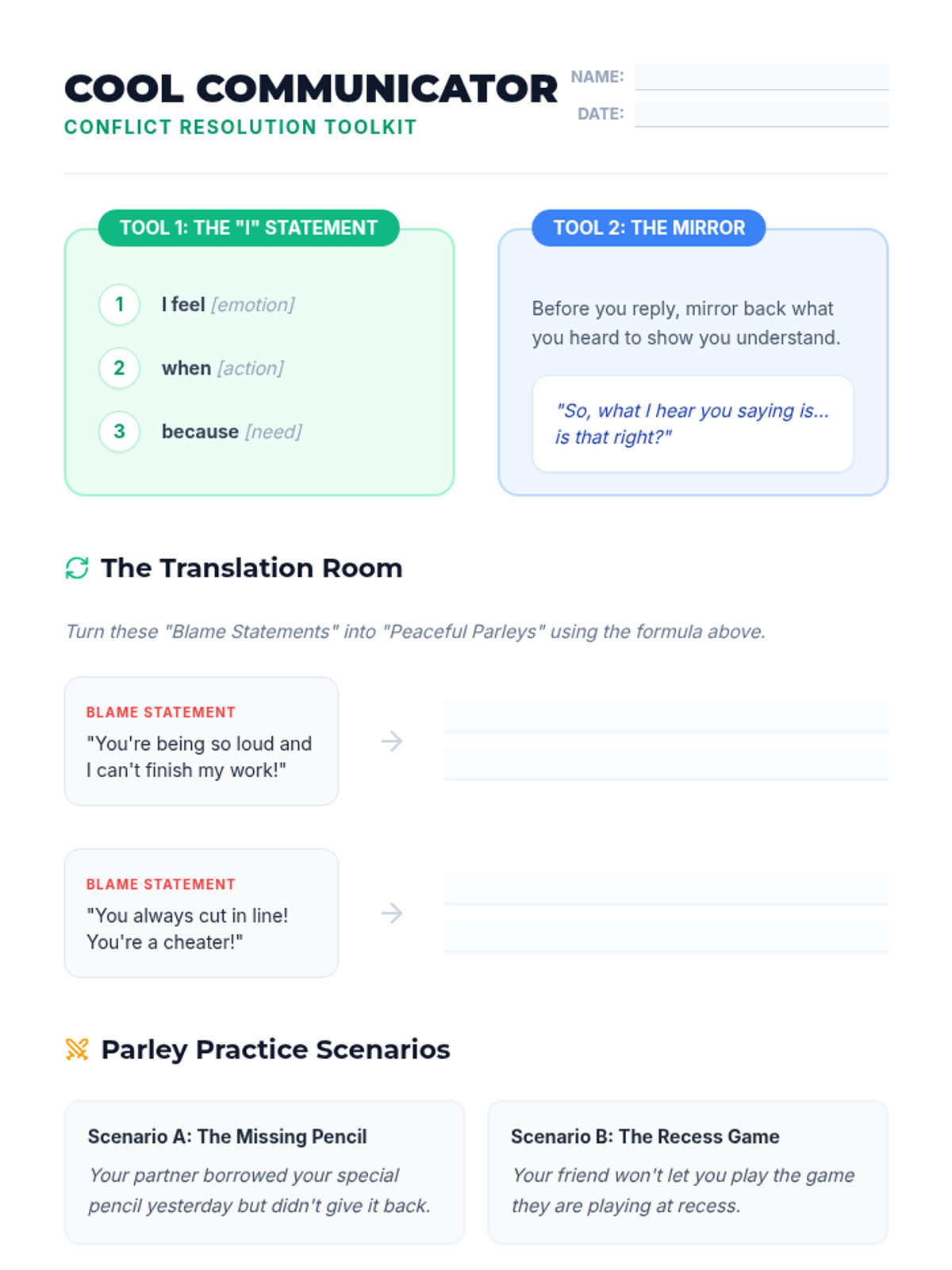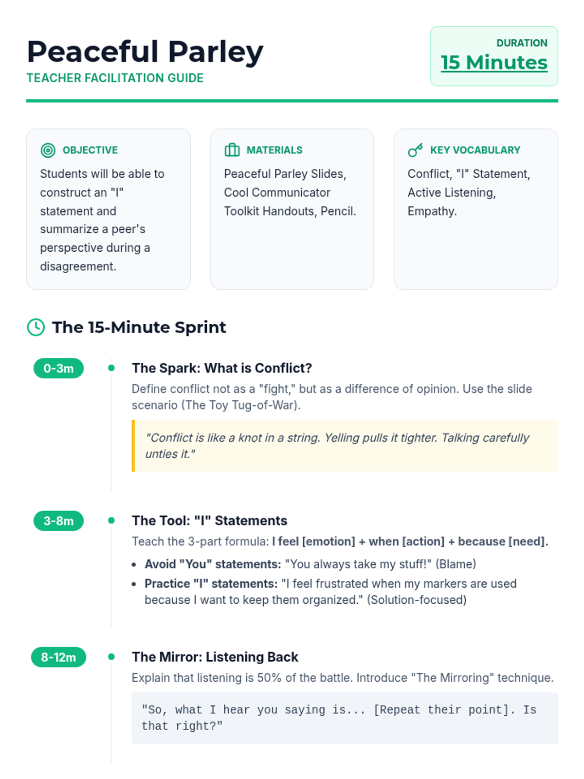A high-impact, 15-minute lesson designed to teach students the core skills of conflict resolution: using 'I' statements and active listening to navigate disagreements peacefully.