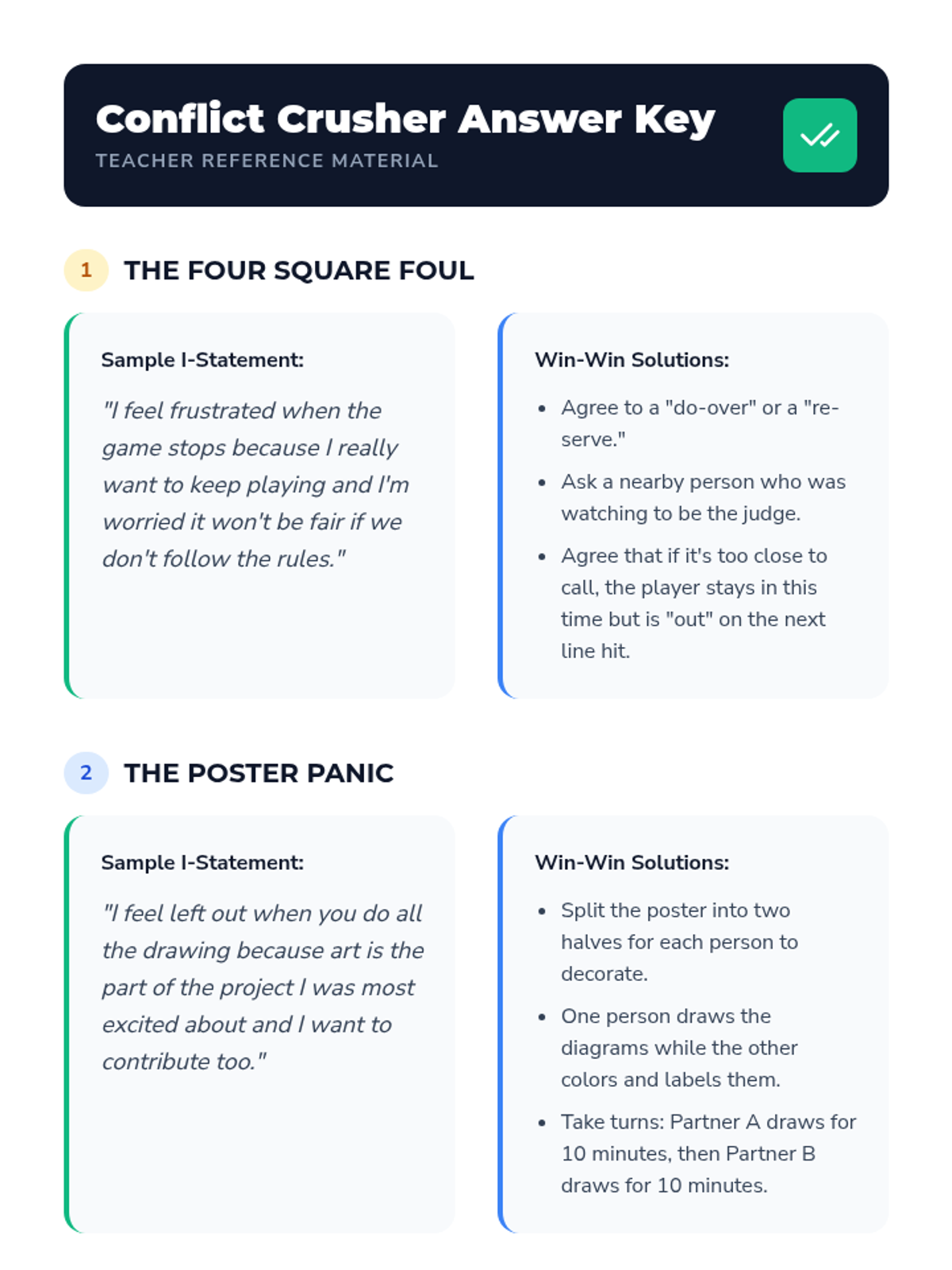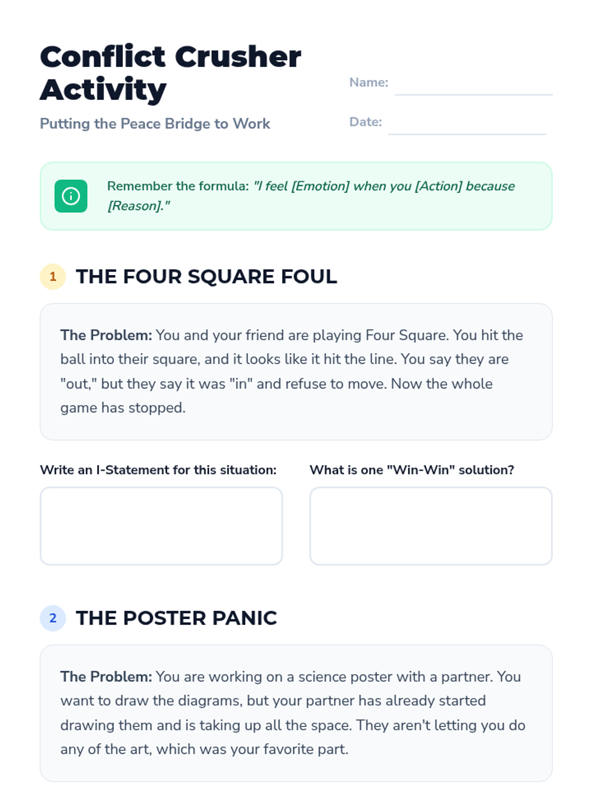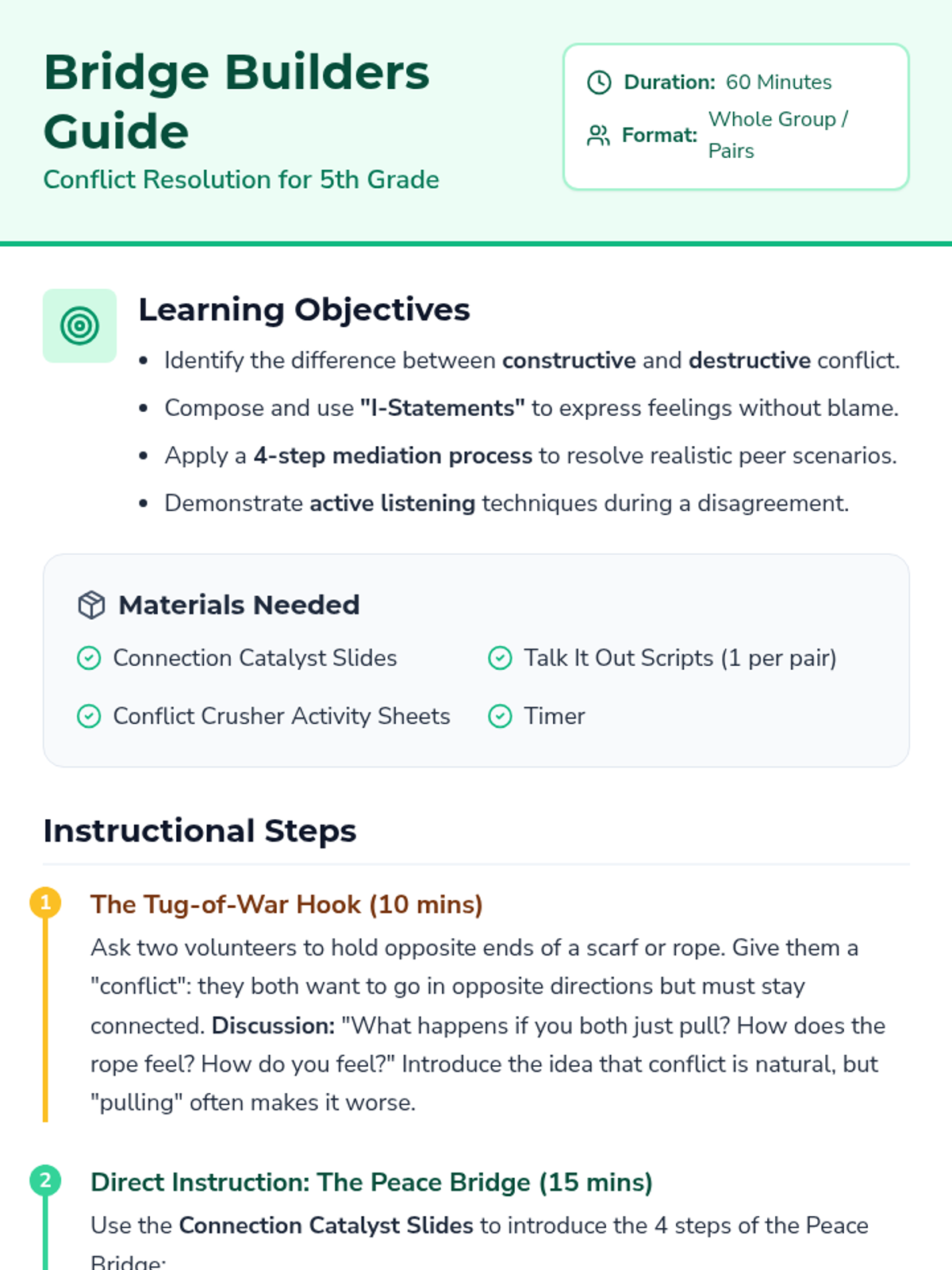 A comprehensive 5th-grade lesson on conflict resolution using the 'Peace Bridge' model, focusing on I-statements, active listening, and collaborative problem-solving.