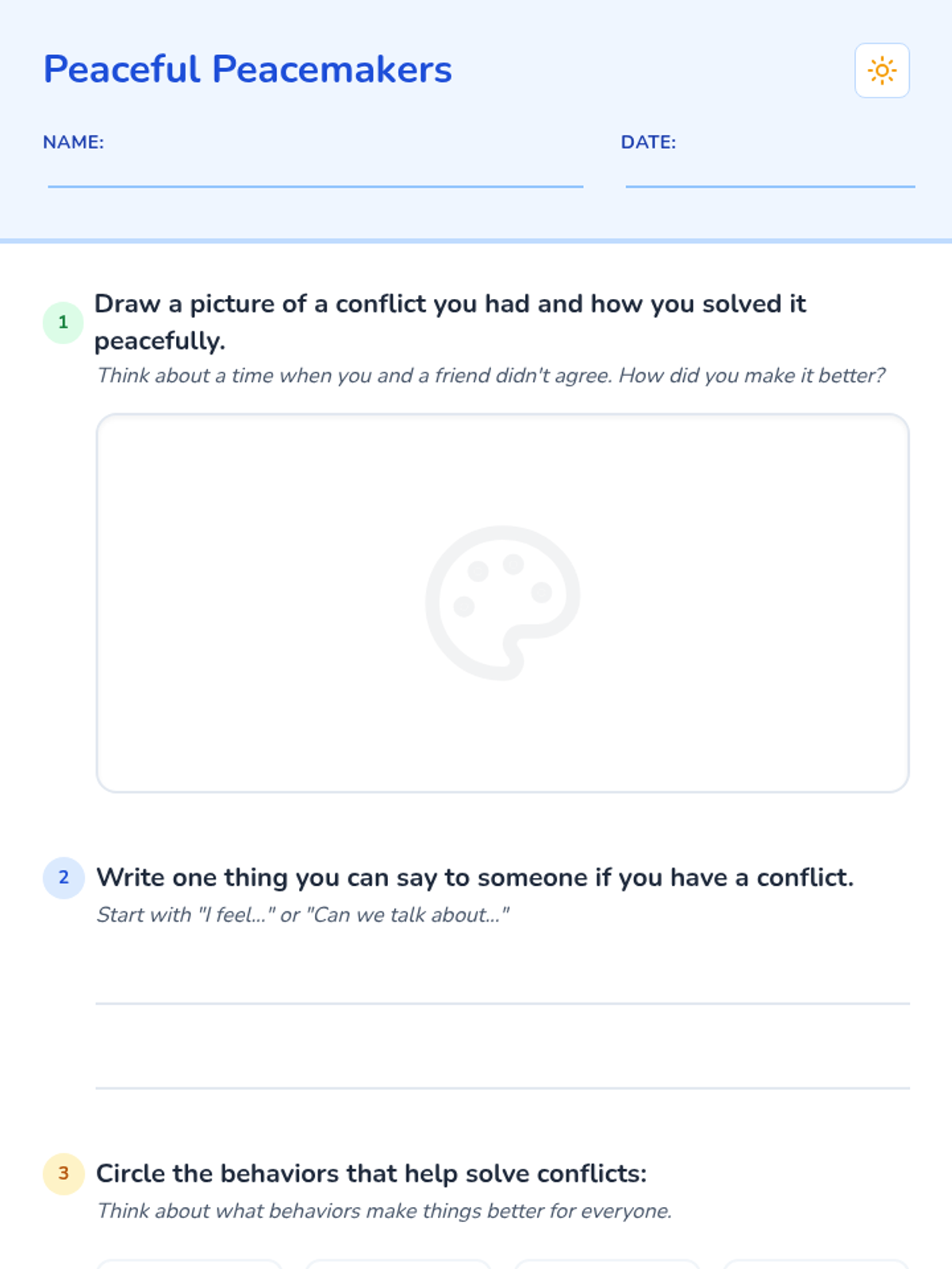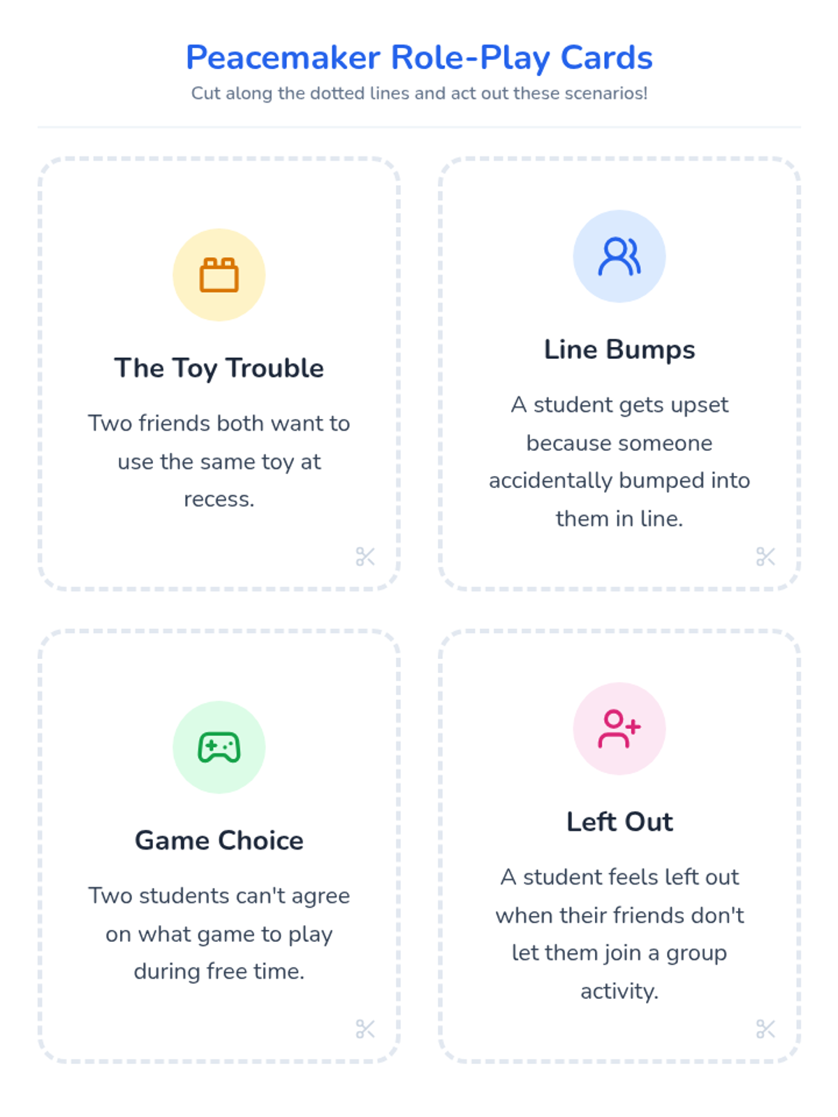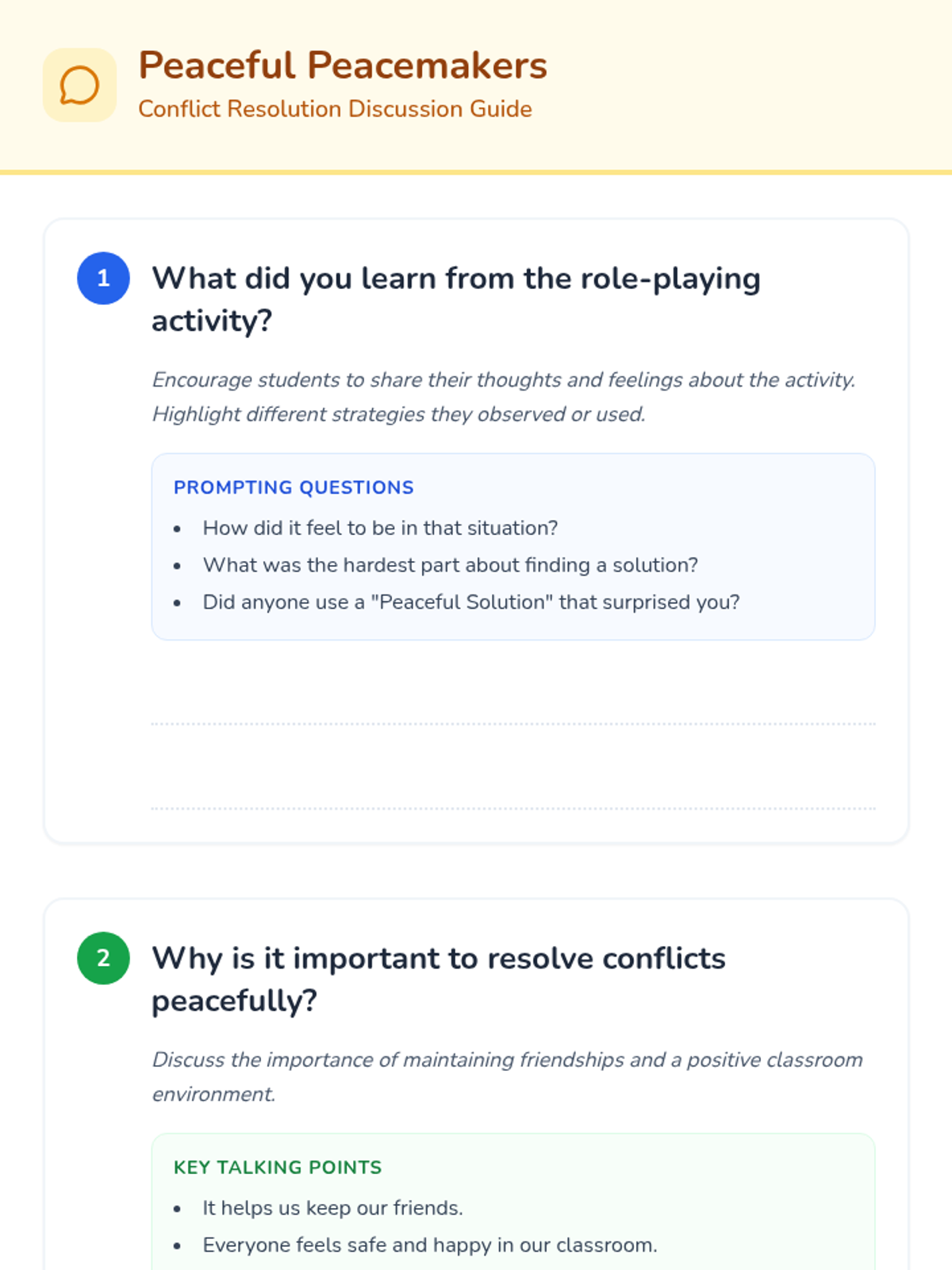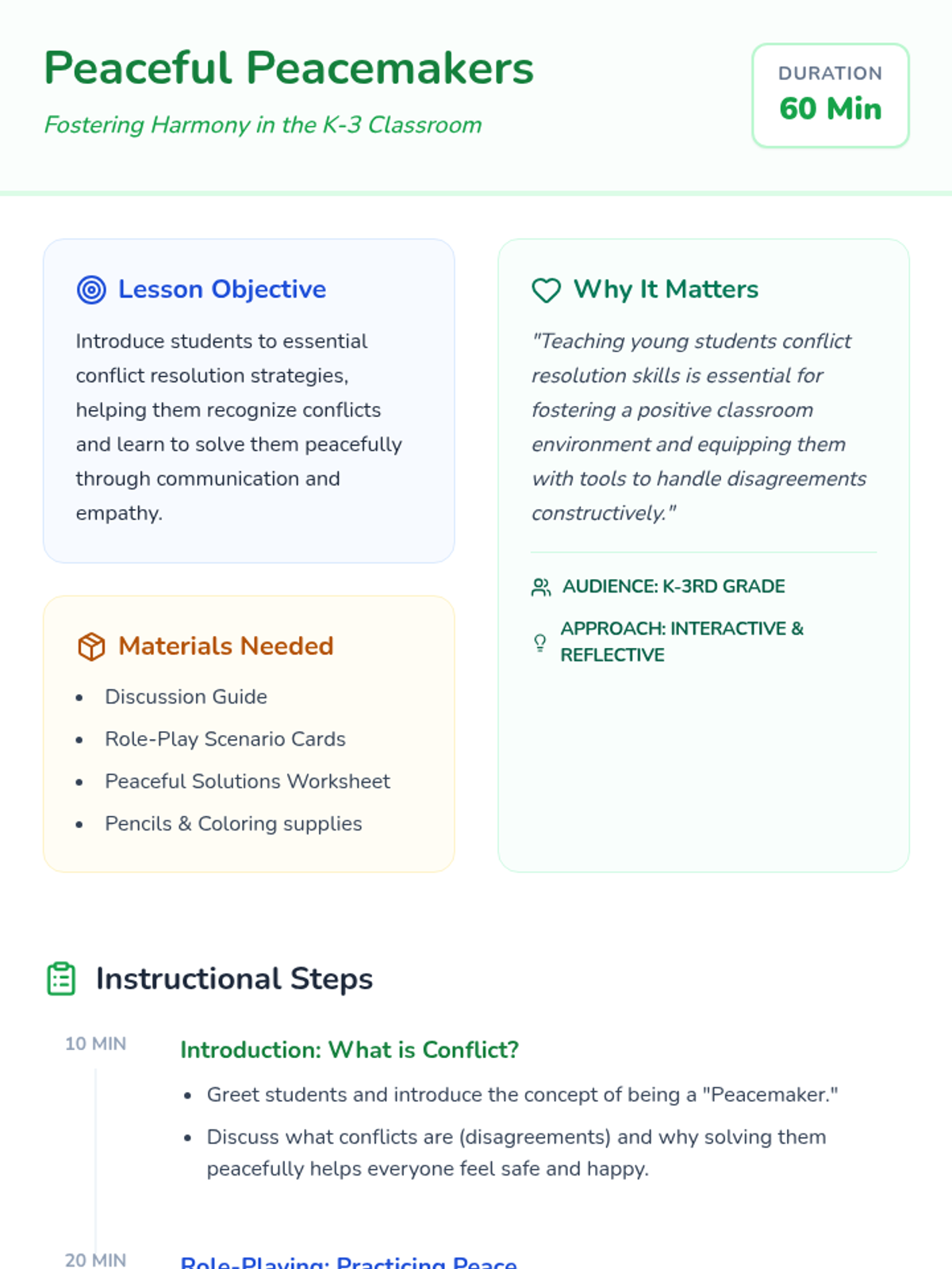 A lesson for K-3 students focused on learning and practicing conflict resolution strategies through discussion and role-play to foster a positive classroom environment.