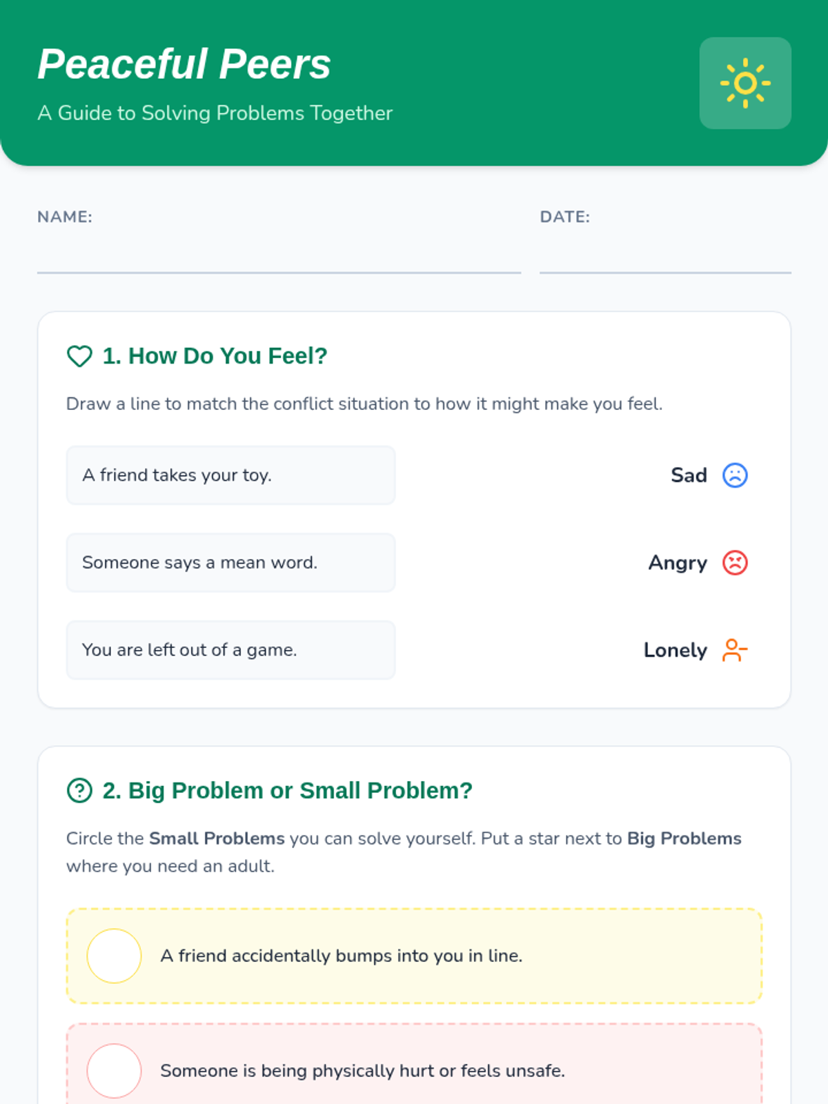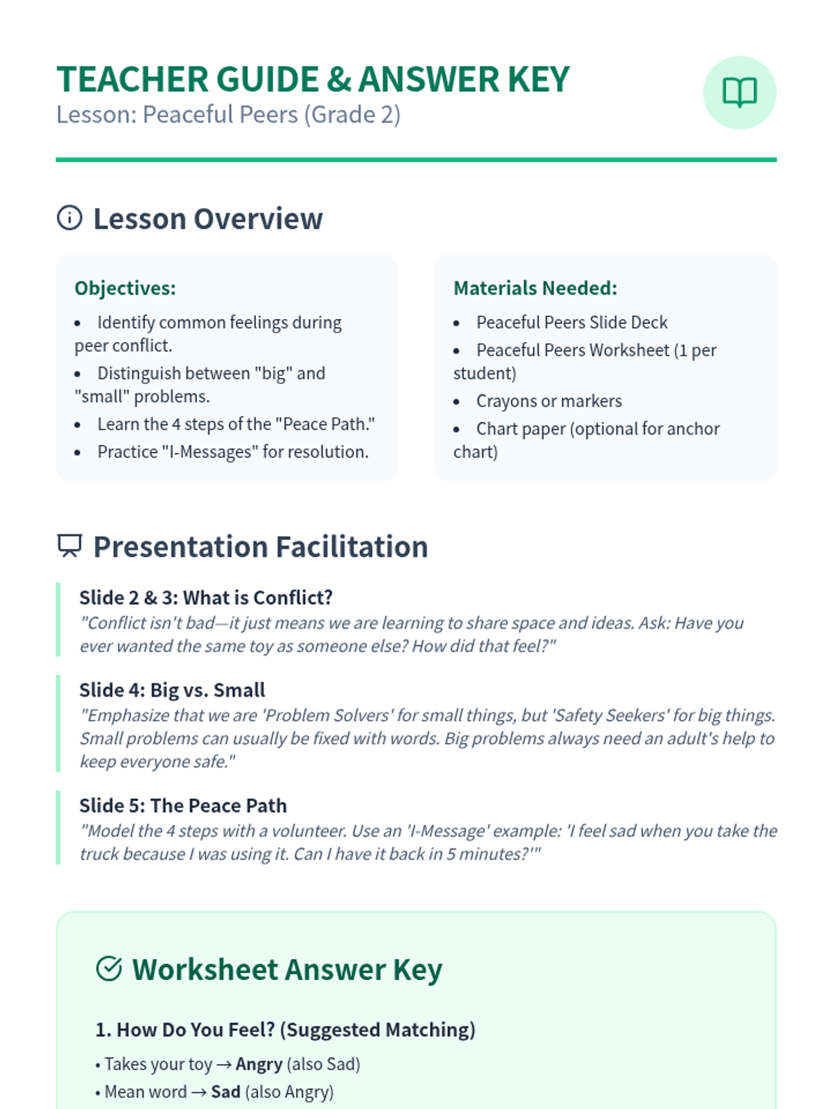 This lesson helps 2nd grade students understand peer conflict, identify their feelings, and learn practical strategies for peaceful resolution. Students will practice distinguishing between big and small problems and know when to seek adult help.