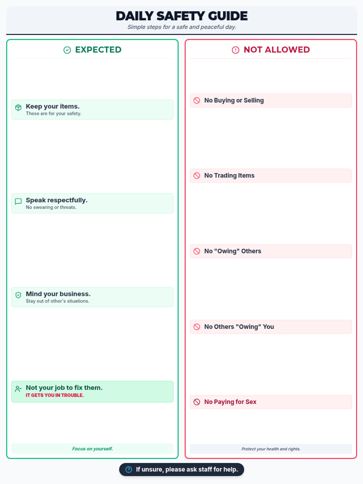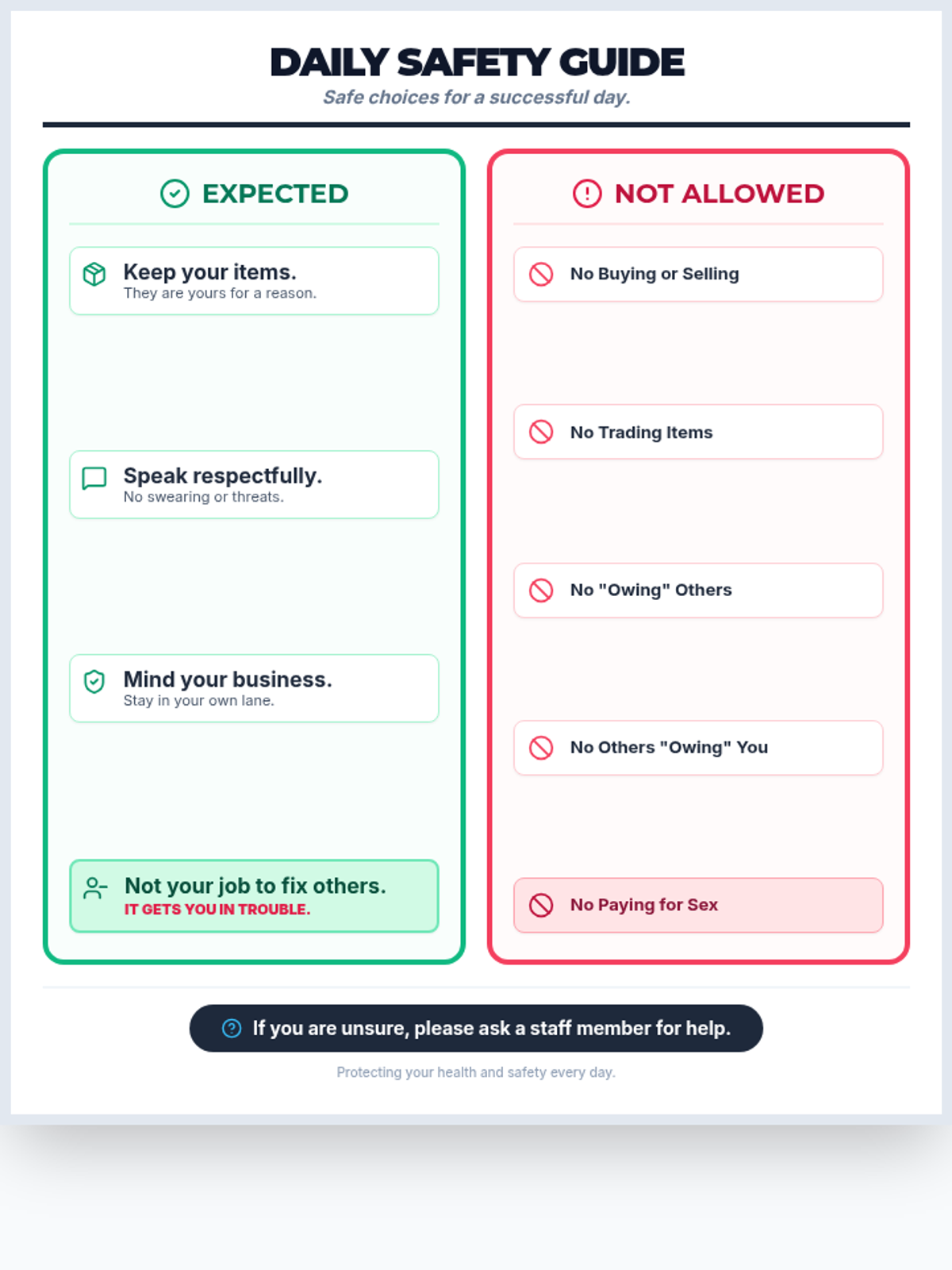 Teaches the importance of respectful speech, avoiding threats or swearing, and understanding how tone affects social safety and success.