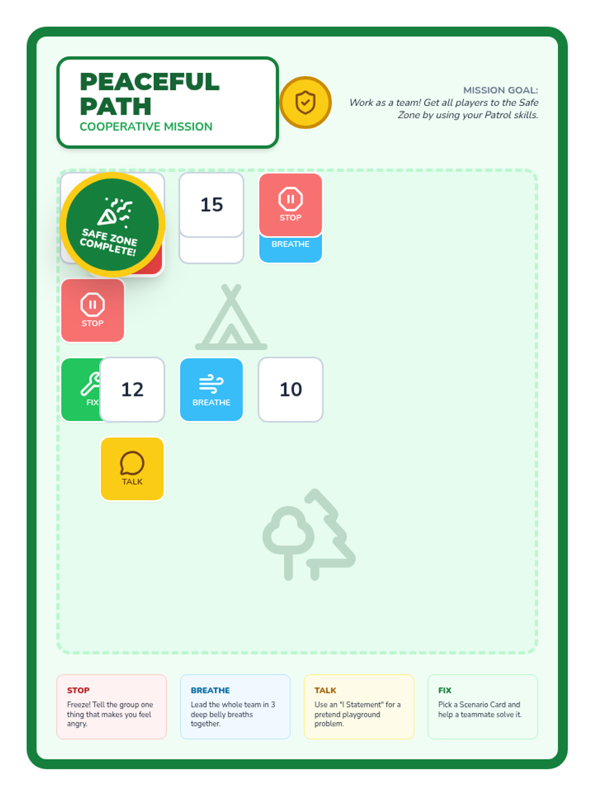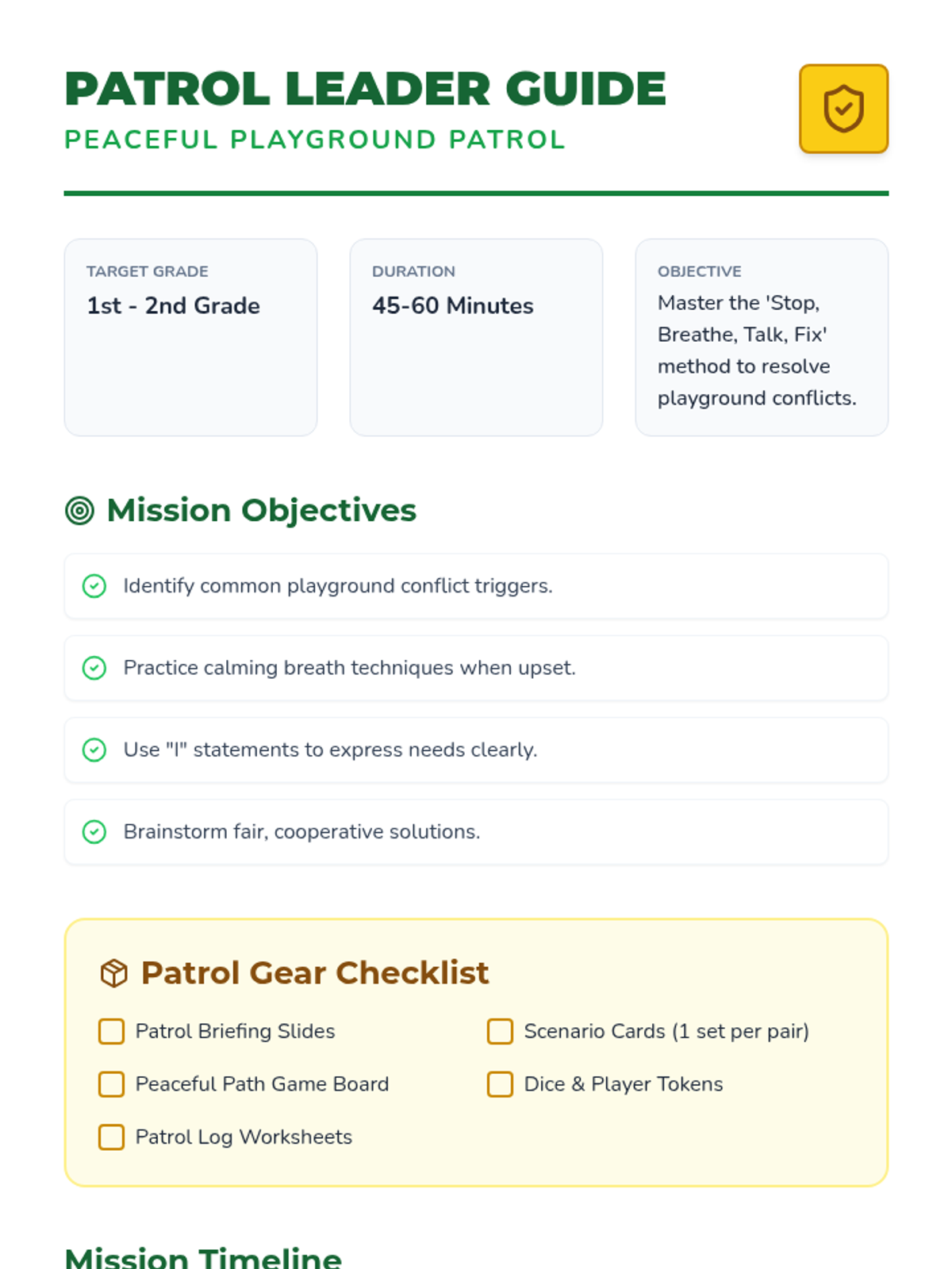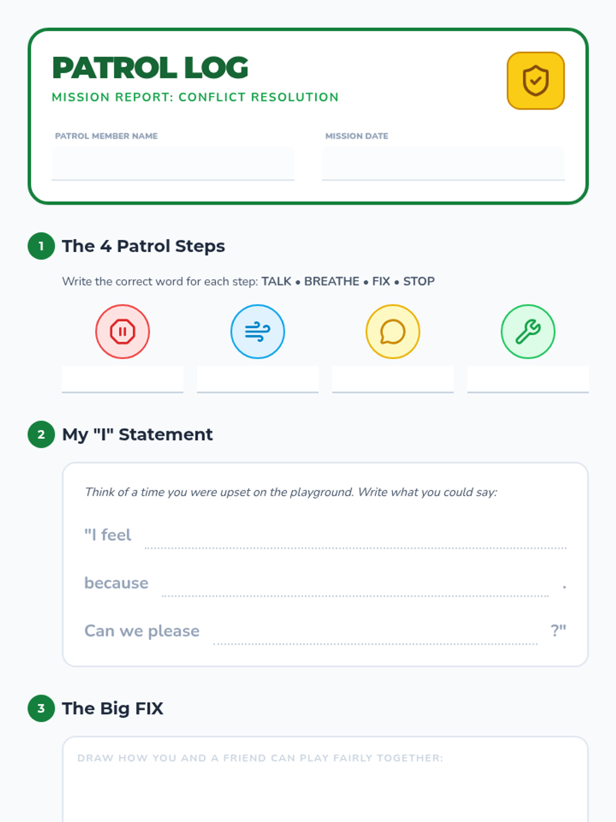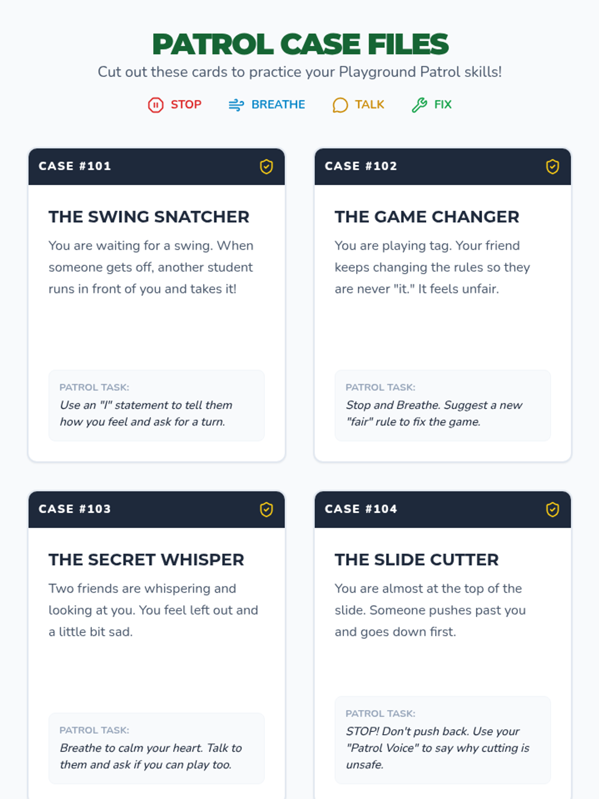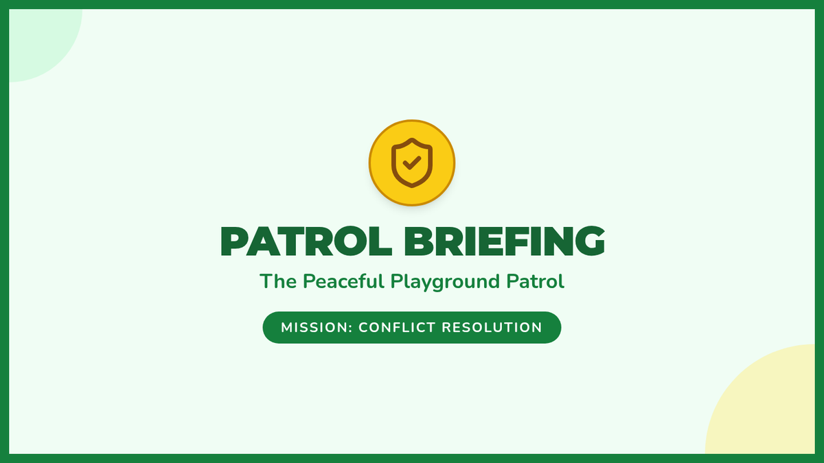 A social-emotional learning lesson for young students to master conflict resolution on the playground using the 'Stop, Breathe, Talk, Fix' method. Through interactive slides, role-play scenario cards, and a cooperative board game, students learn to express needs calmly and find fair solutions.