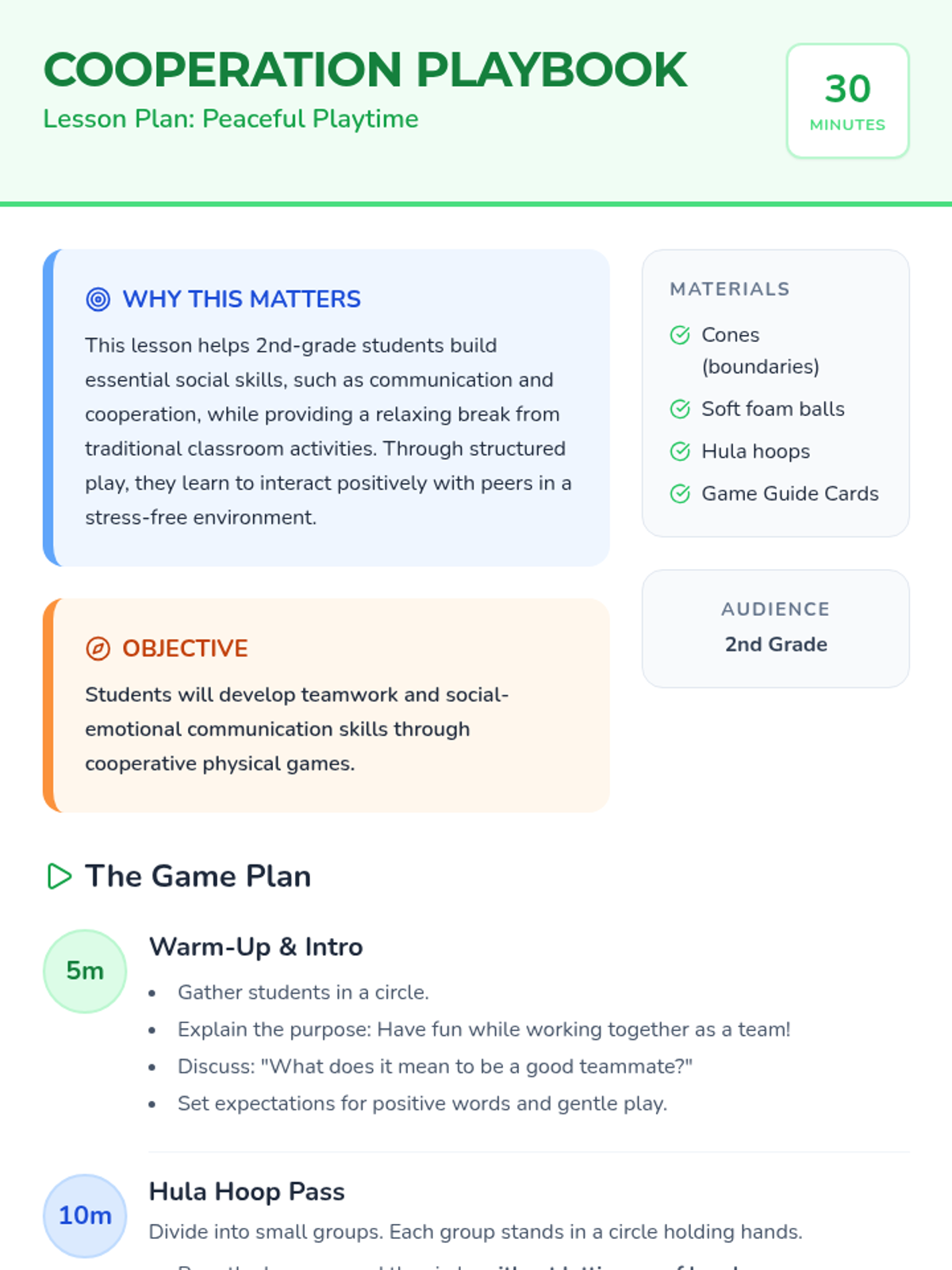 This lesson engages 2nd-grade students in cooperative games that emphasize fun, teamwork, and relaxation, building essential social skills in a stress-free environment.