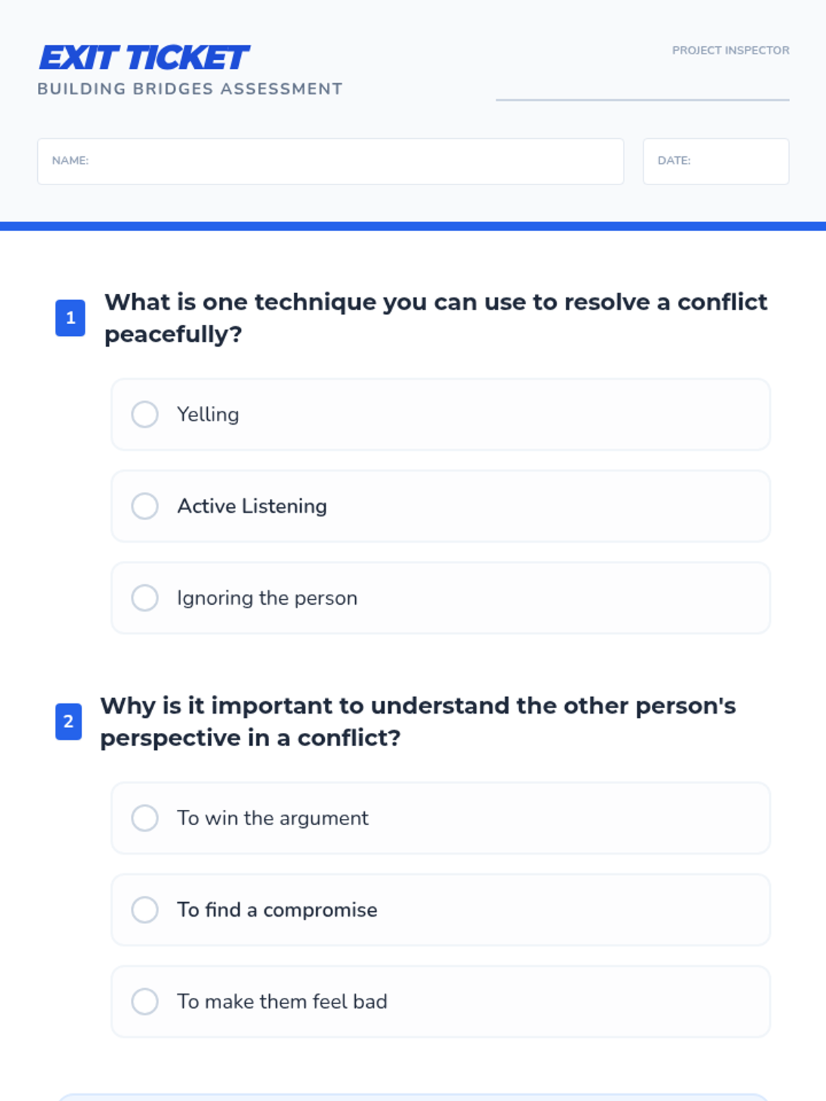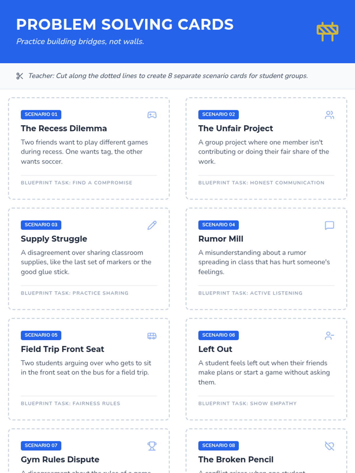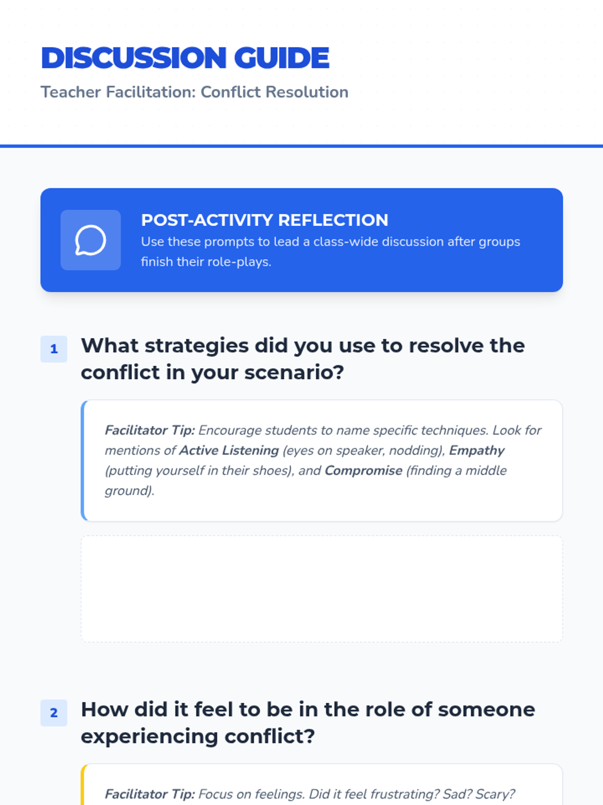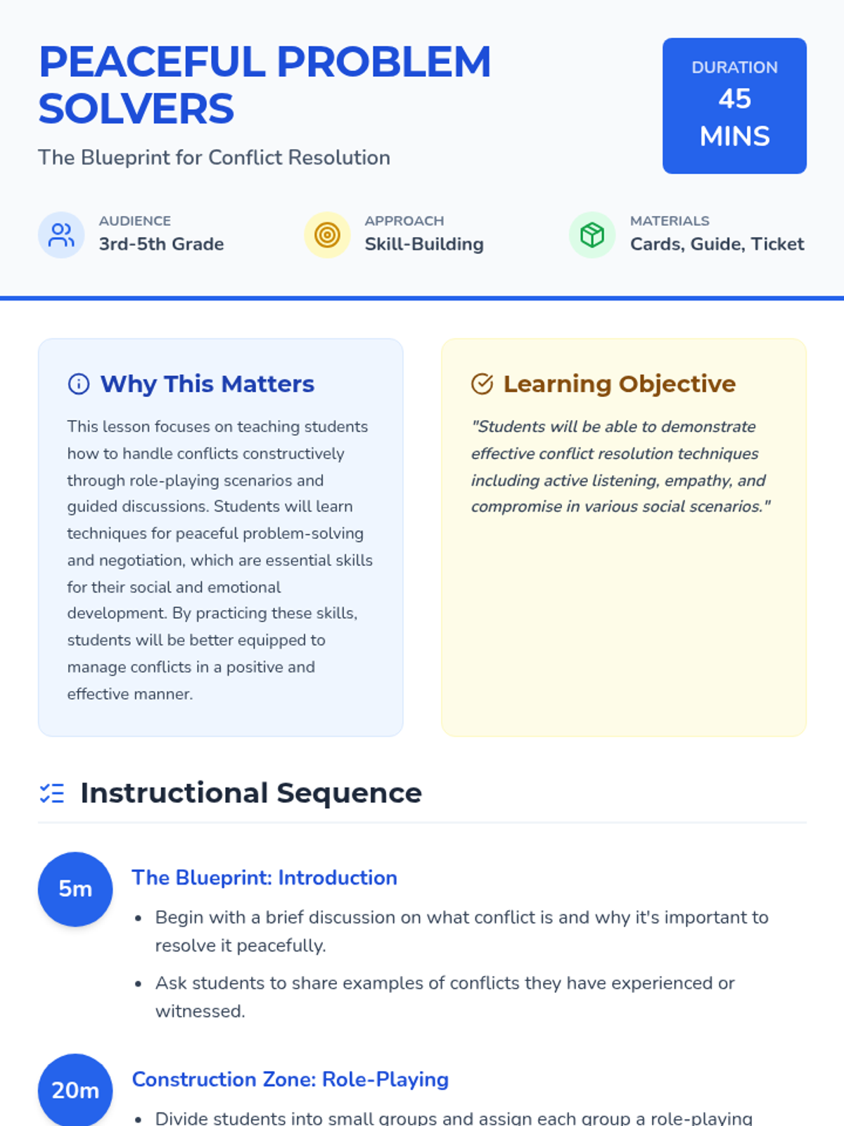 This lesson teaches 3rd-5th grade students how to handle conflicts constructively through role-playing and guided discussions, focusing on empathy, active listening, and compromise.