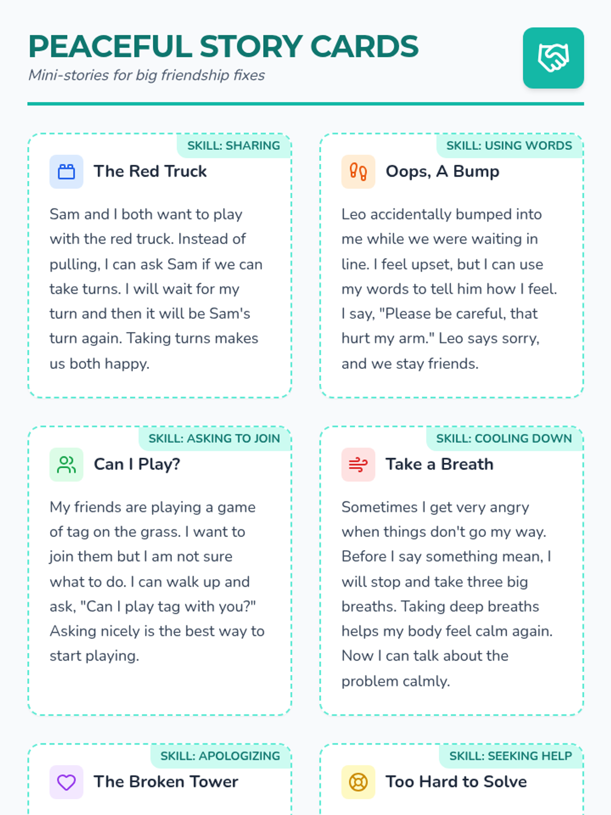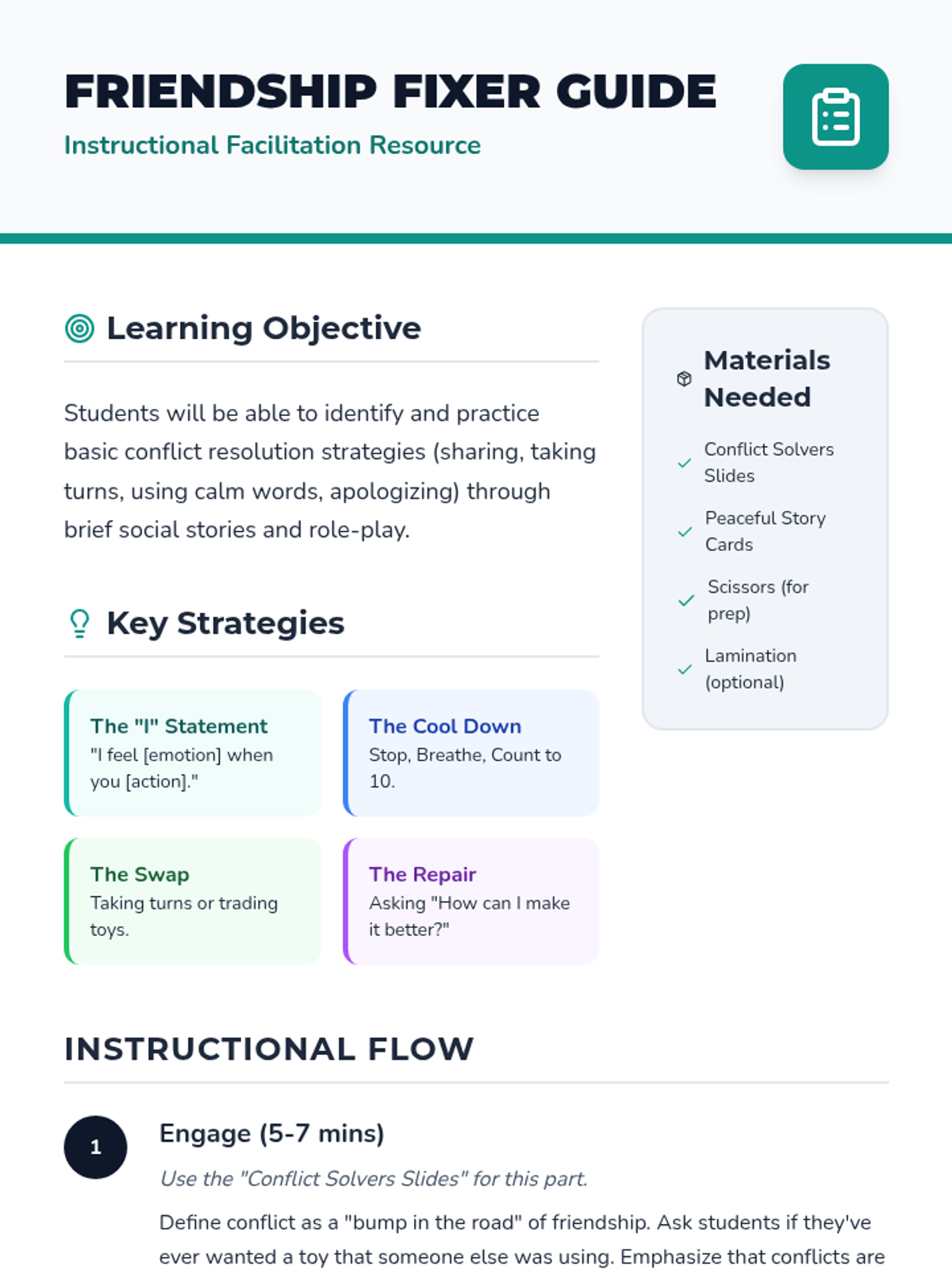 This lesson introduces young learners to simple strategies for resolving peer conflicts through brief, actionable social stories and guided discussion.