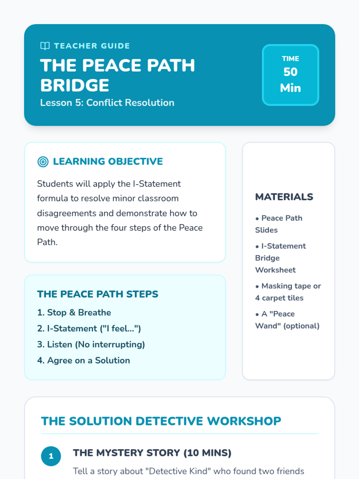 Students are introduced to the 'I-Statement' formula and a 'Peace Path' to resolve minor playground and classroom disagreements.