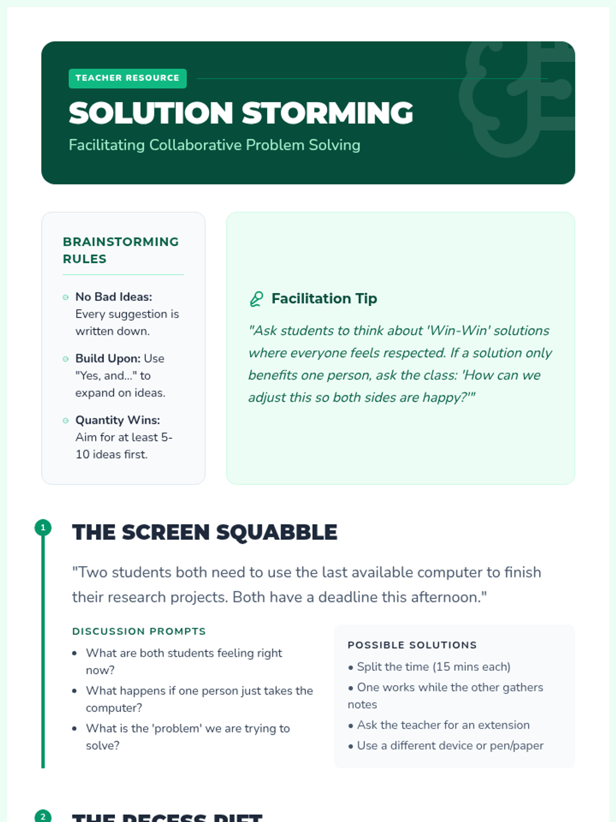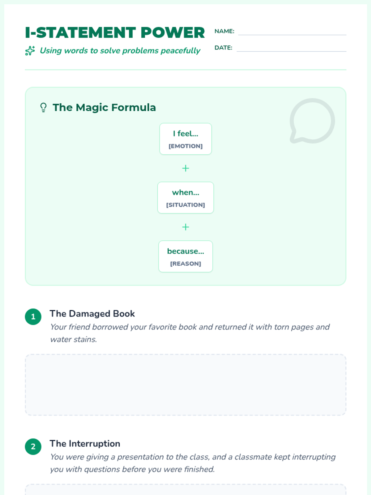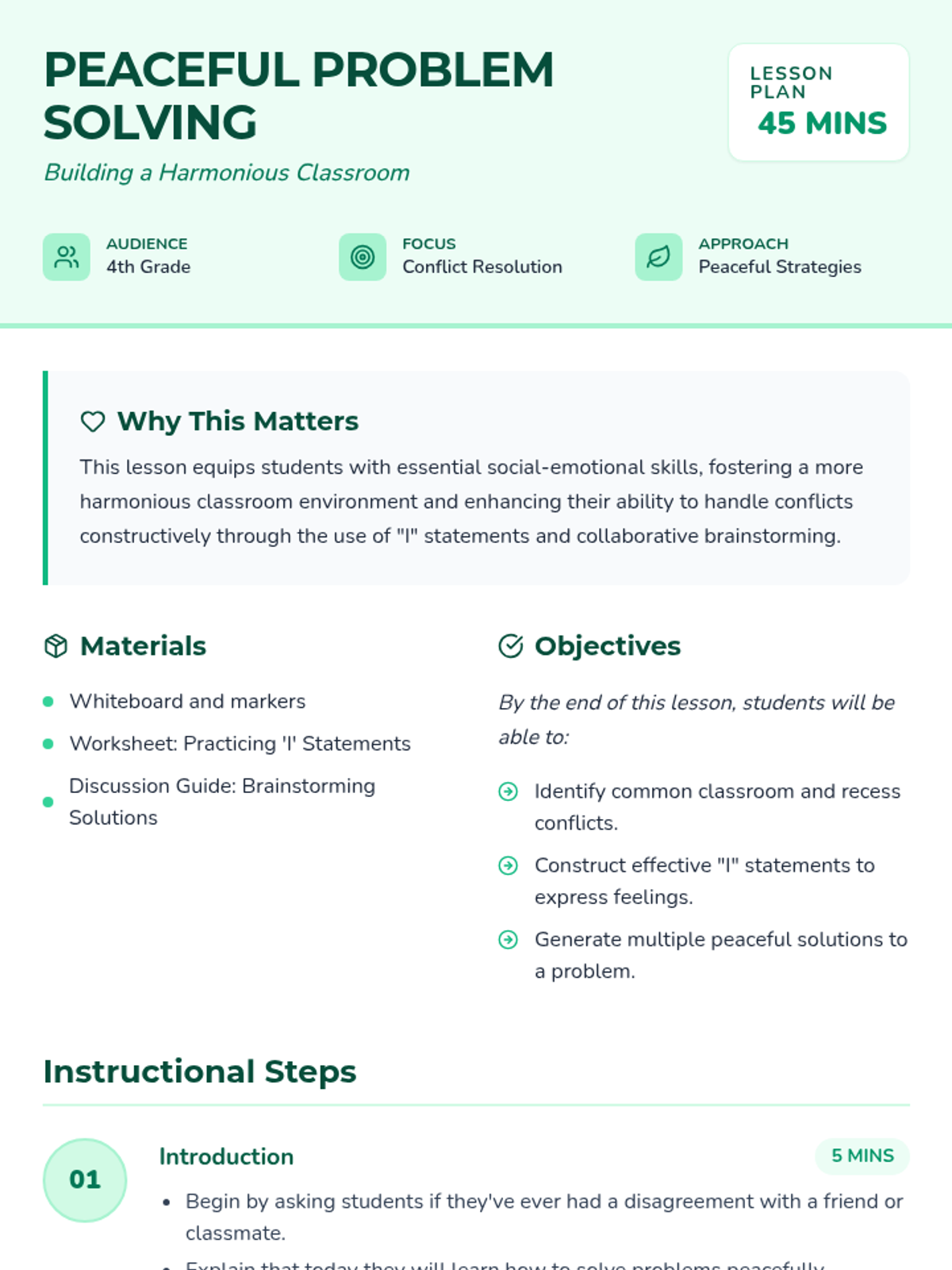 This lesson introduces 4th-grade students to peaceful problem-solving techniques, focusing on 'I' statements and collaborative brainstorming.