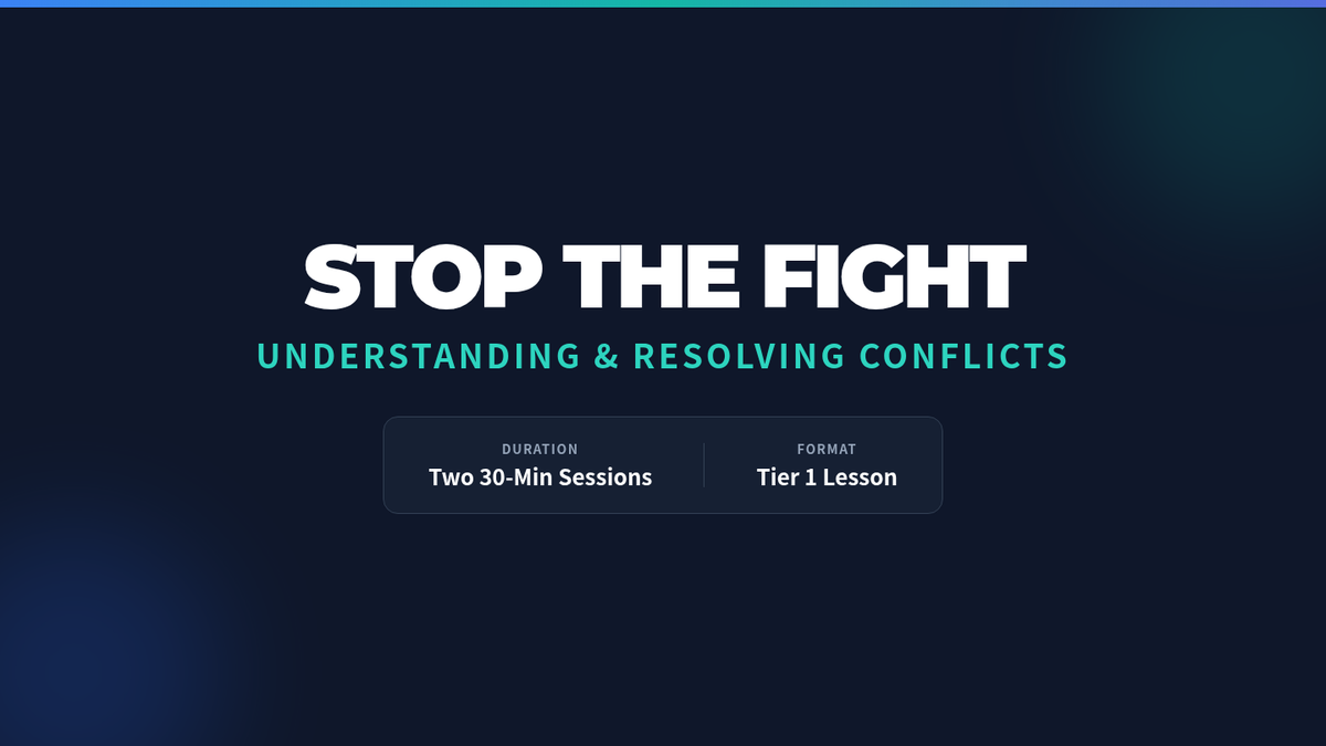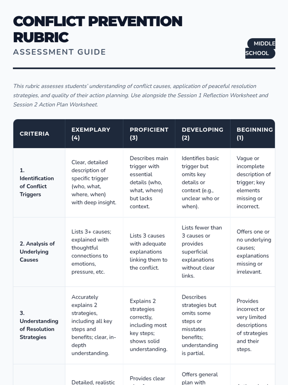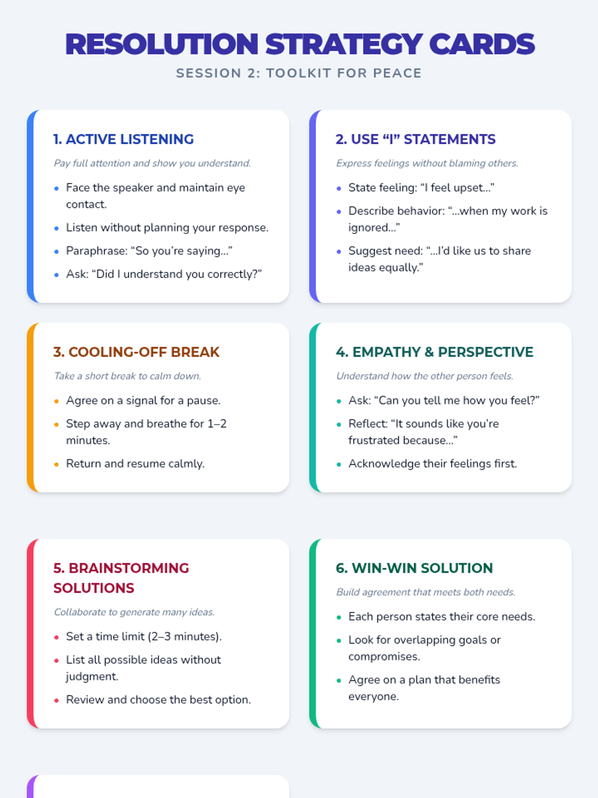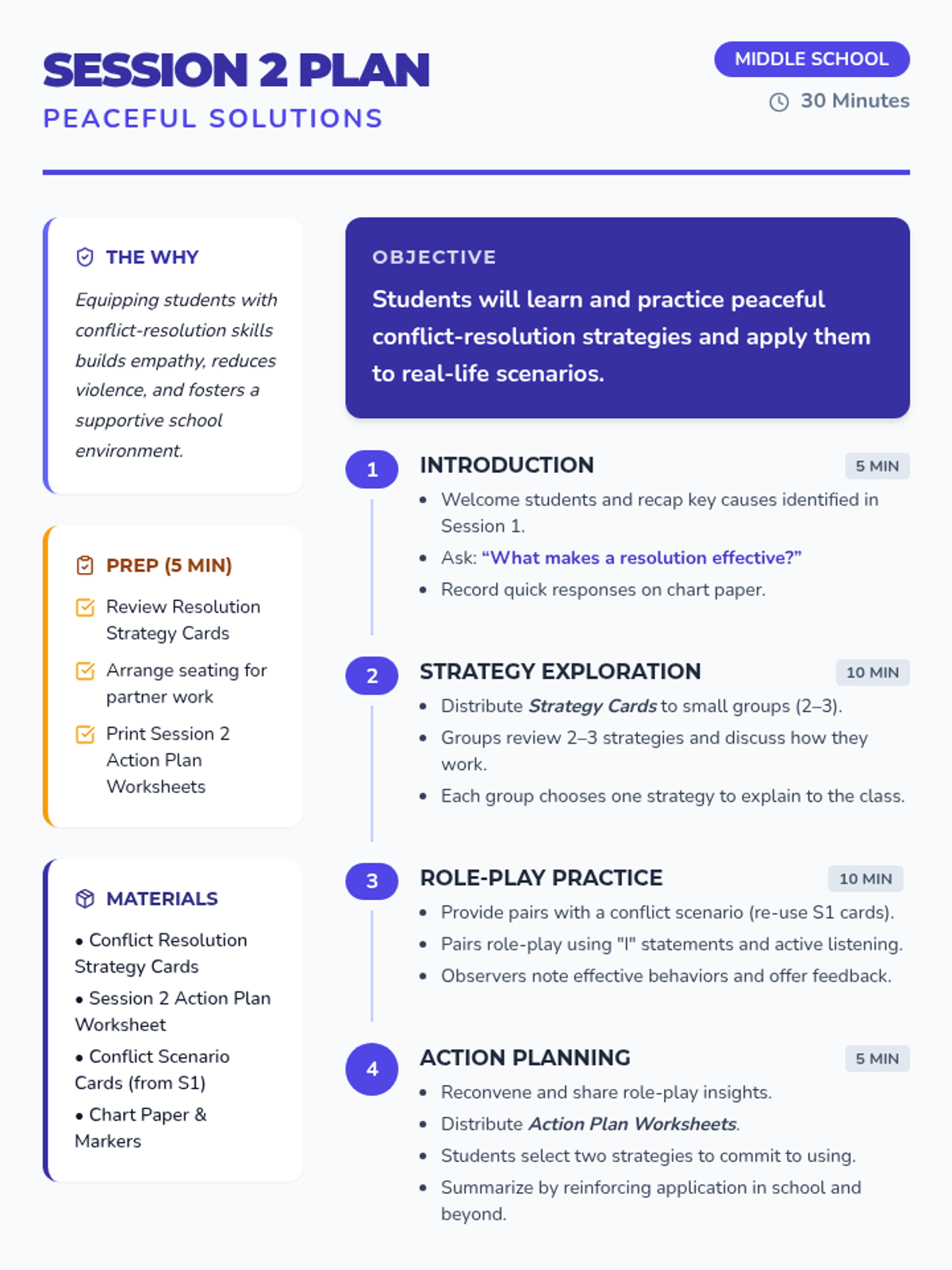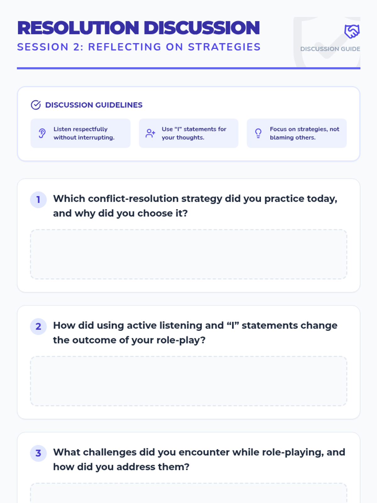 Students learn and practice practical conflict-resolution strategies through role-play and create personalized action plans for real-world application.