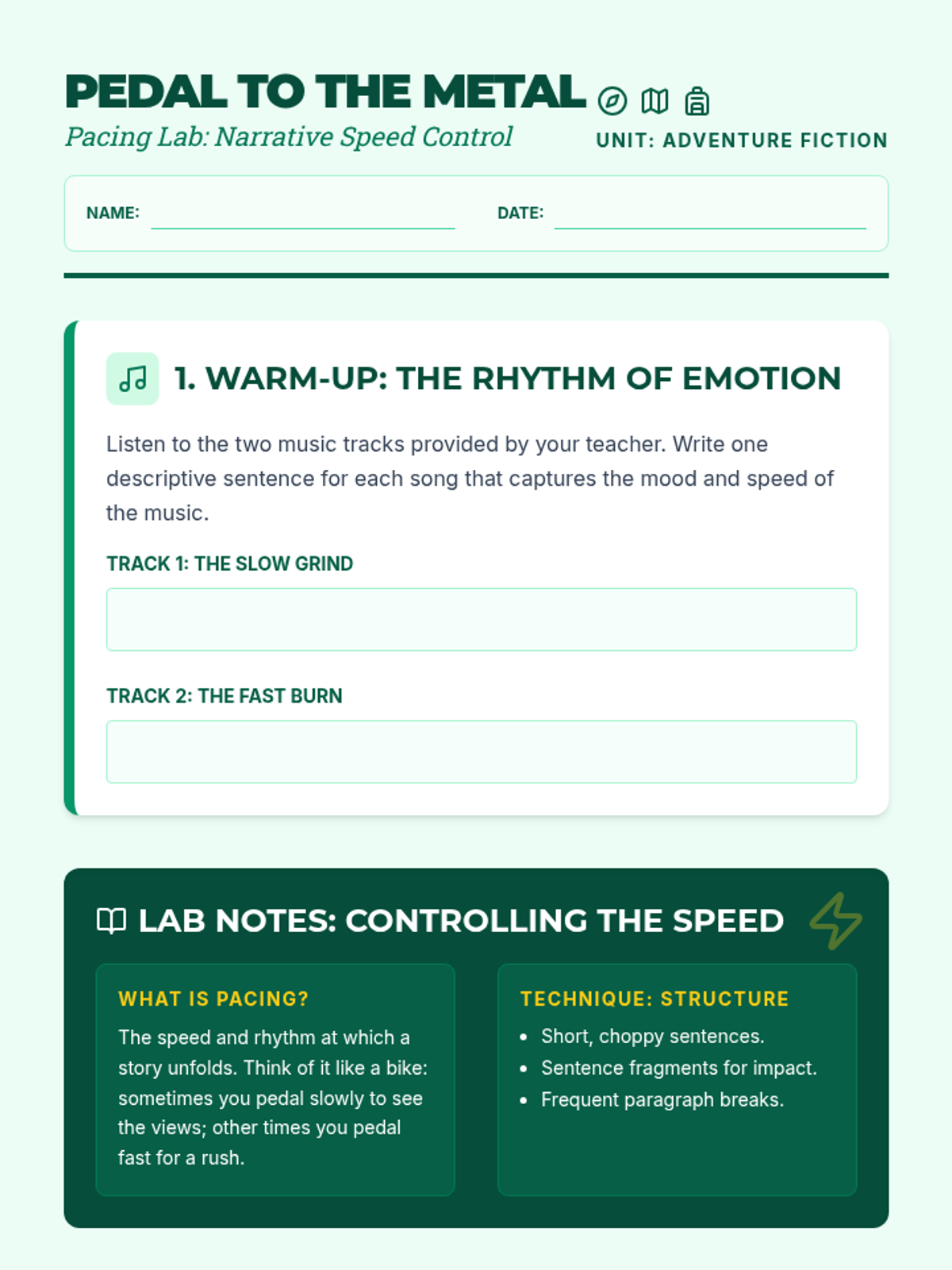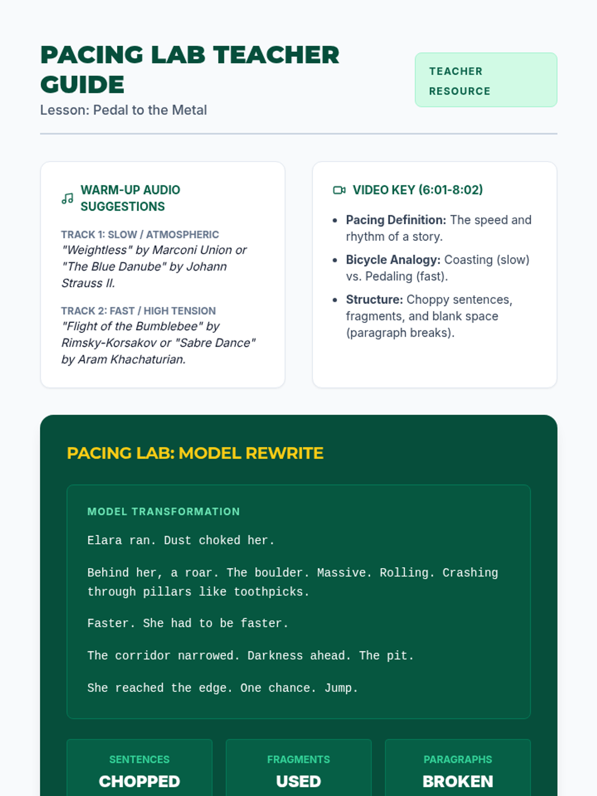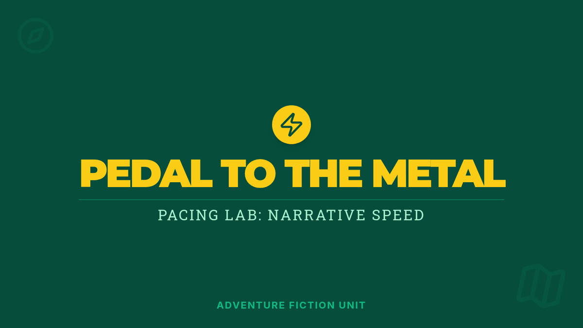 In this middle school ELA lesson, students investigate the mechanics of narrative pacing through a 'Pacing Lab.' Using a provided adventure video as a guide, students transform a sluggishly written chase scene into a high-tension sequence by manipulating sentence structure, fragments, and paragraph breaks.