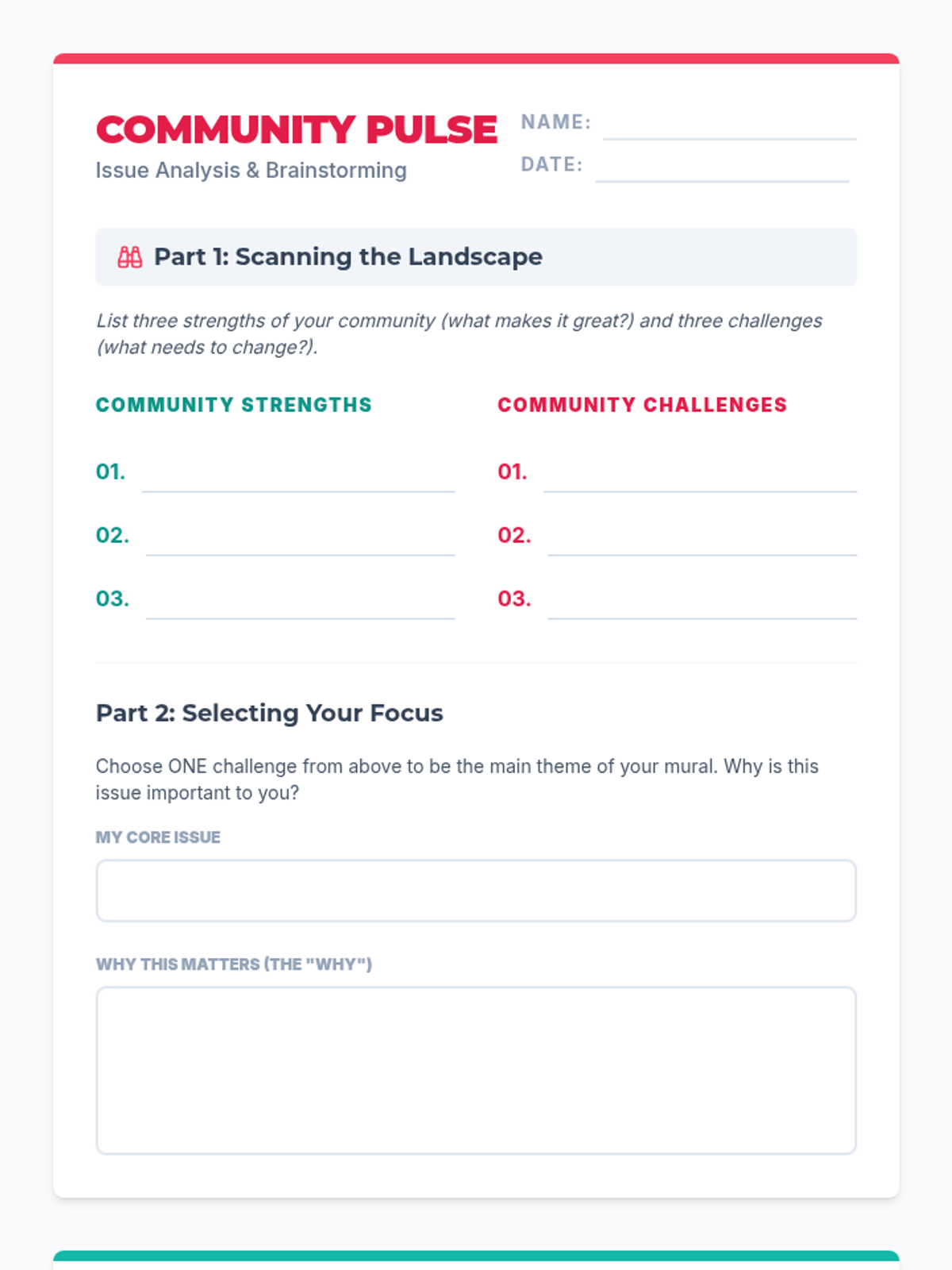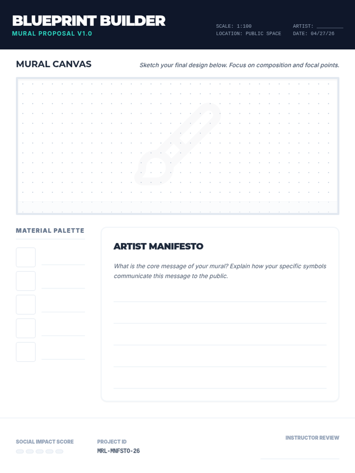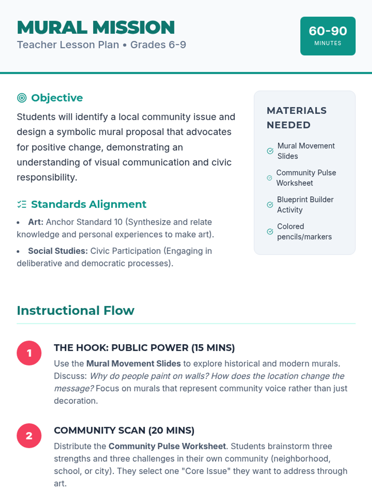 A project-based lesson where students investigate local social issues and translate their findings into a symbolic mural design. This lesson bridges the gap between civic engagement and visual arts through collaborative planning and creative expression.