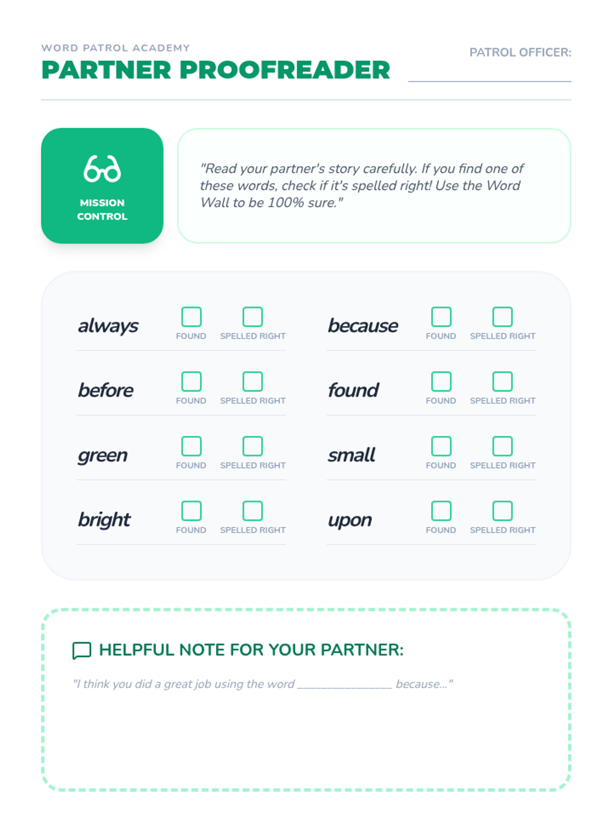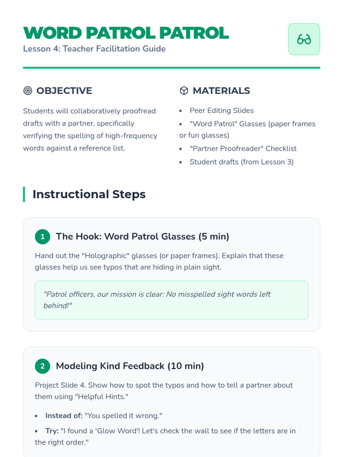 Students don 'holographic glasses' (fun frames) to become peer editors, specifically checking their partner's narrative for the correct spelling of high-frequency words using a checklist.