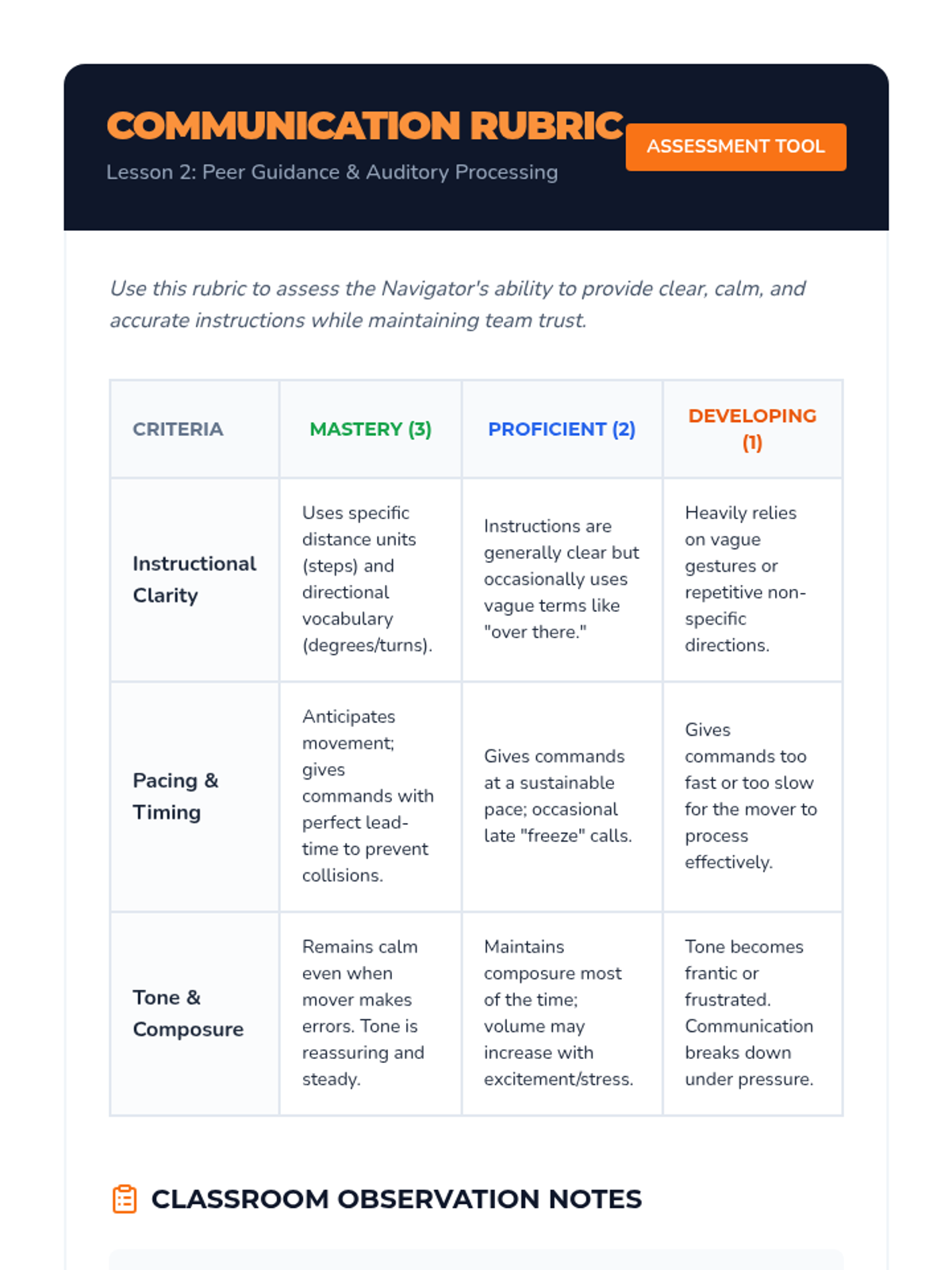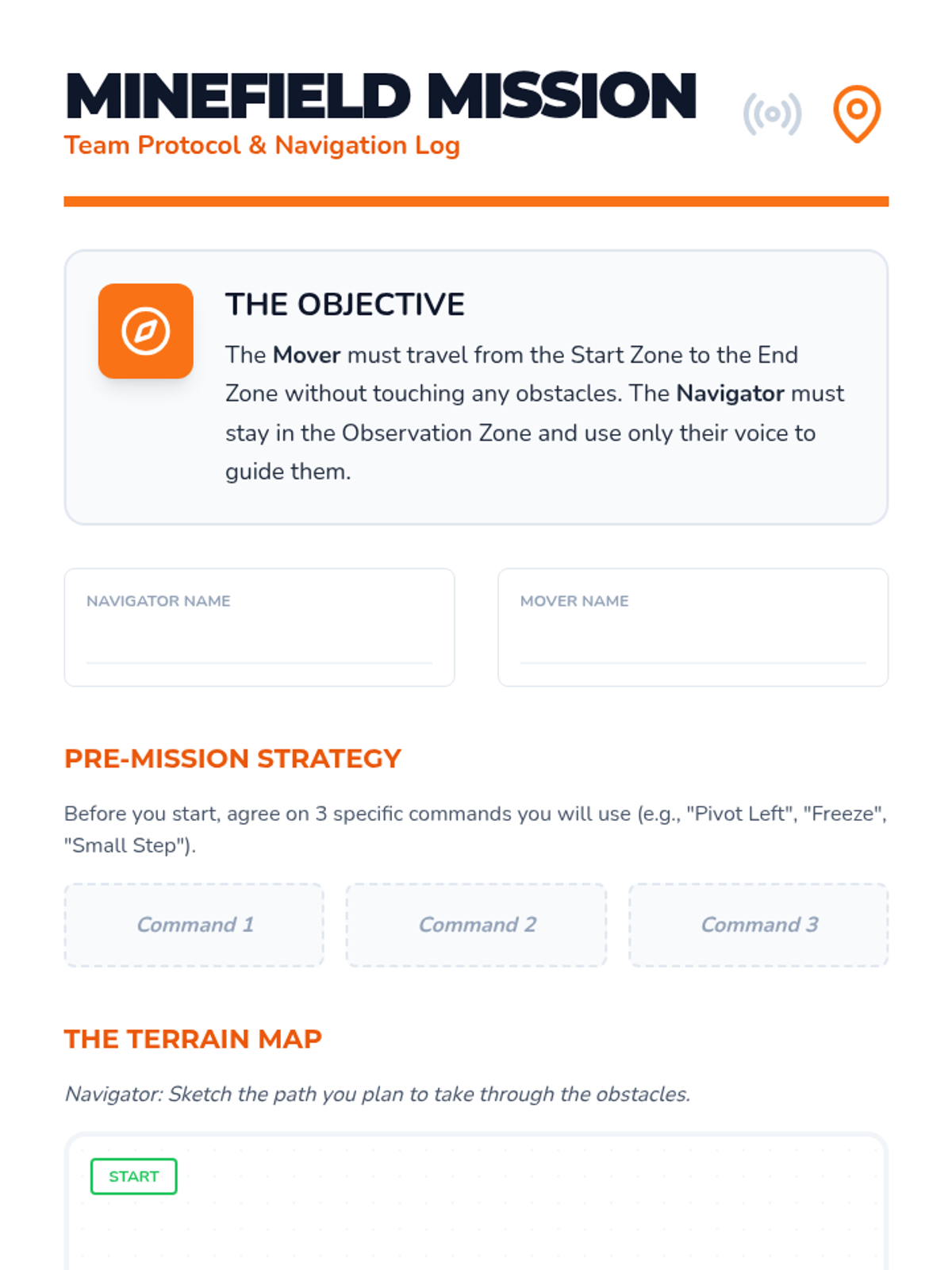 Pairs navigate a 'Minefield' where one student is blindfolded and the other offers verbal guidance, emphasizing clear communication and trust.