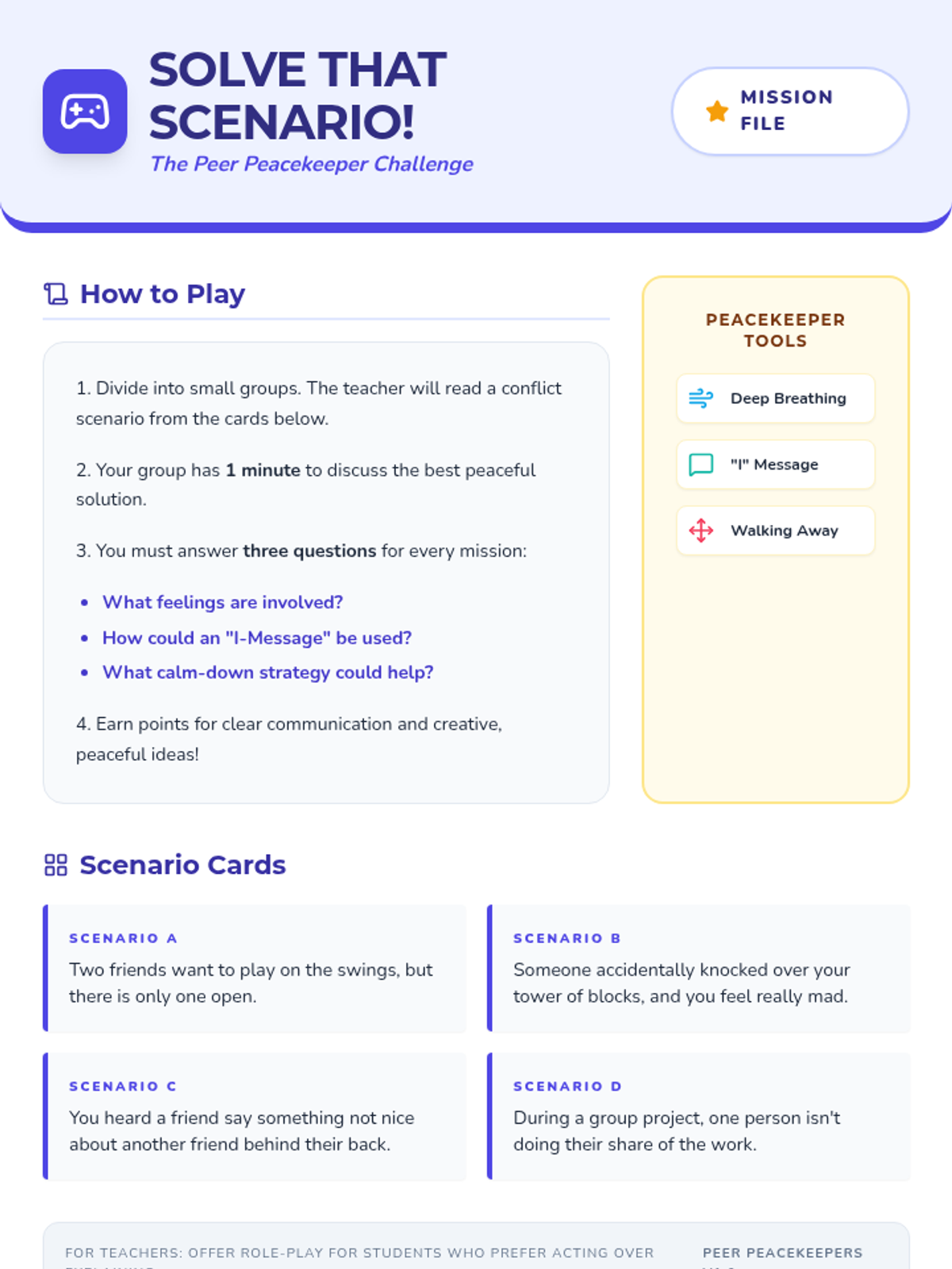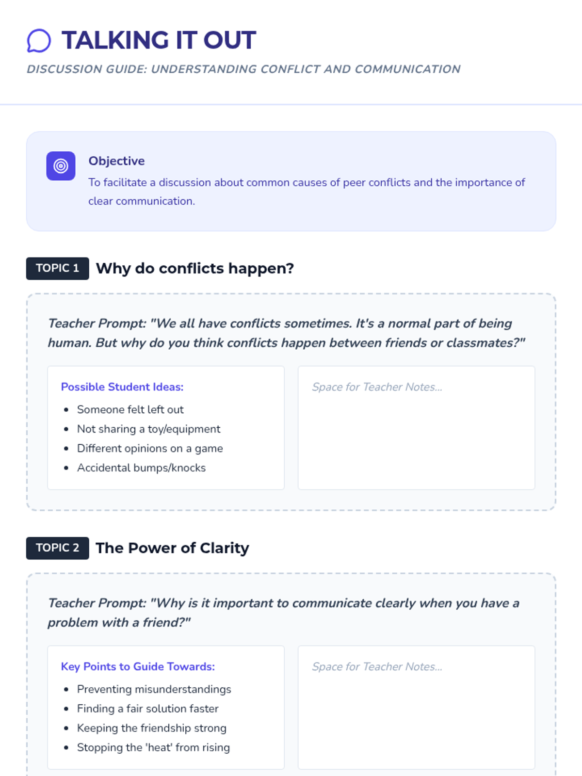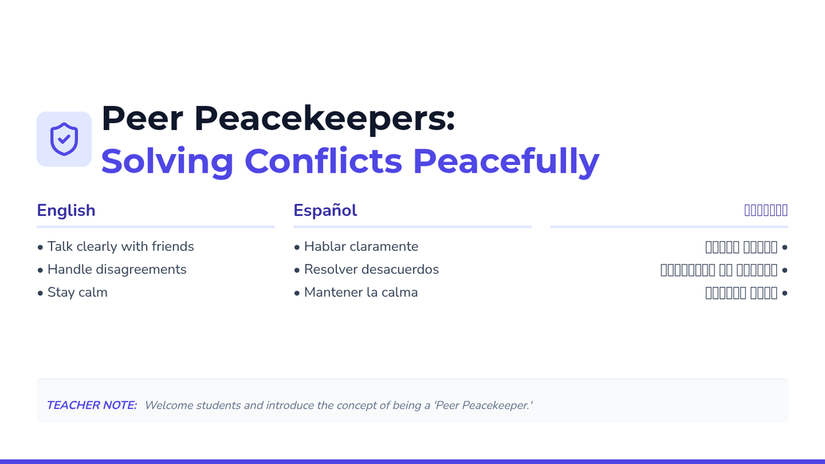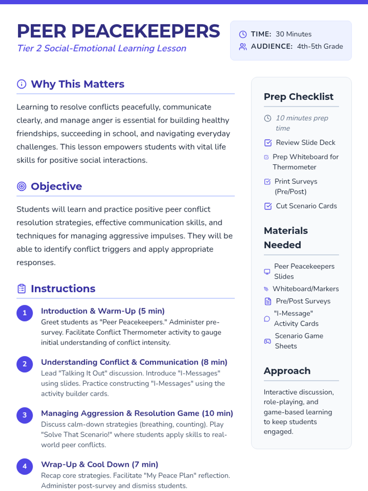 A 30-minute Tier 2 group lesson for 4th and 5th graders focused on developing conflict resolution skills, effective communication through 'I-Messages', and aggression management techniques. Students learn to navigate peer disagreements peacefully through interactive discussion and role-play.