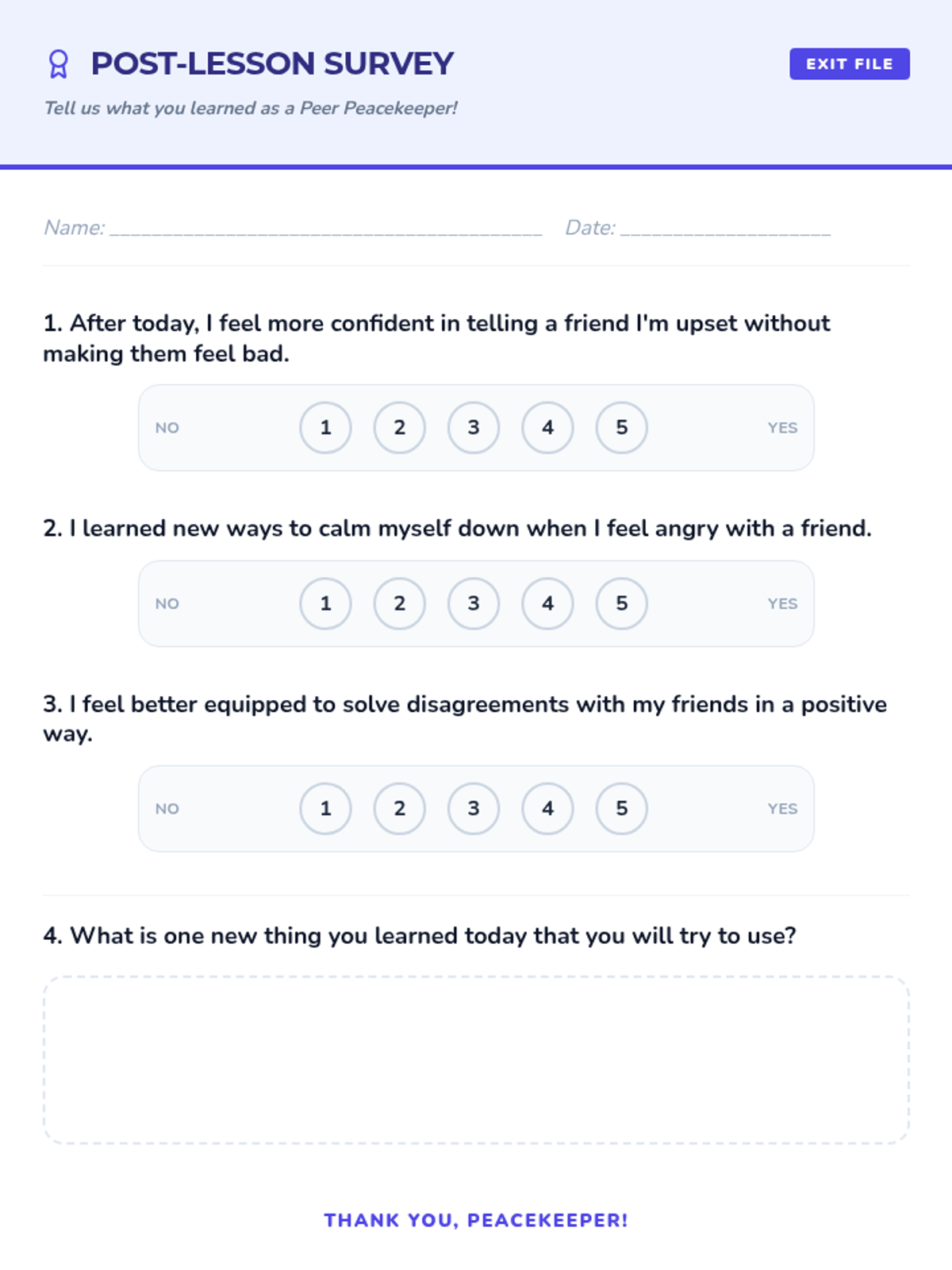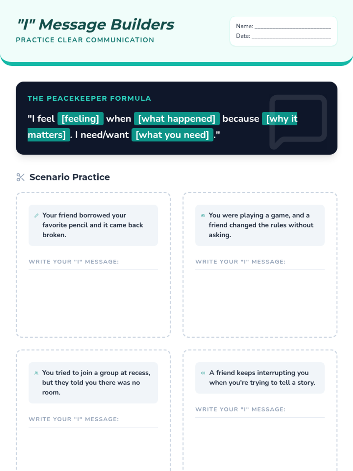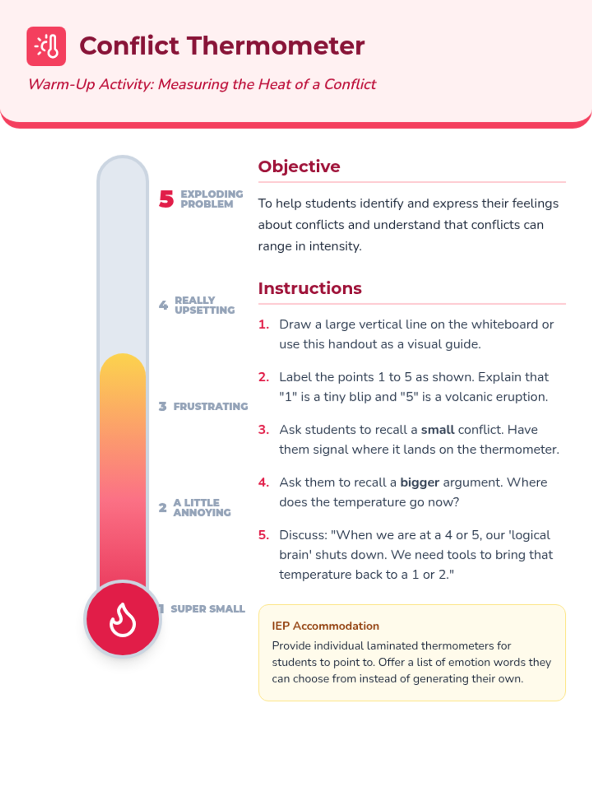 A 30-minute Tier 2 group lesson for 4th and 5th graders focused on developing conflict resolution skills, effective communication through 'I-Messages', and aggression management techniques. Students learn to navigate peer disagreements peacefully through interactive discussion and role-play.