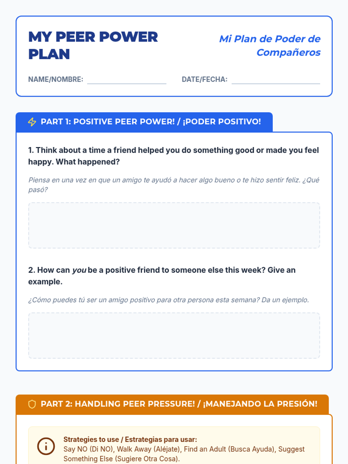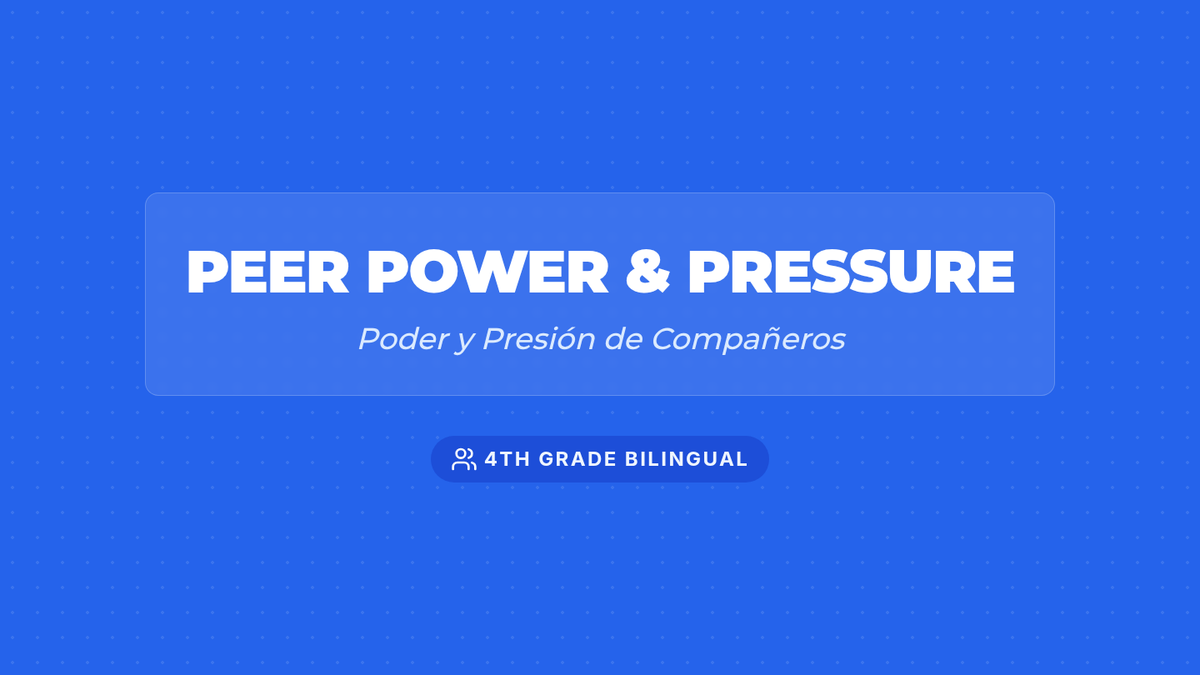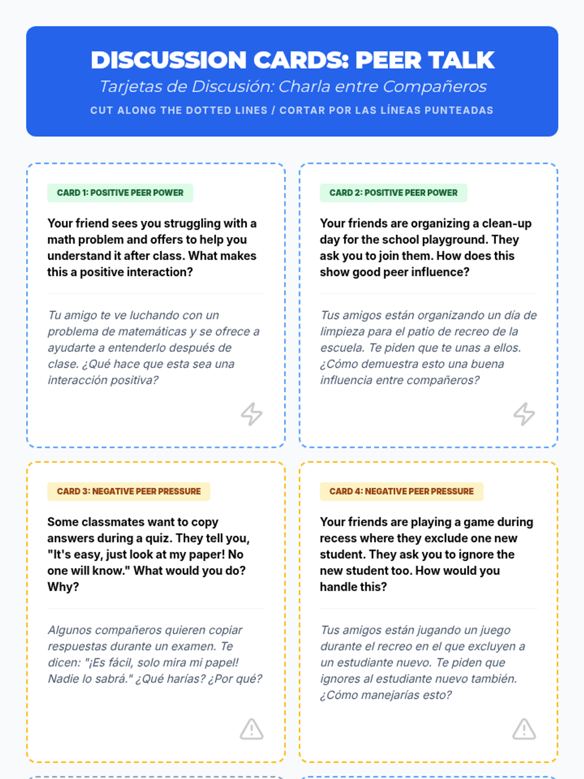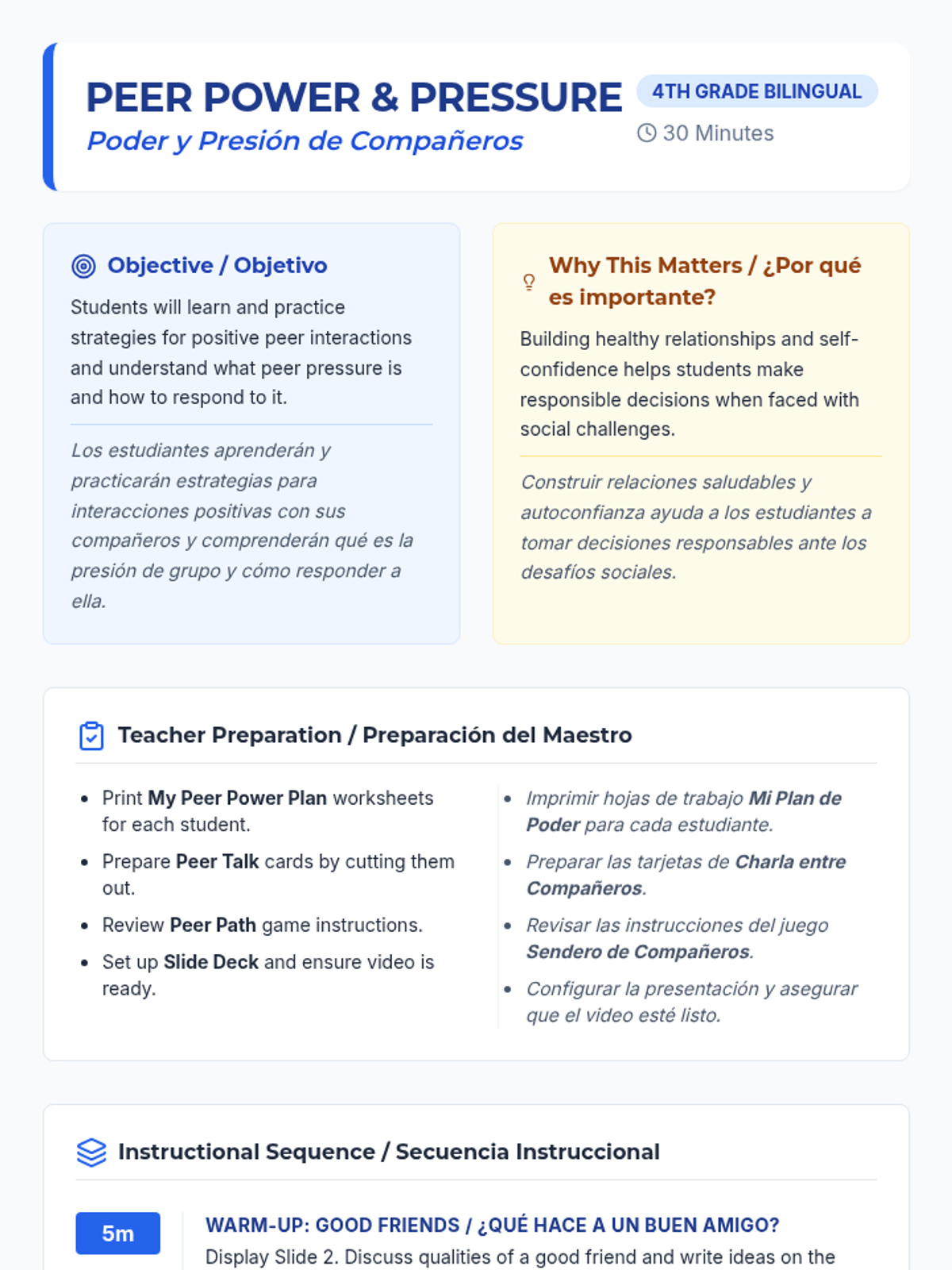 A 30-minute bilingual lesson for 4th graders to explore positive peer interactions and strategies for navigating peer pressure. Students will engage in role-playing, reading, and self-reflection to build social-emotional resilience.