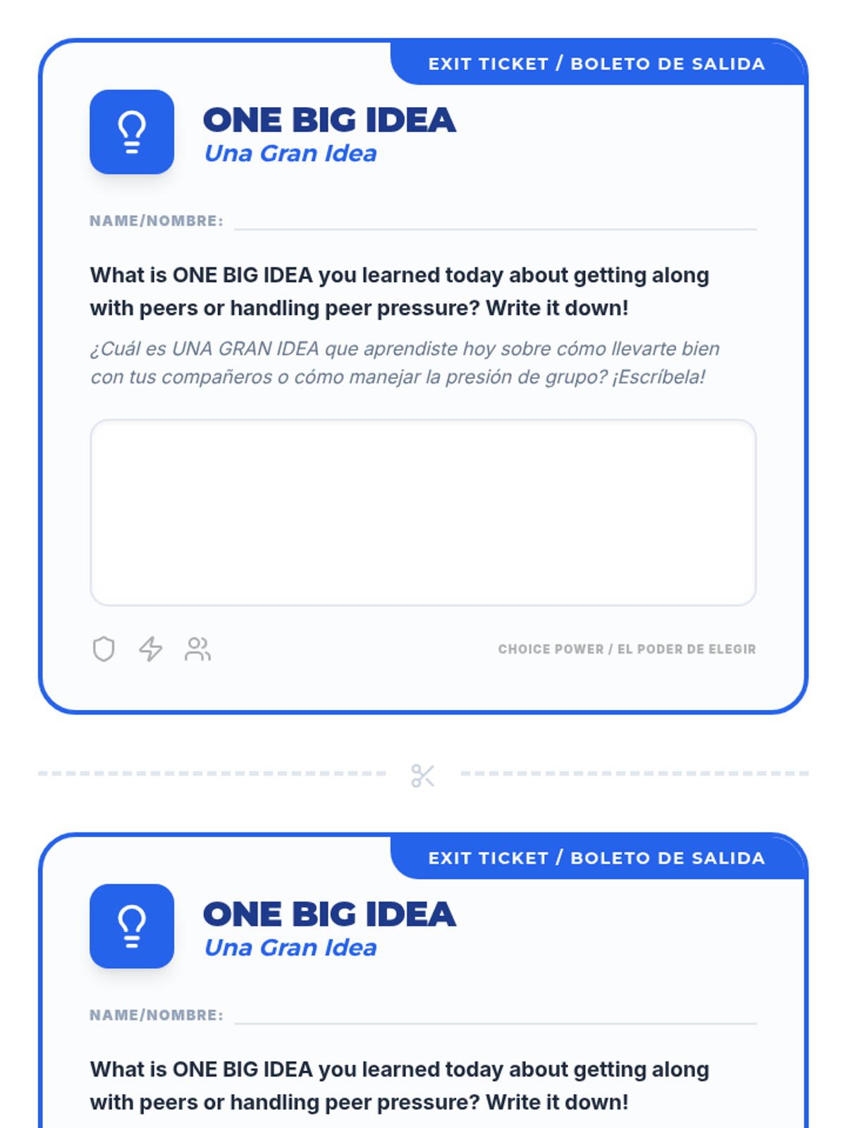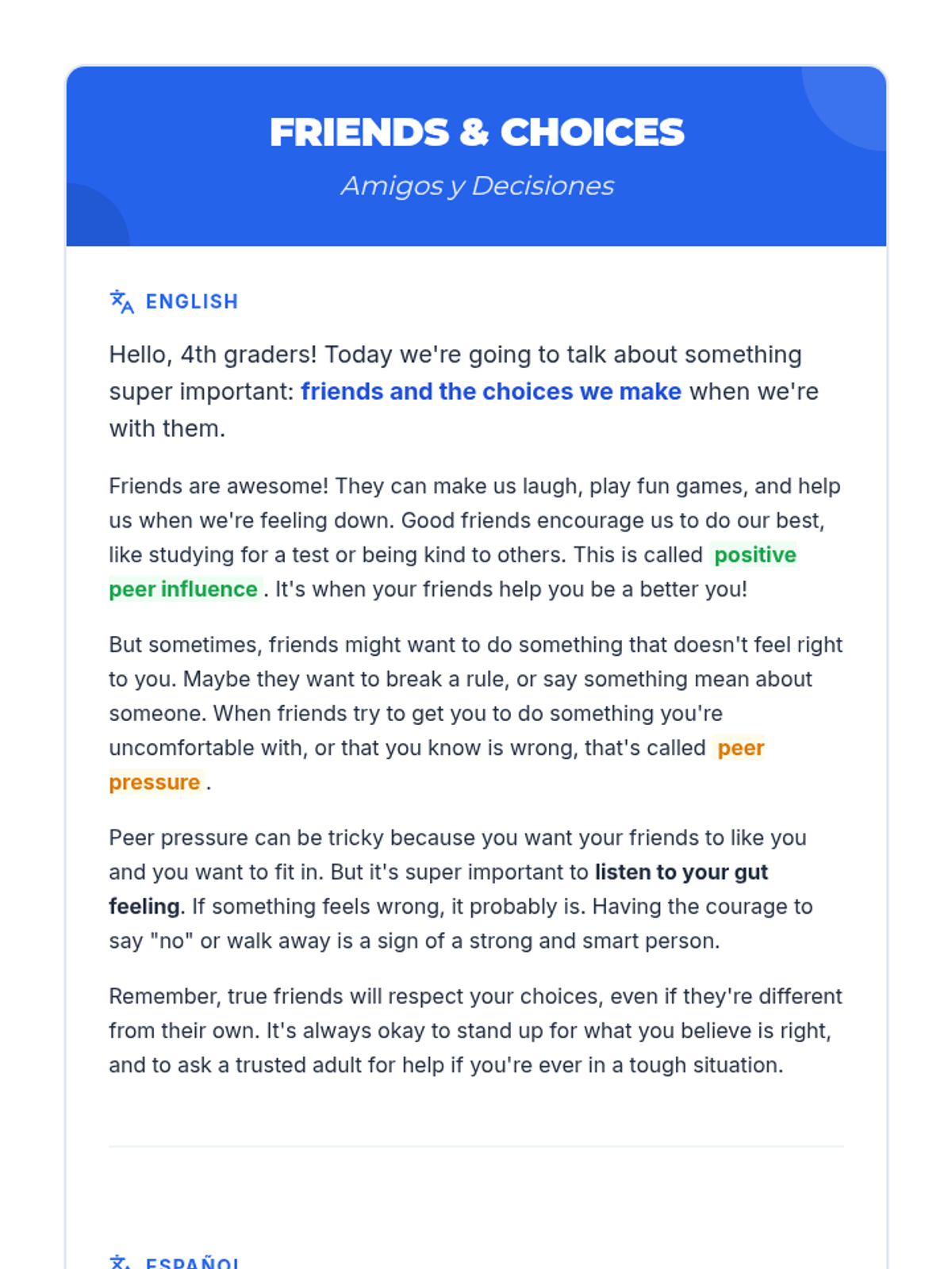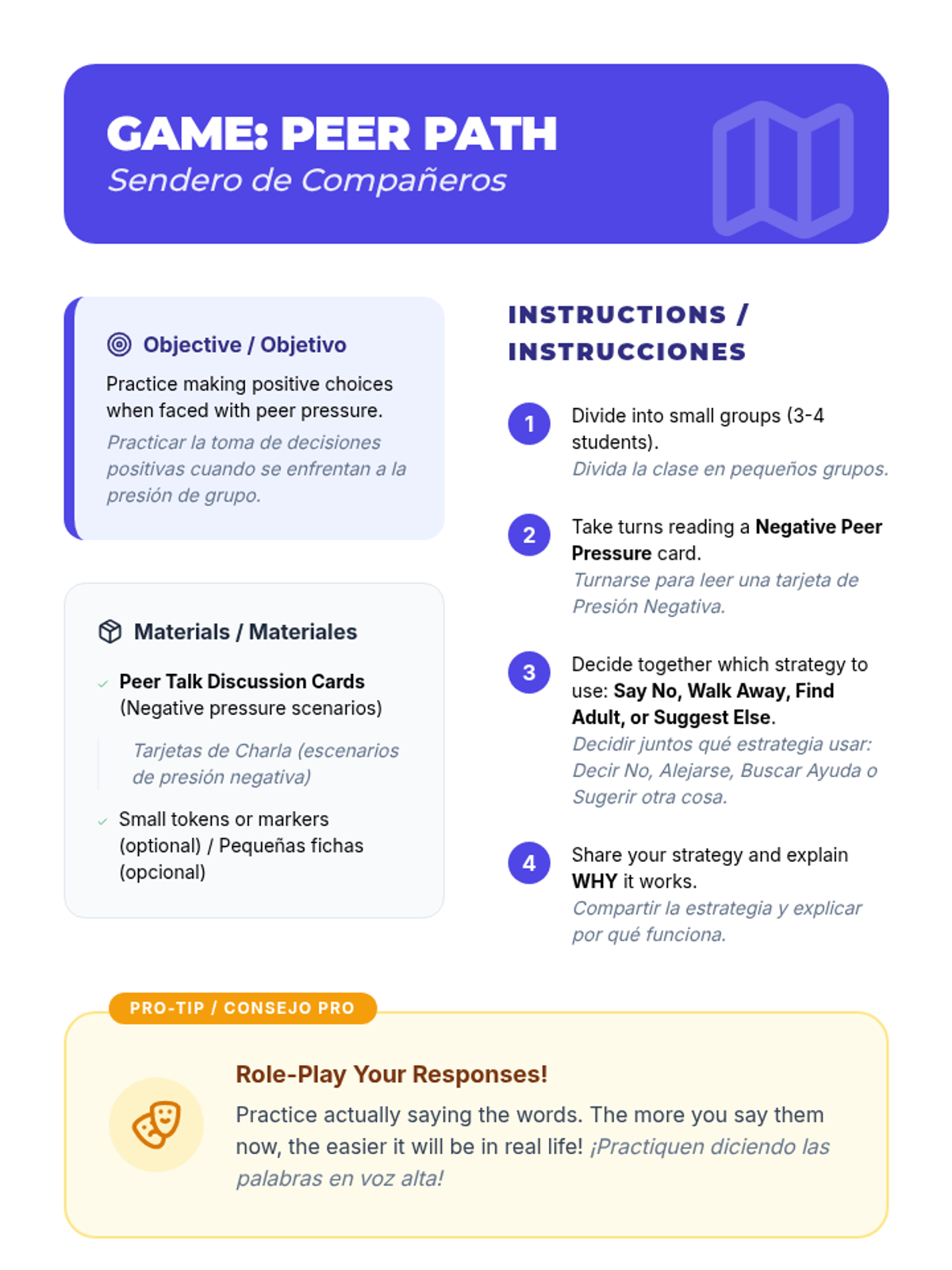 A 30-minute bilingual lesson for 4th graders to explore positive peer interactions and strategies for navigating peer pressure. Students will engage in role-playing, reading, and self-reflection to build social-emotional resilience.