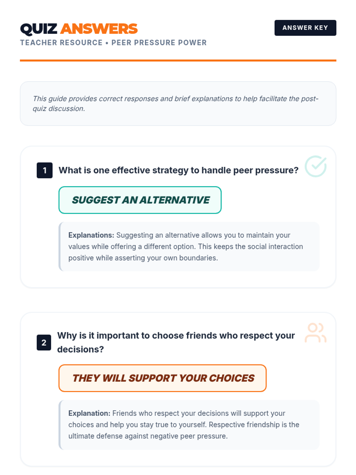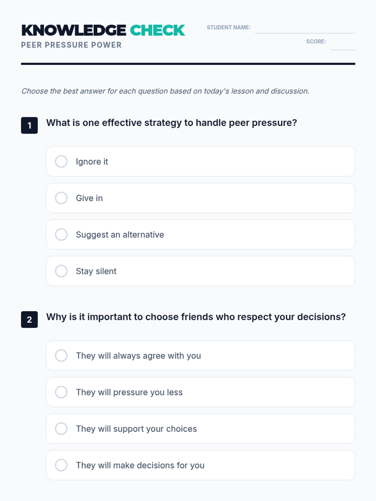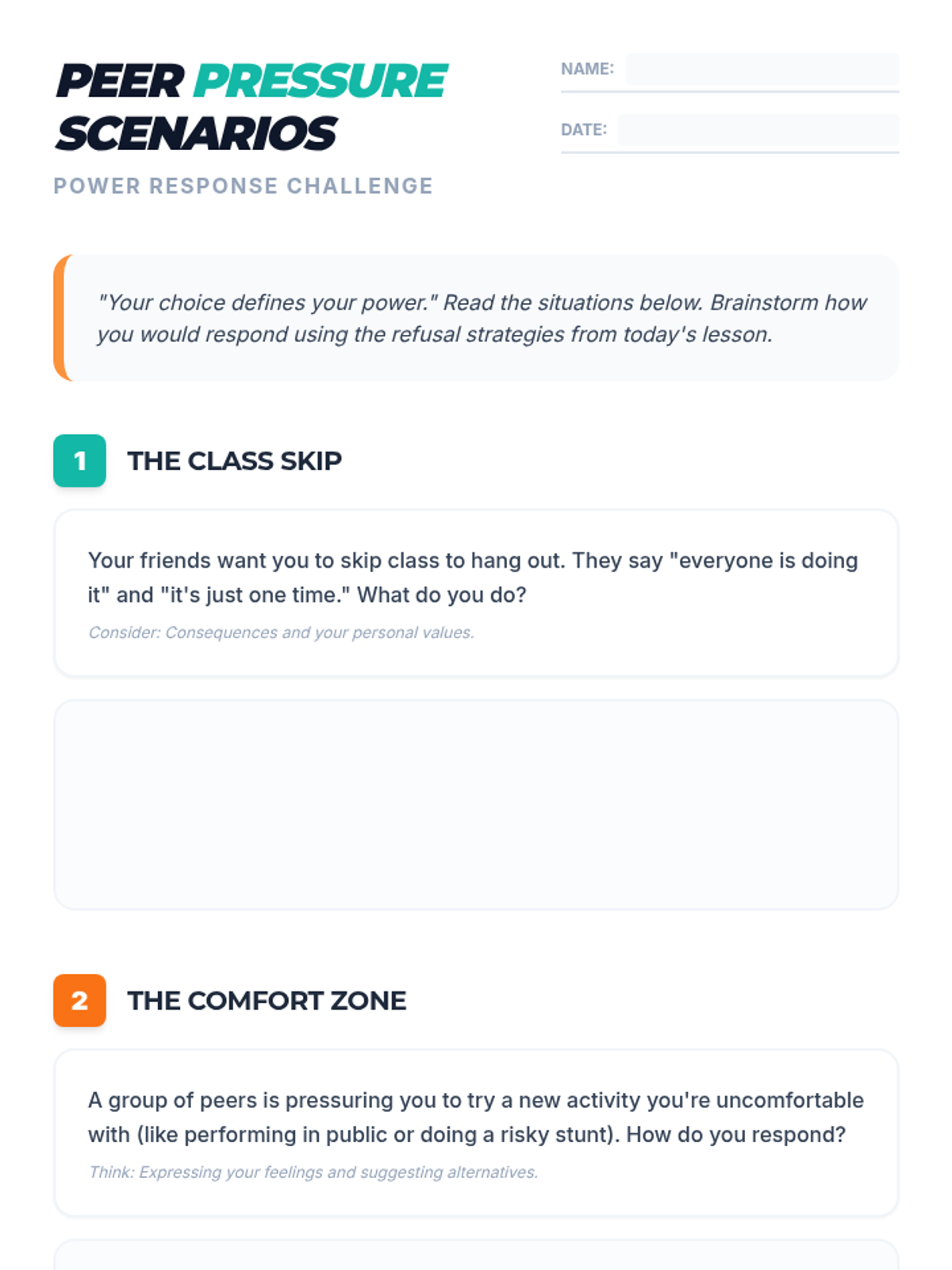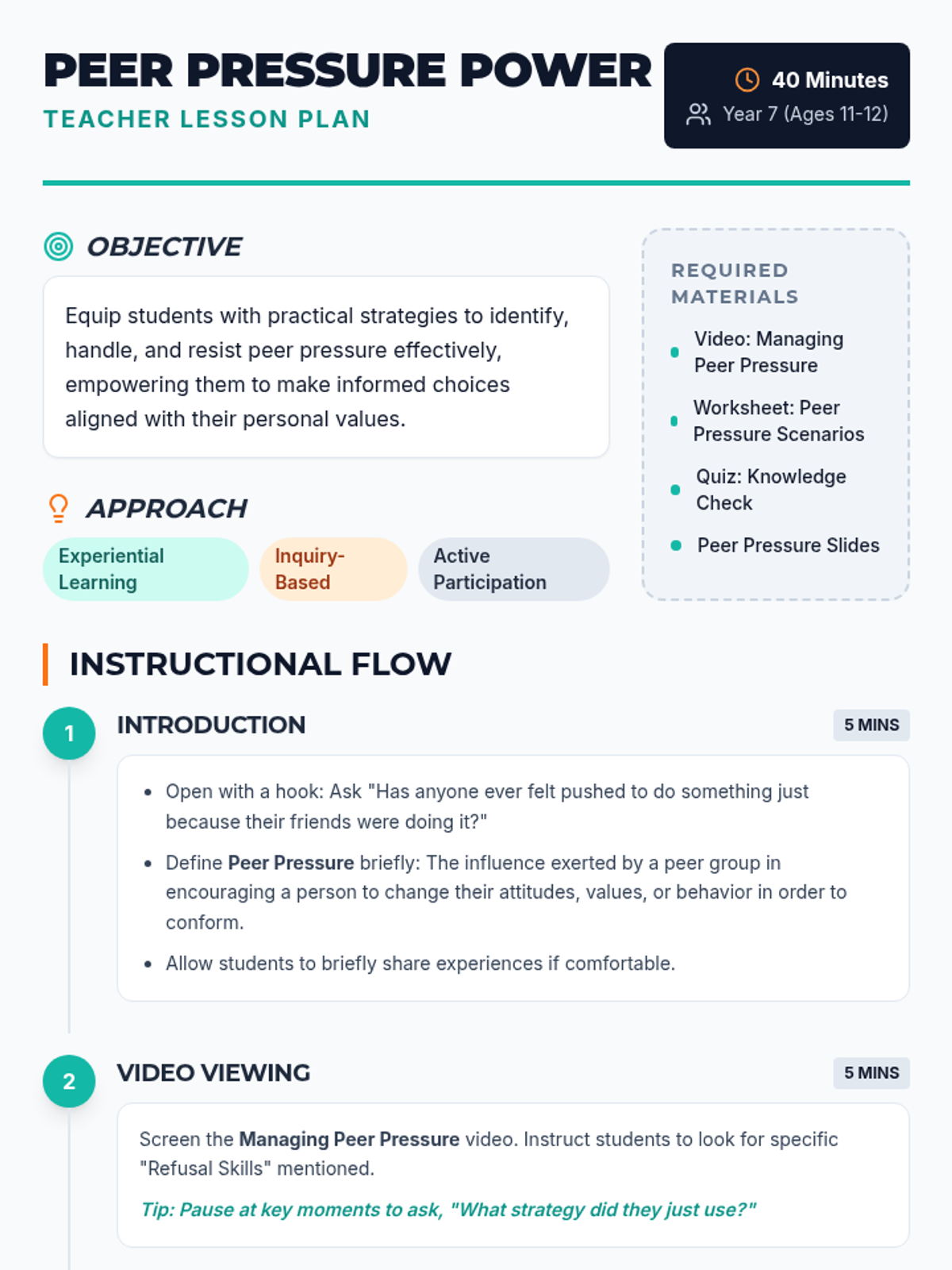 A dynamic, experiential lesson designed for Year 7 students to explore strategies for resisting peer pressure and making values-aligned decisions. Students engage with scenarios, a video guide, and collaborative discussion to build resilience and self-confidence.