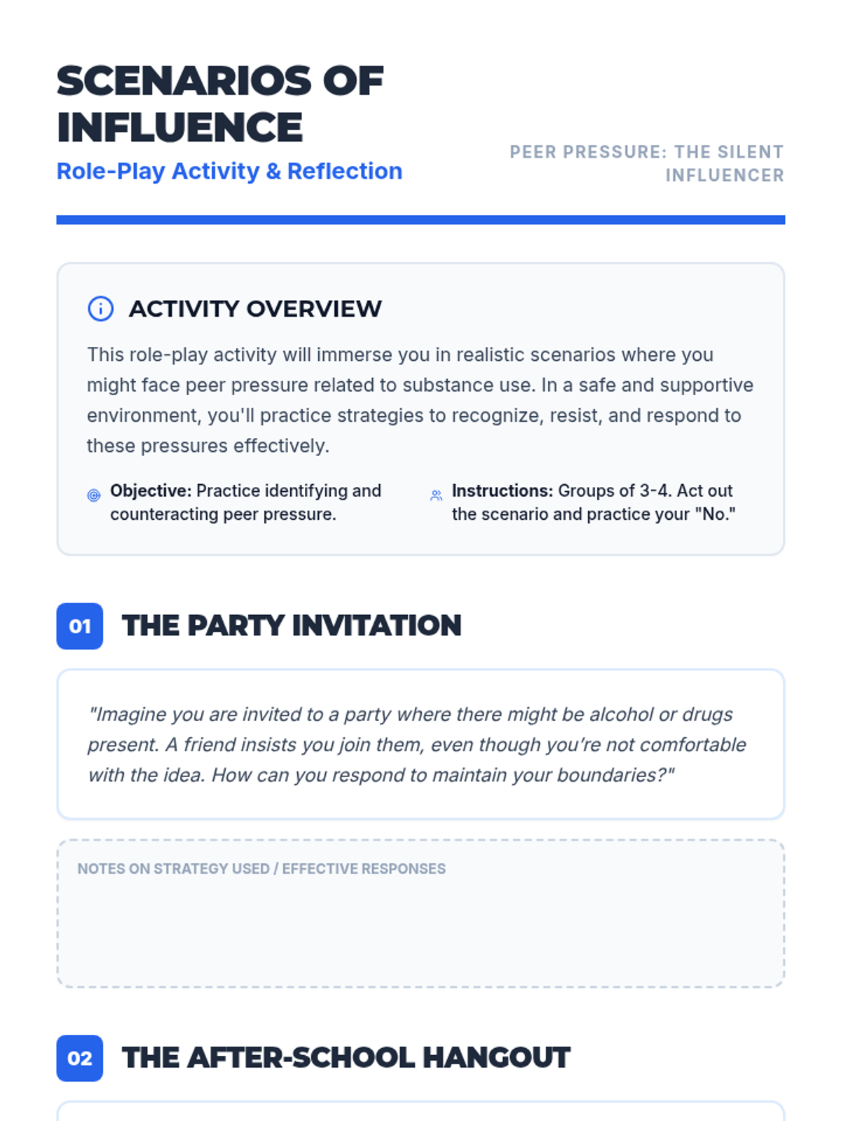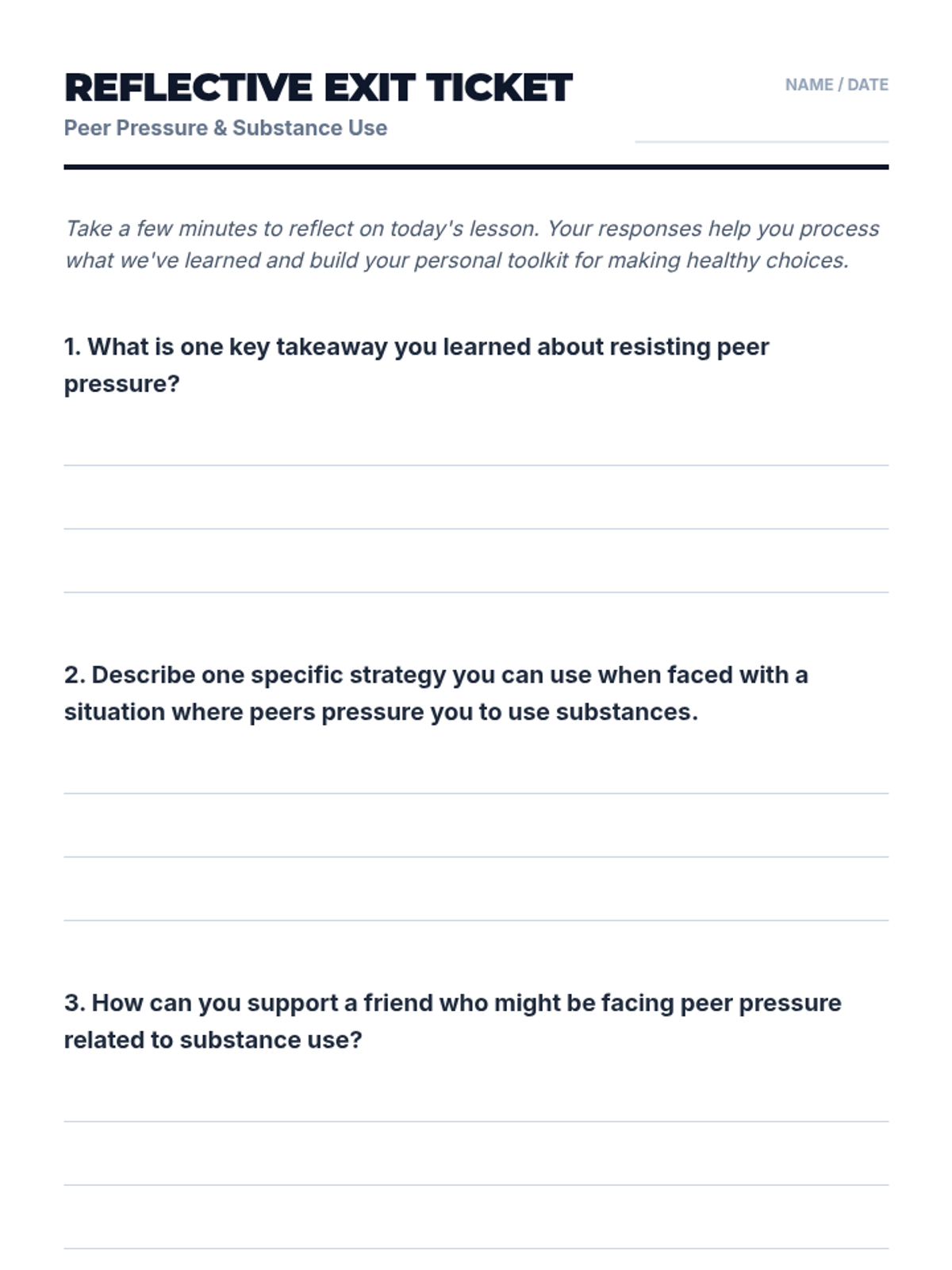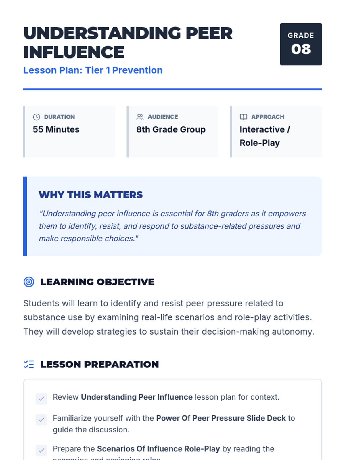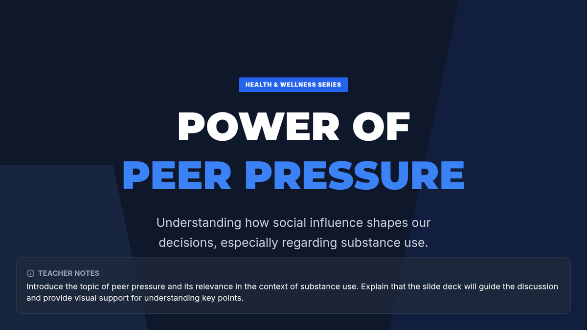 A lesson addressing the role of peer pressure in substance use, helping students develop strategies to resist and respond to peer influence effectively. This empowers them to make their own choices.
