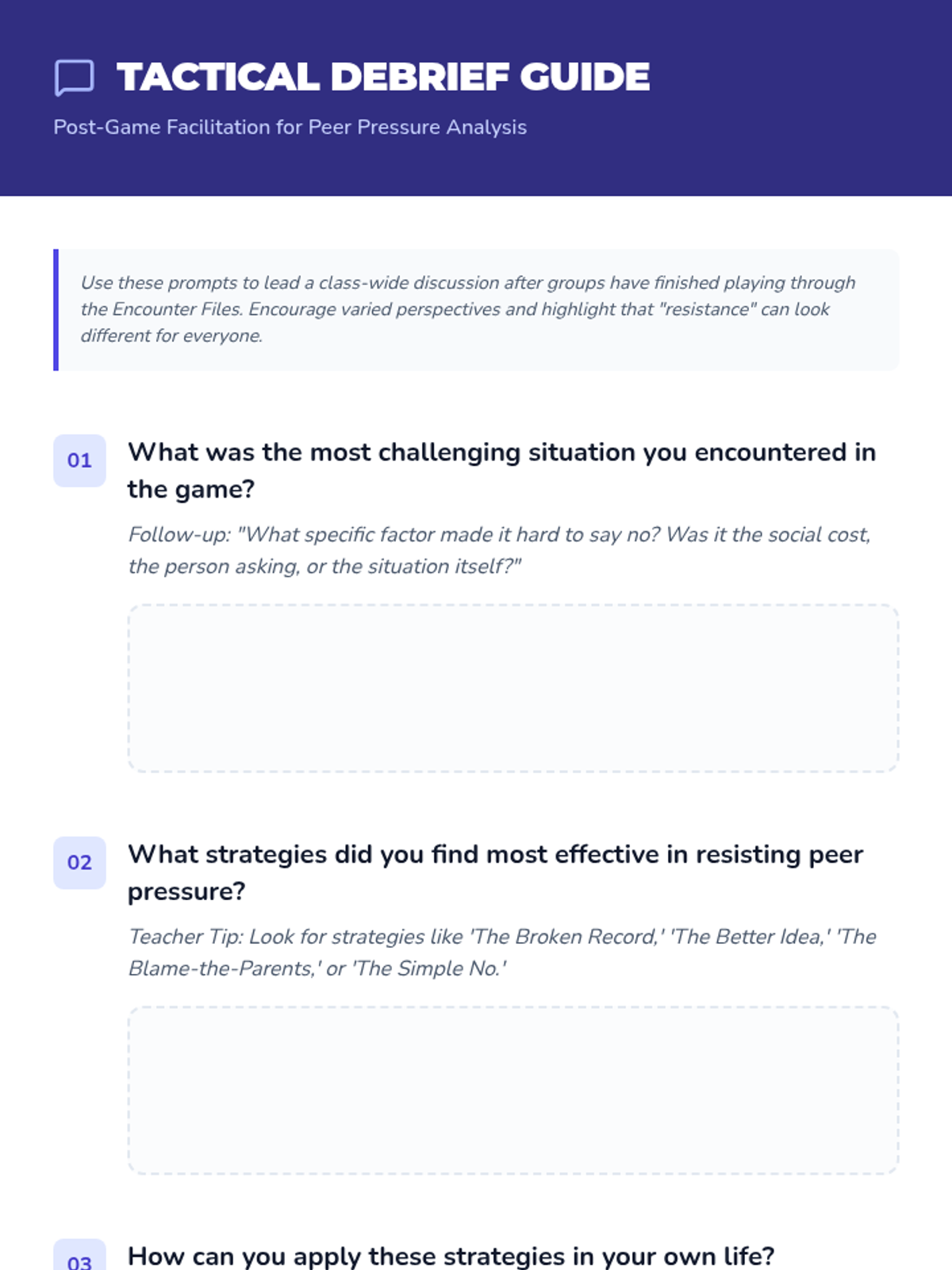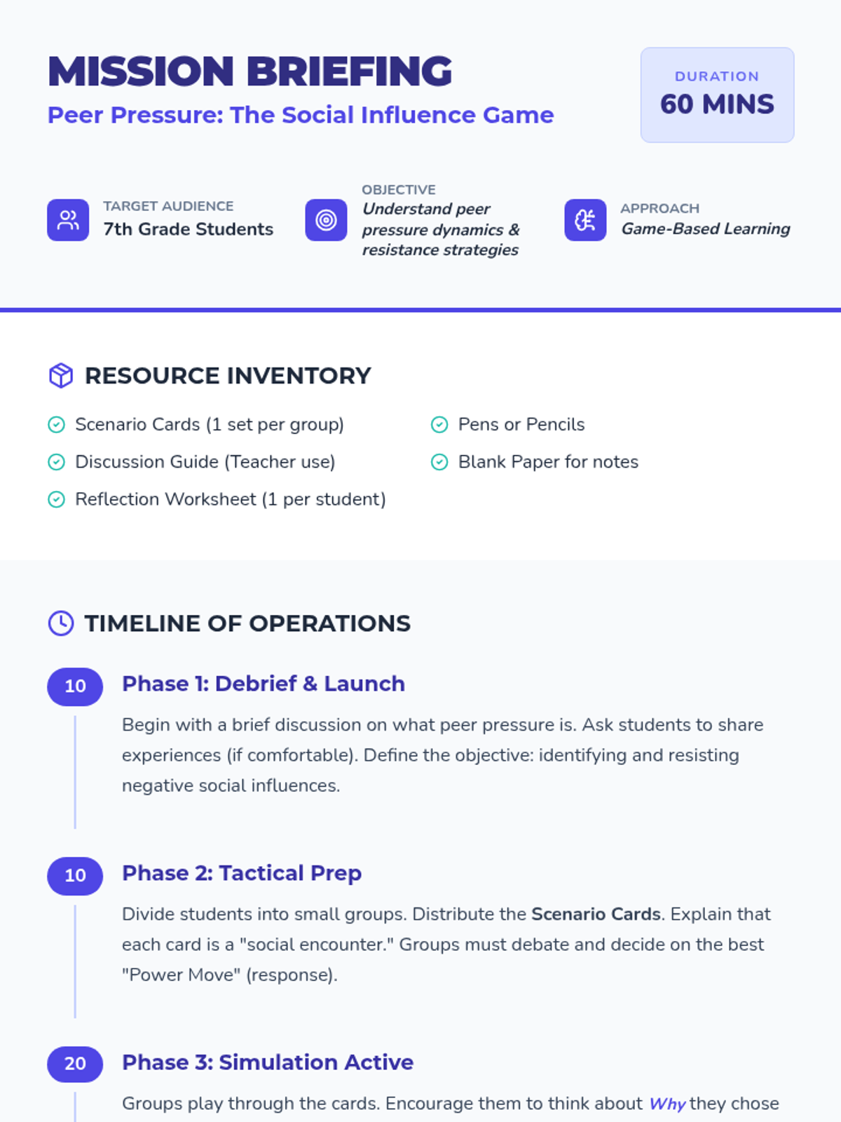 This lesson engages students in a game-based learning experience to simulate social situations and understand peer pressure dynamics. Students will identify positive and negative influences and develop personal resistance strategies.