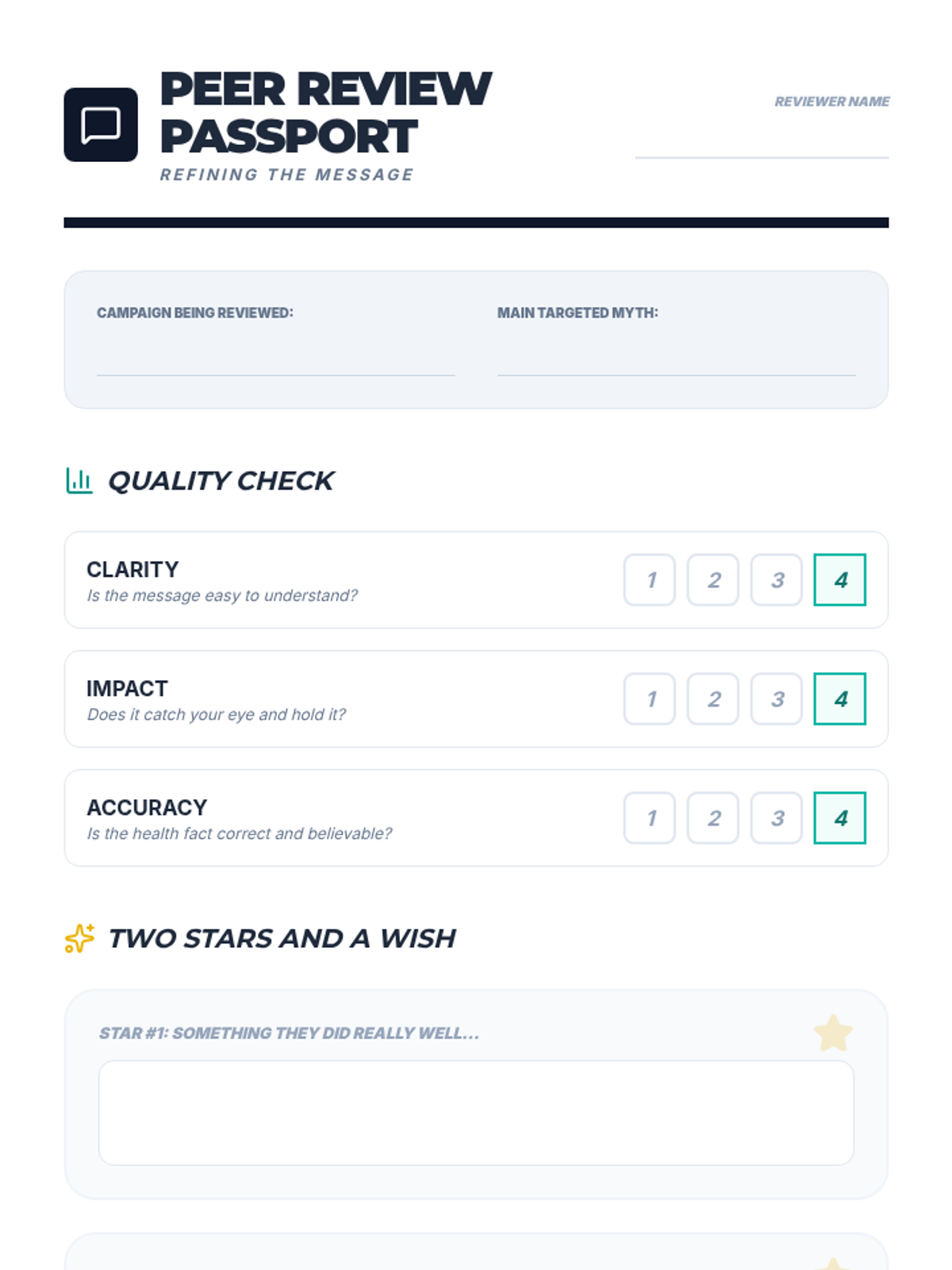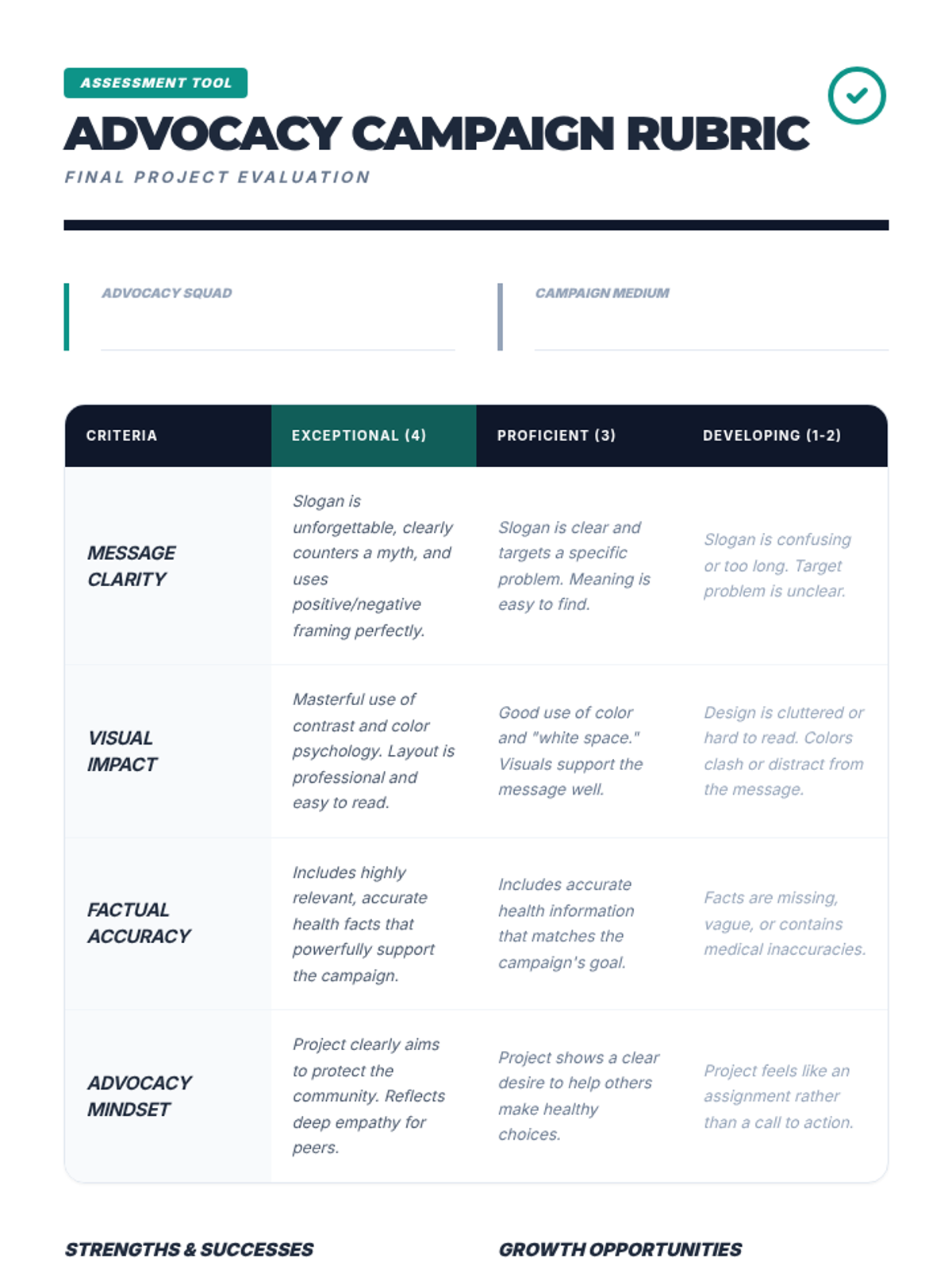 Draft campaigns are exchanged for peer review using a structured rubric. Students refine their work based on feedback, focusing on factual accuracy, clarity, and visual impact before final production.