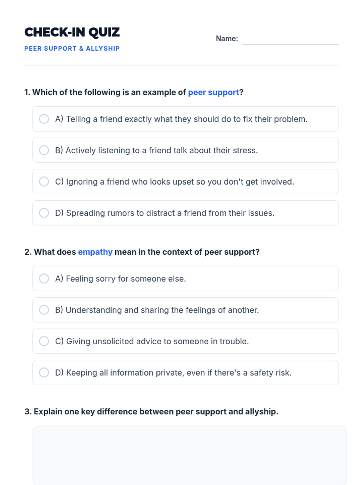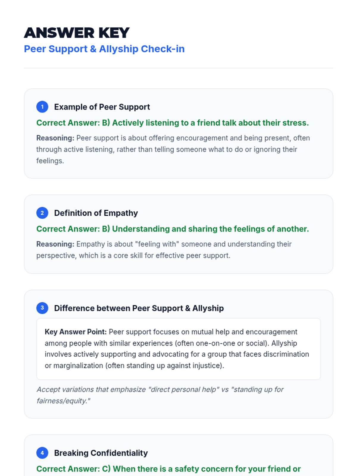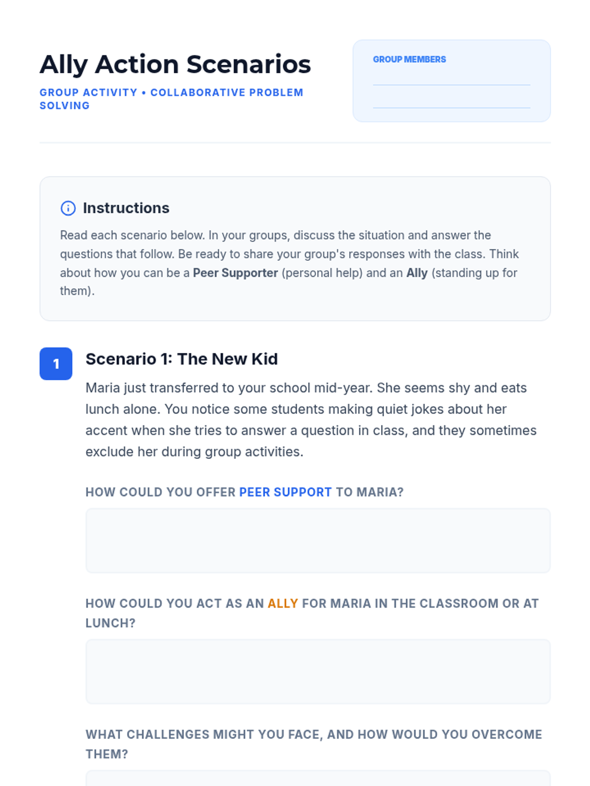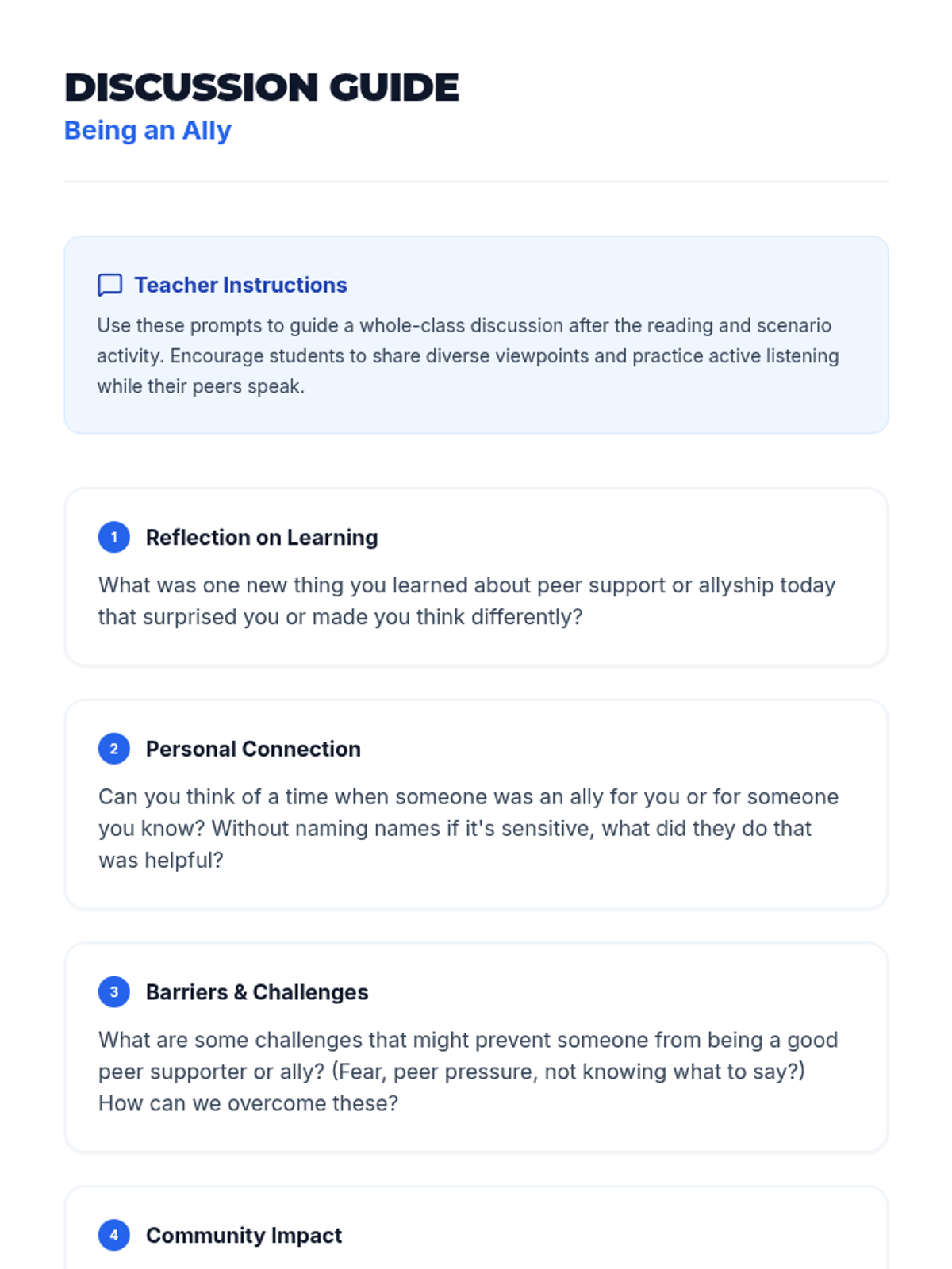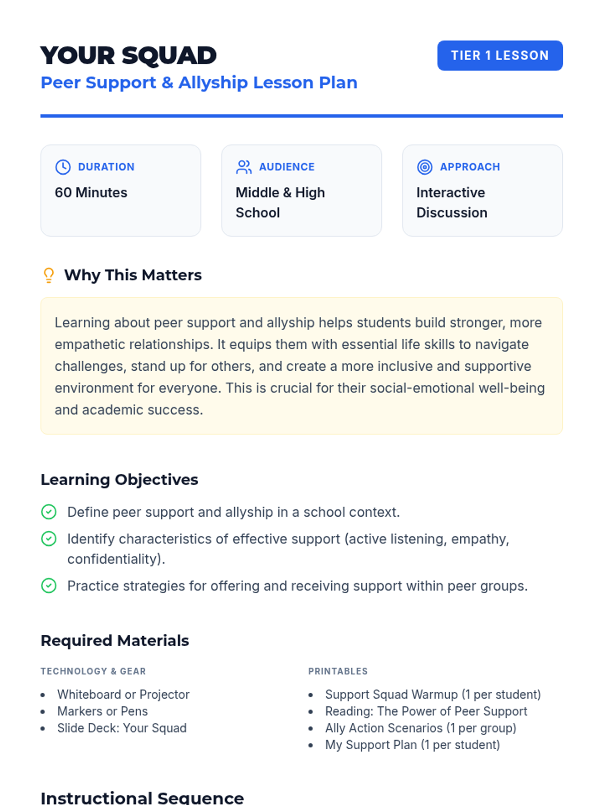 This lesson introduces middle and high school students to the concepts of peer support and allyship, providing practical strategies for building a more inclusive and supportive school community through interactive scenarios and personal planning.