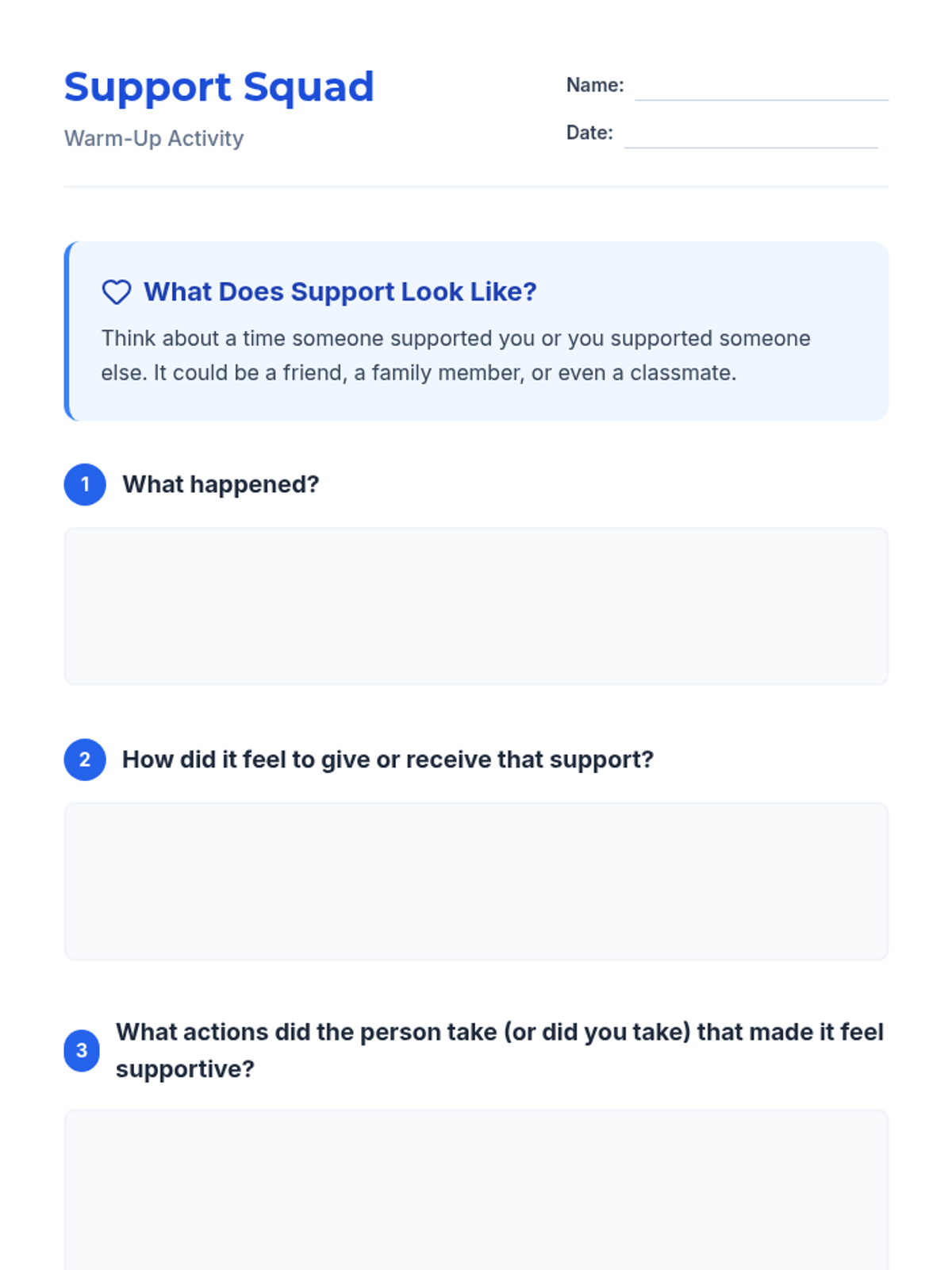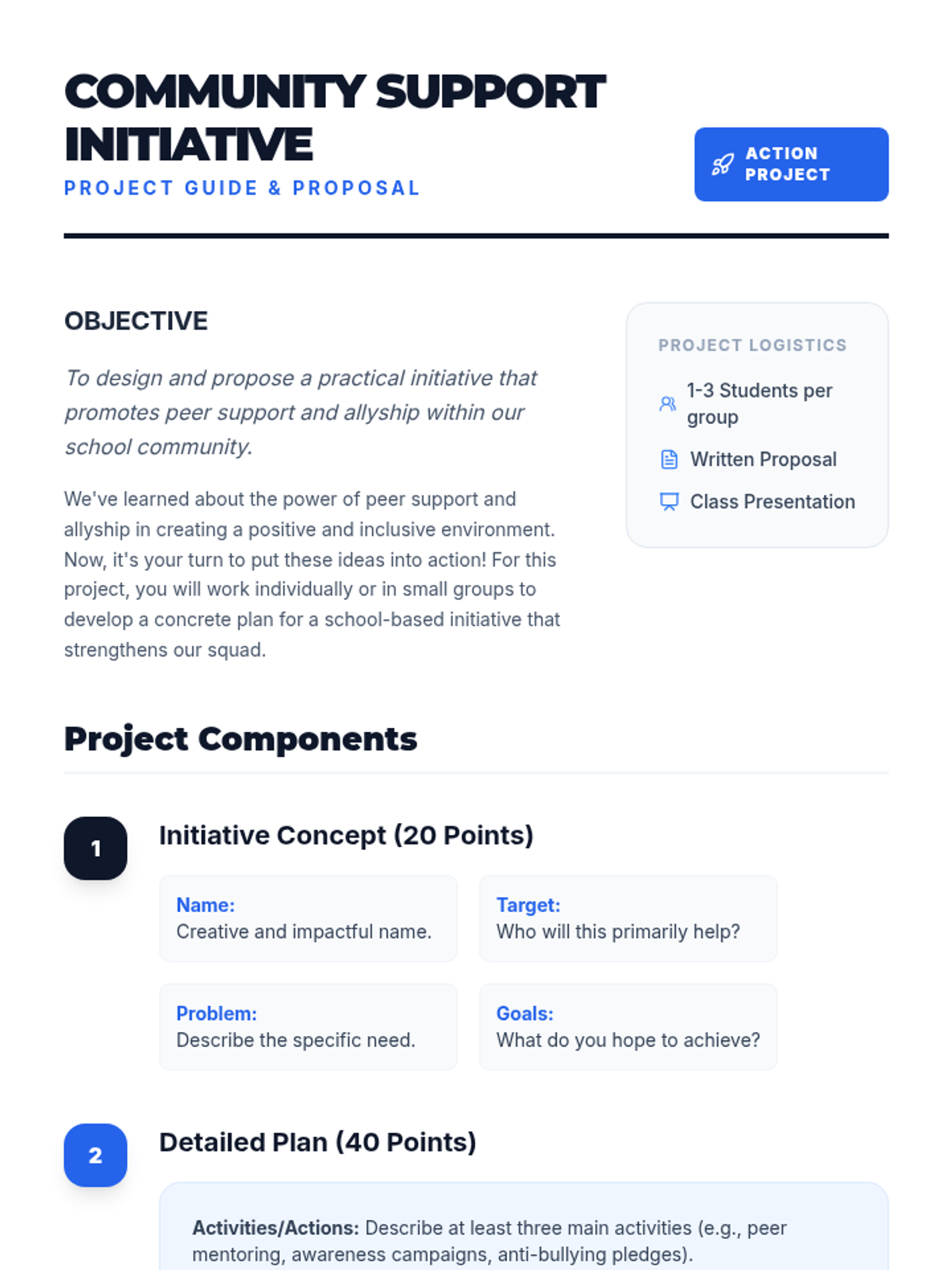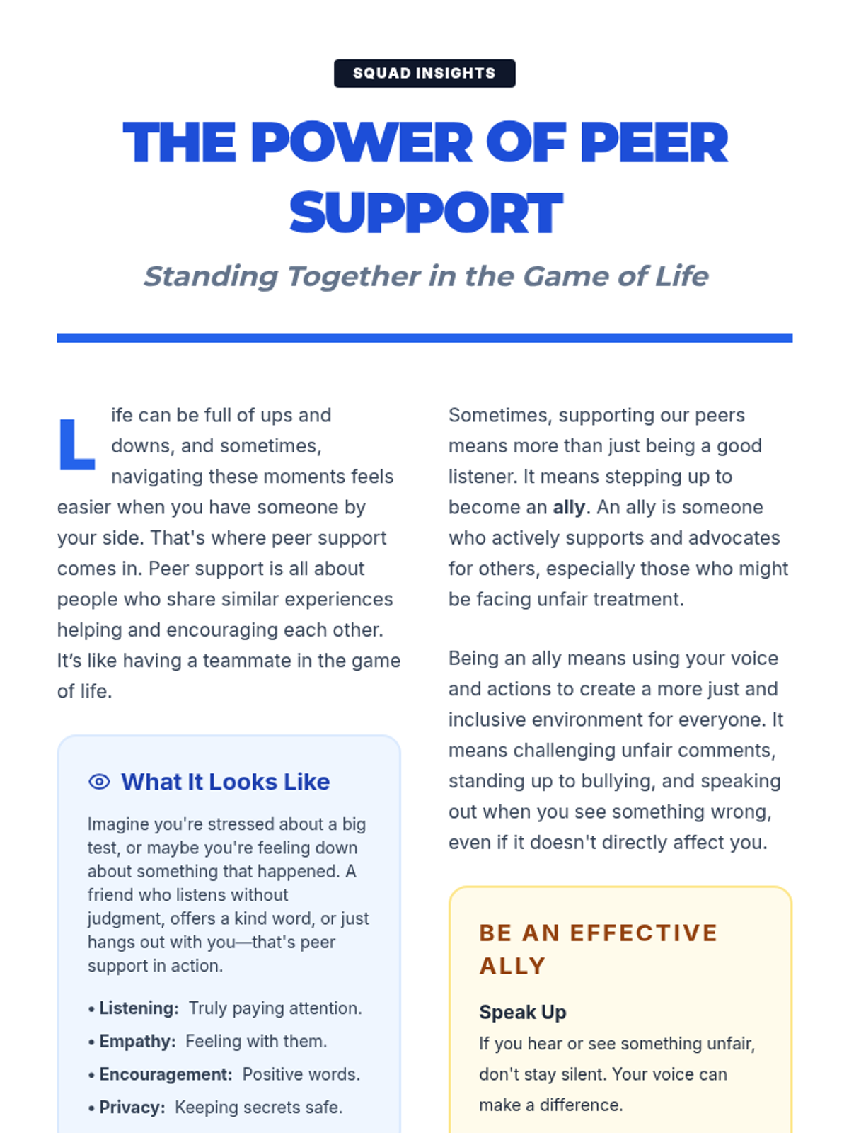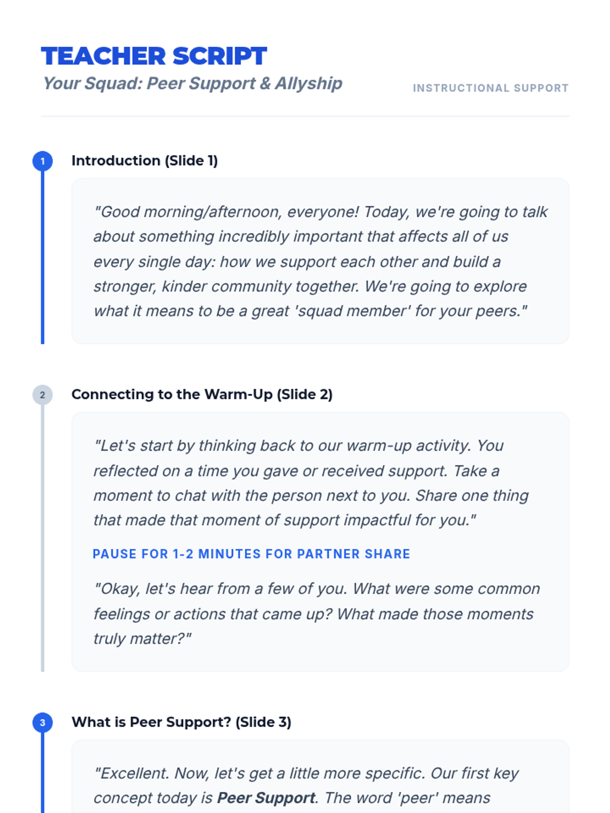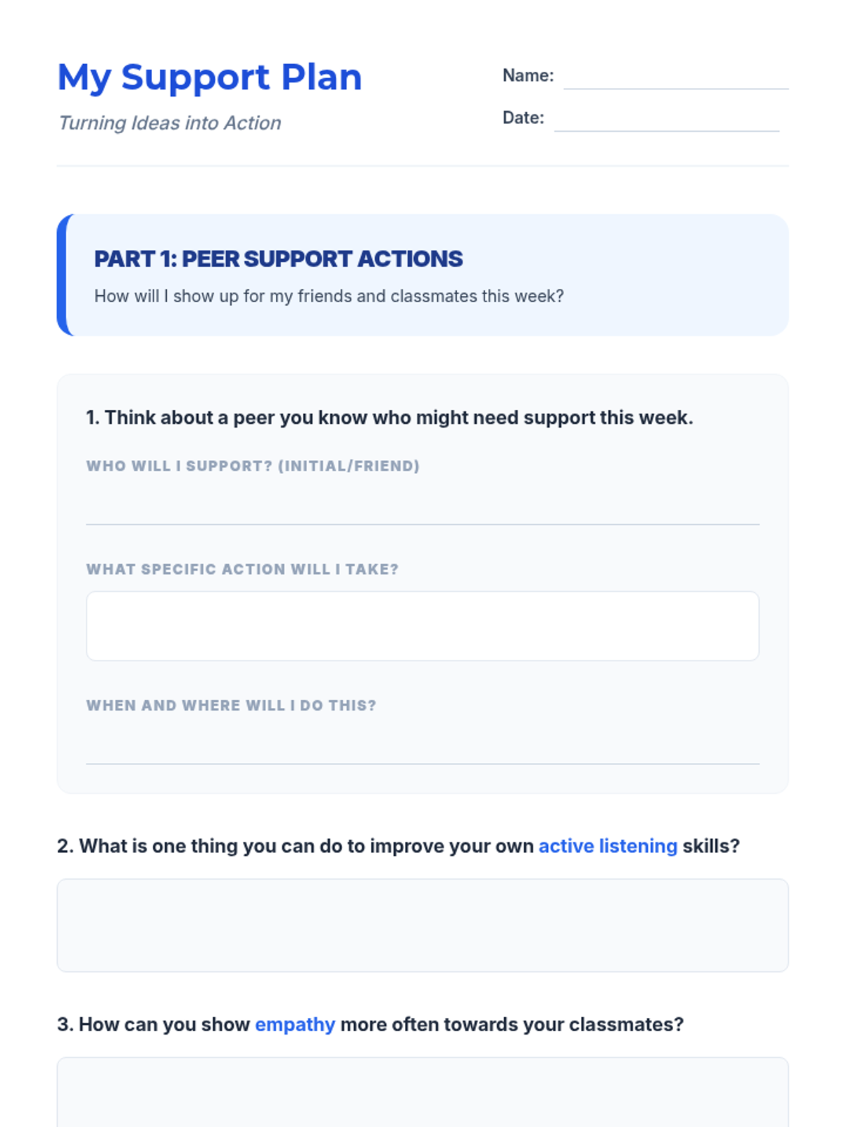 This lesson introduces middle and high school students to the concepts of peer support and allyship, providing practical strategies for building a more inclusive and supportive school community through interactive scenarios and personal planning.