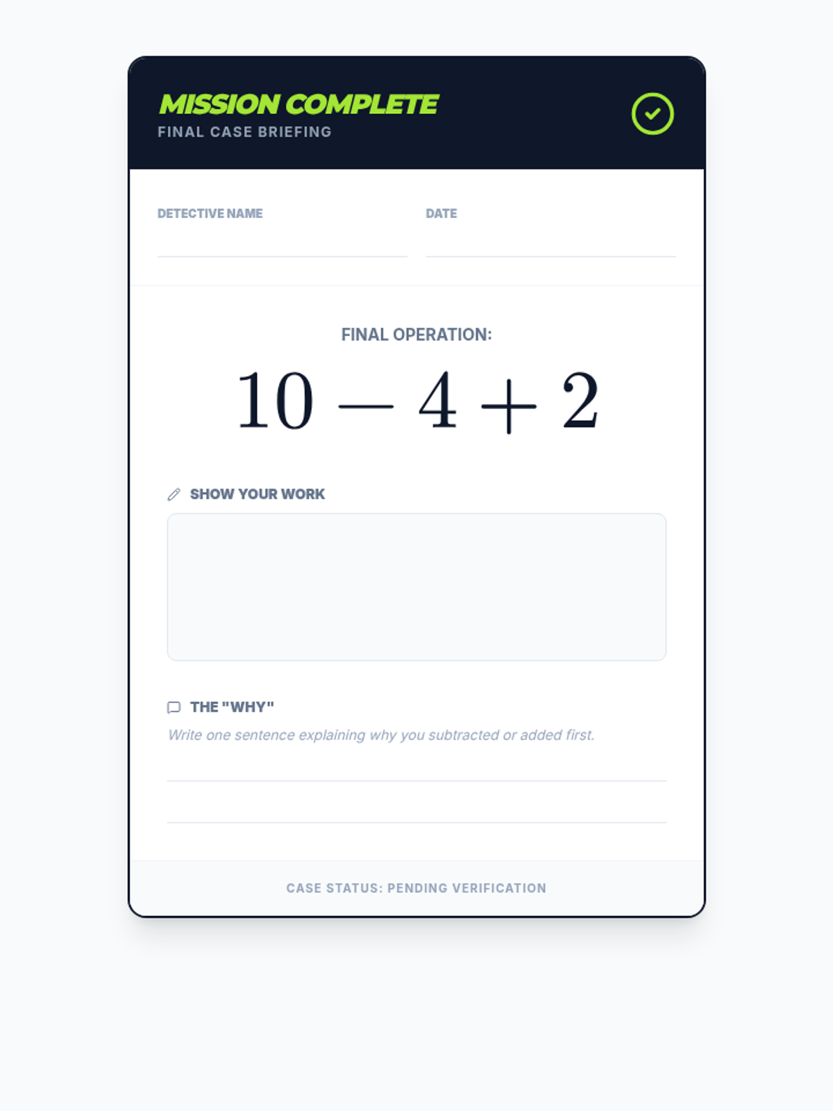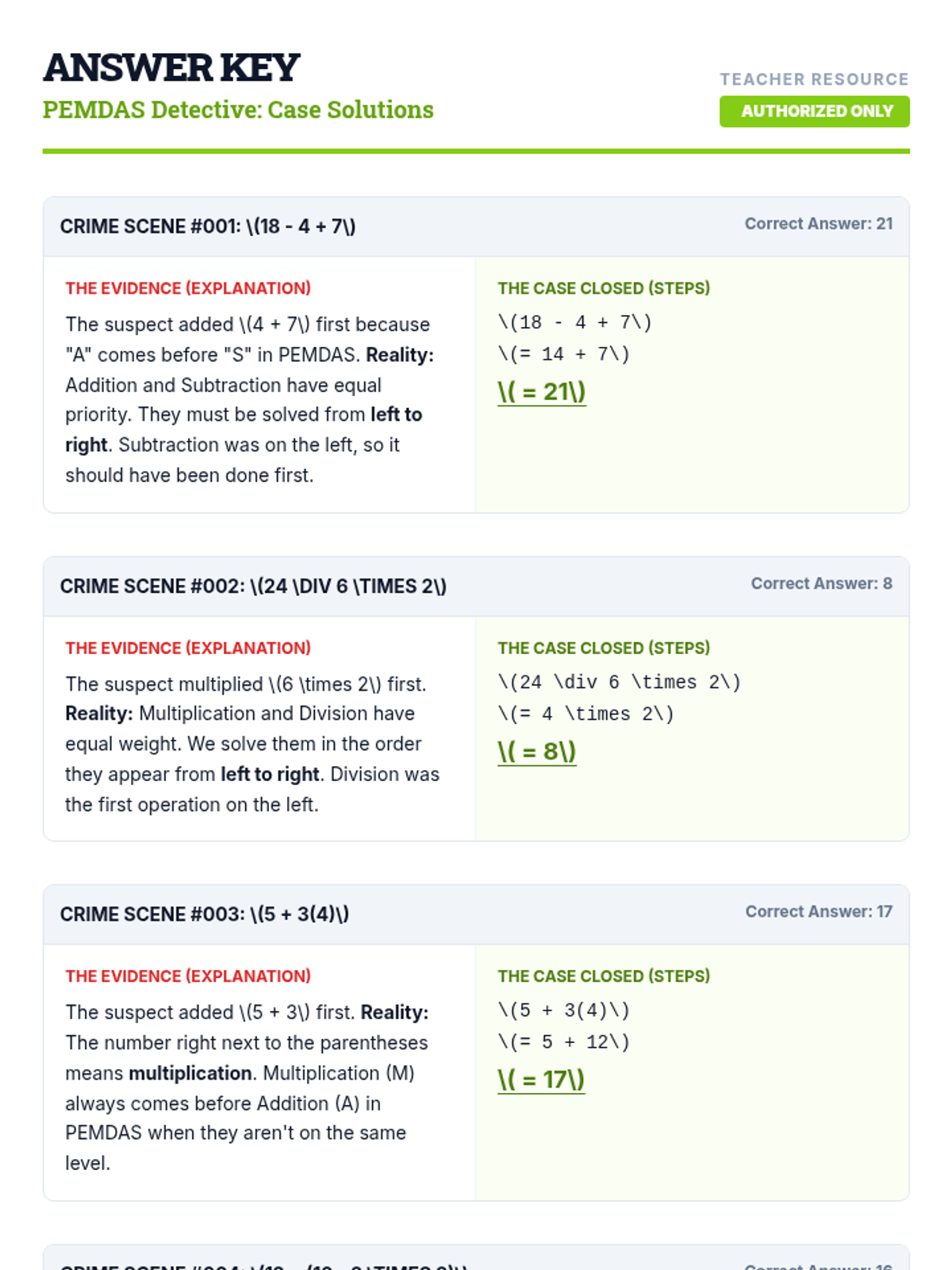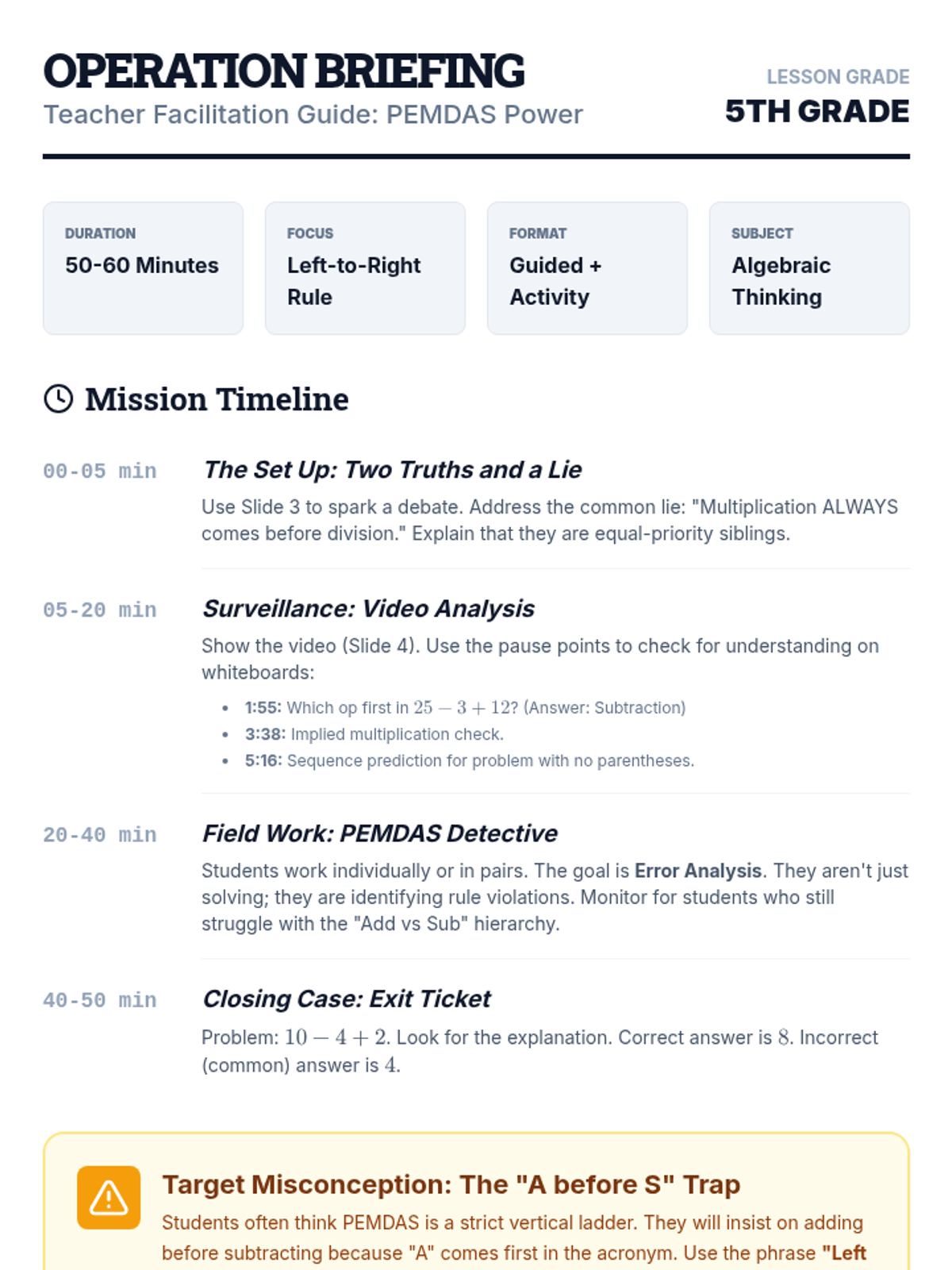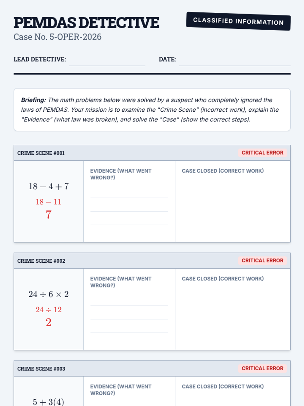 A 5th-grade math lesson focused on the order of operations, specifically addressing the left-to-right rule for multiplication/division and addition/subtraction. The lesson includes a video-based guided practice and a "PEMDAS Detective" error-analysis activity.