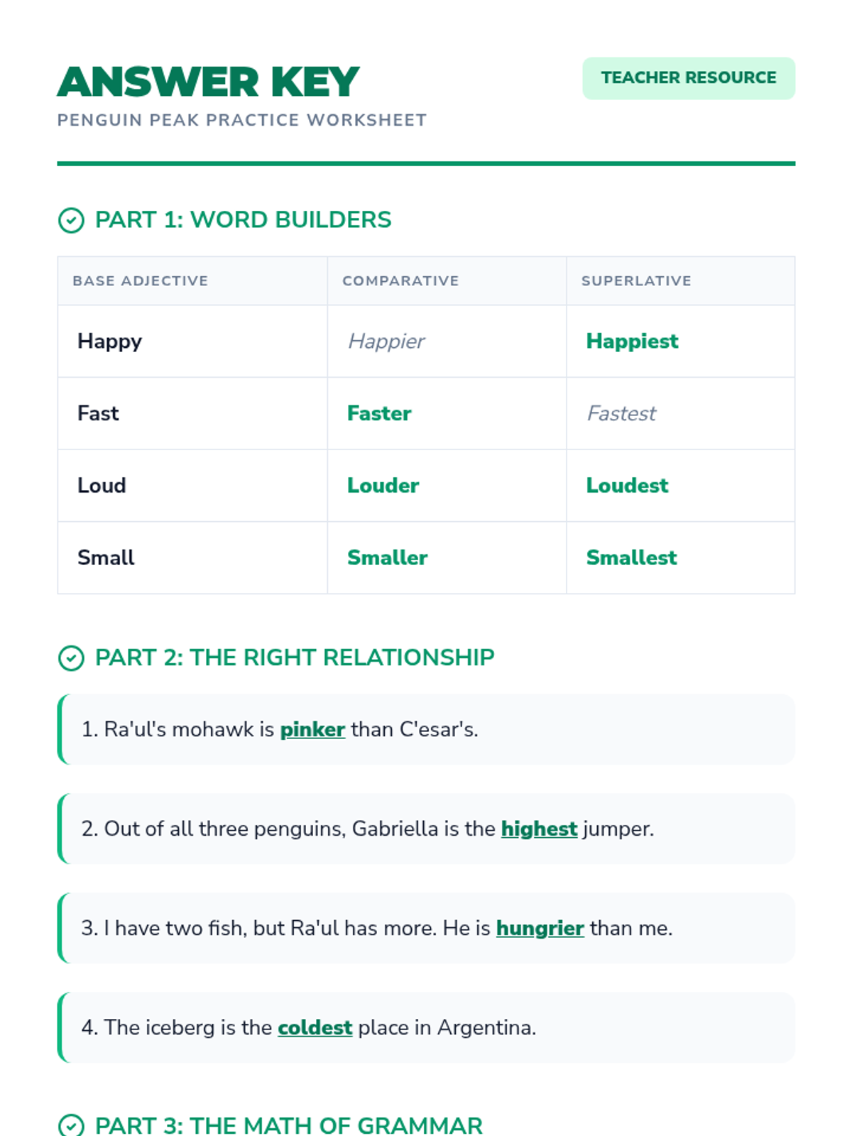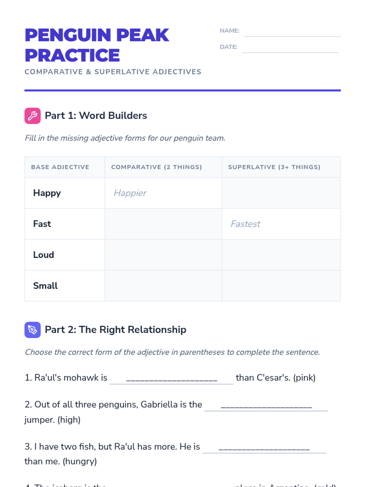 A kinesthetic grammar lesson where students use penguin-themed comparisons and a physical line-up activity to master comparative and superlative adjectives.