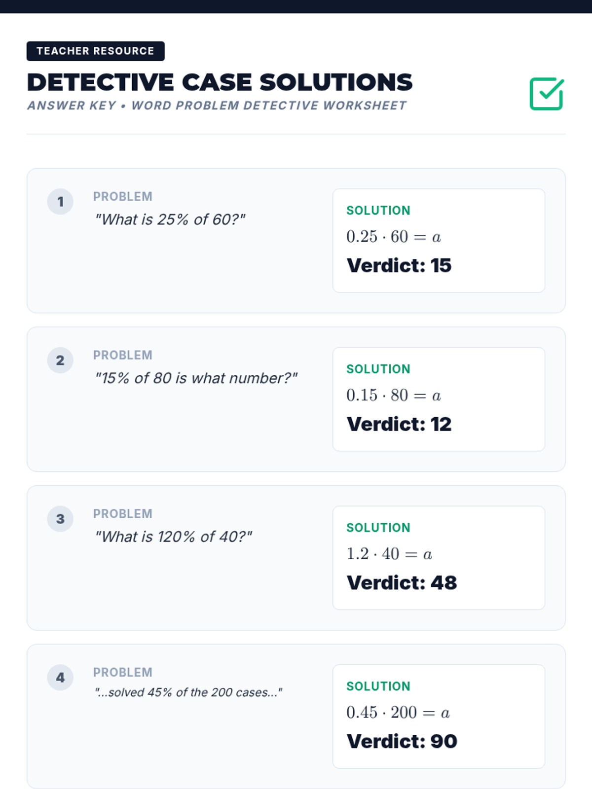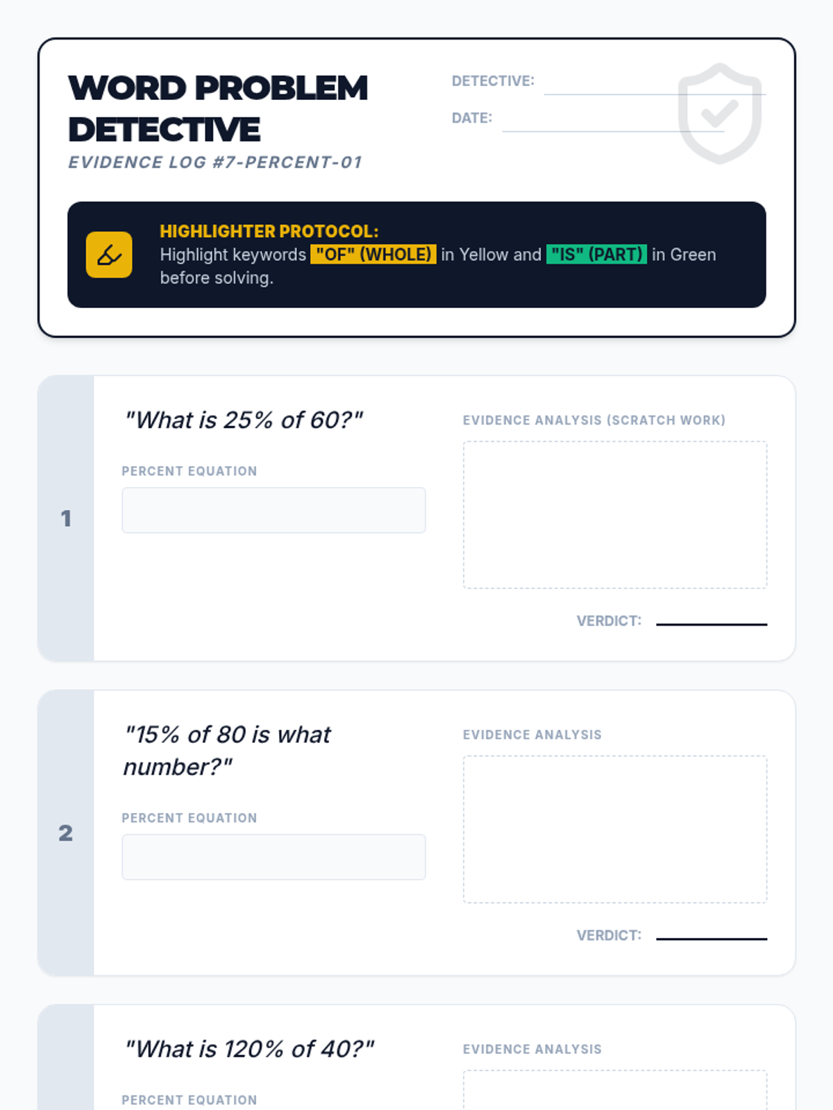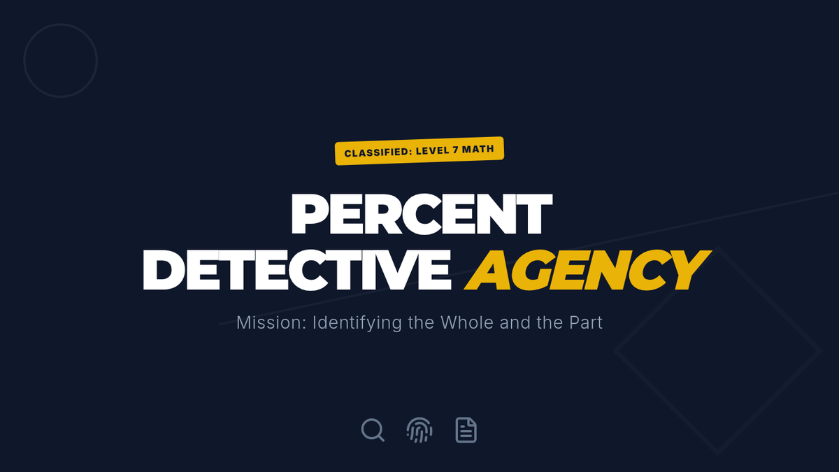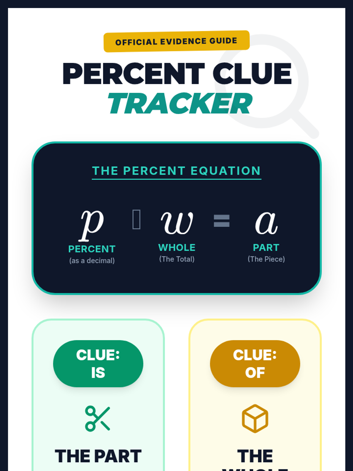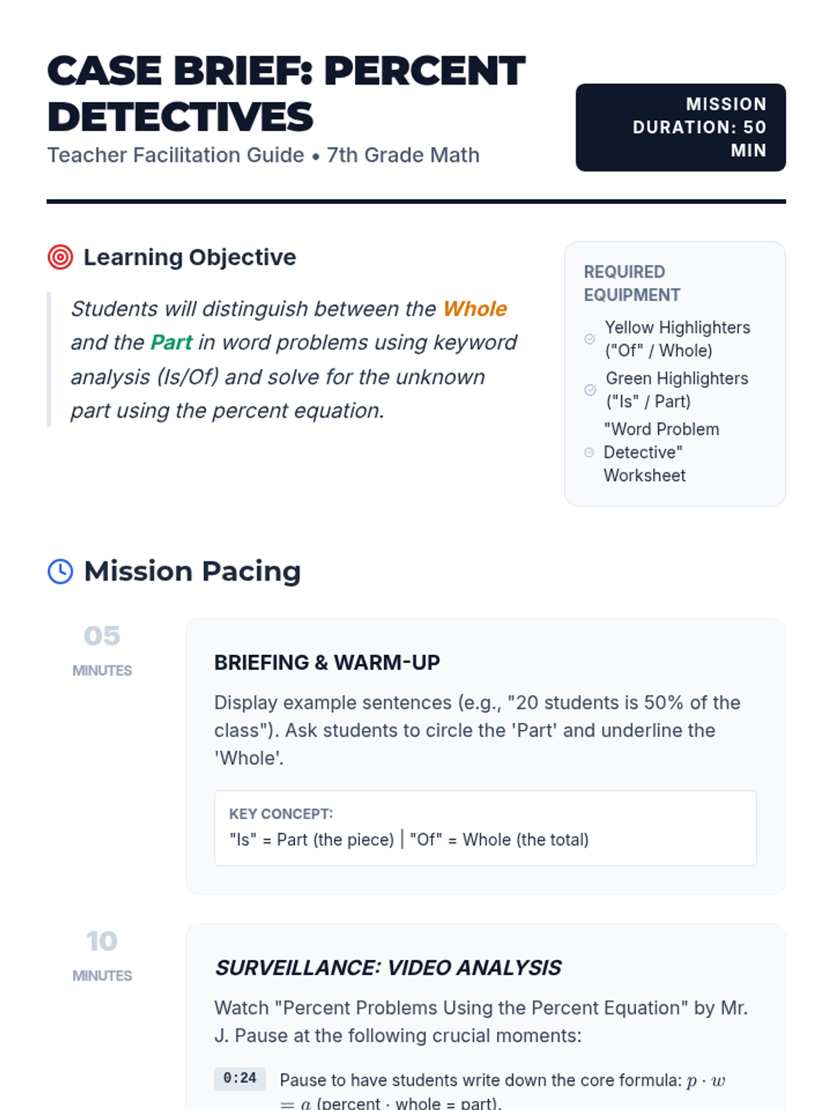 A 7th-grade math lesson focused on identifying the 'Whole' and 'Part' in percent word problems using keyword analysis (Is/Of) and solving using the percent equation.