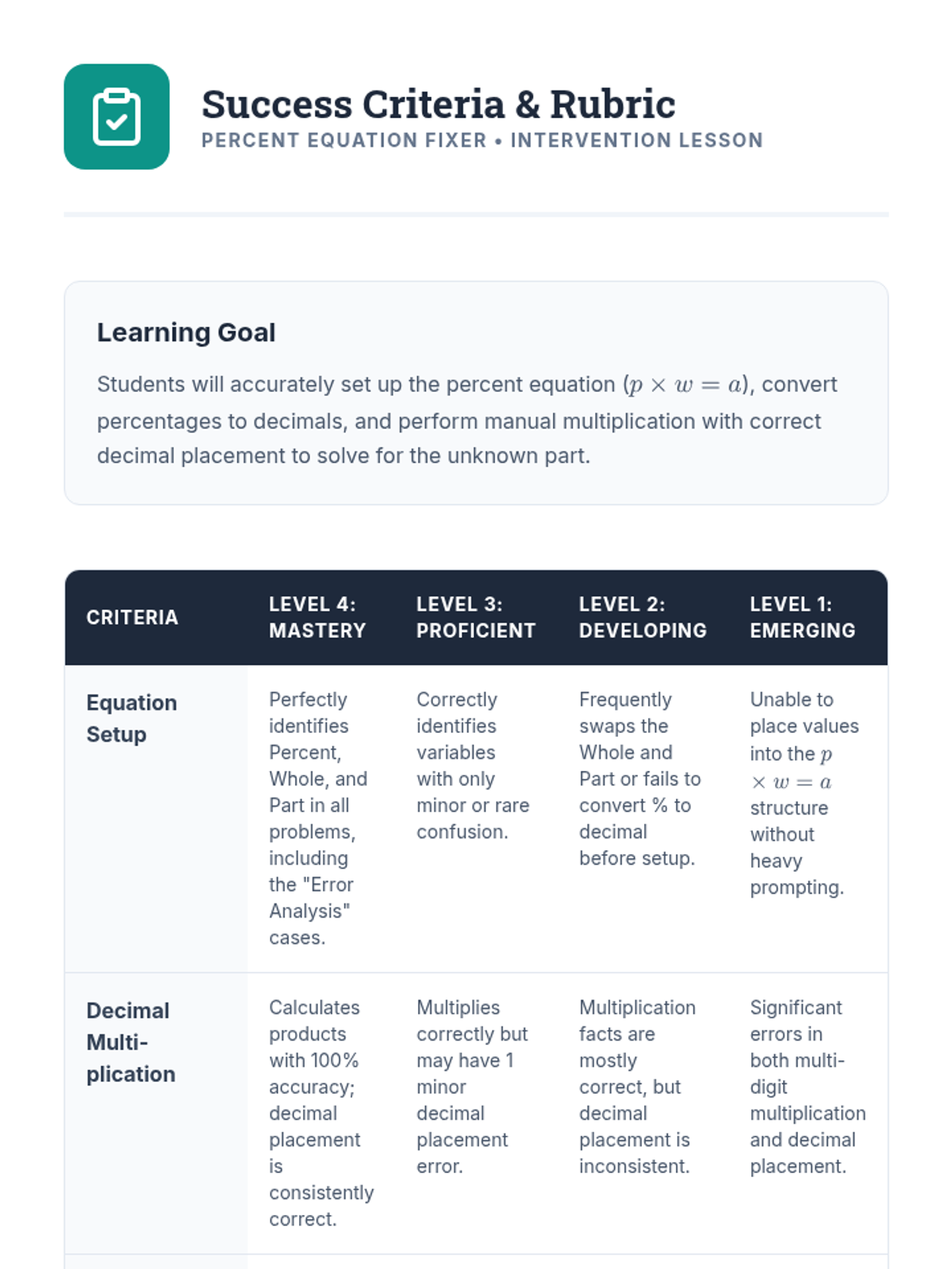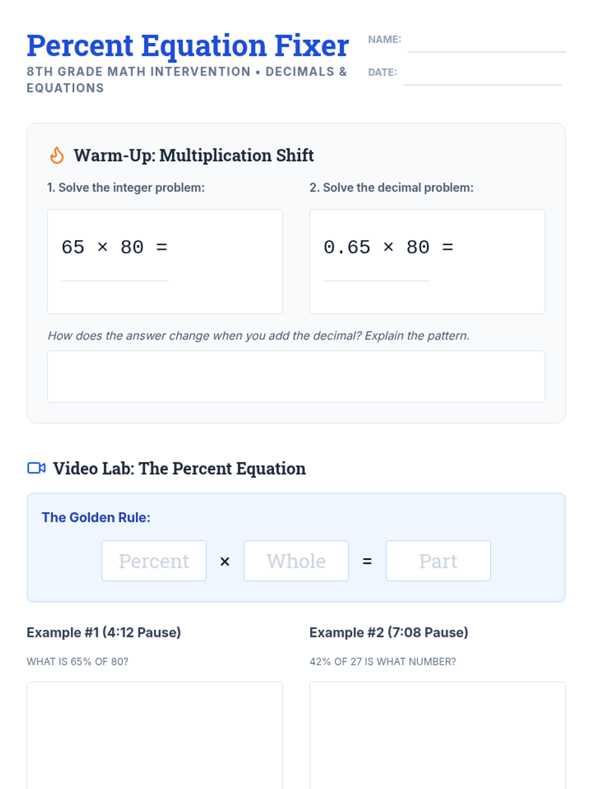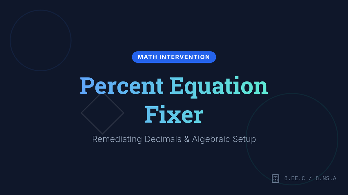 A math intervention lesson focused on mastering the percent equation through video modeling, guided practice, and error analysis to reinforce decimal multiplication and algebraic setup.