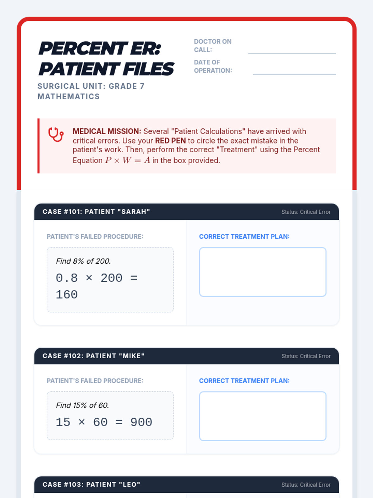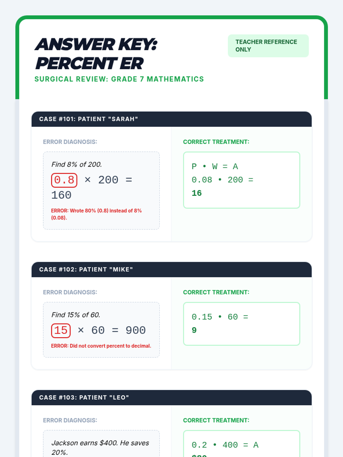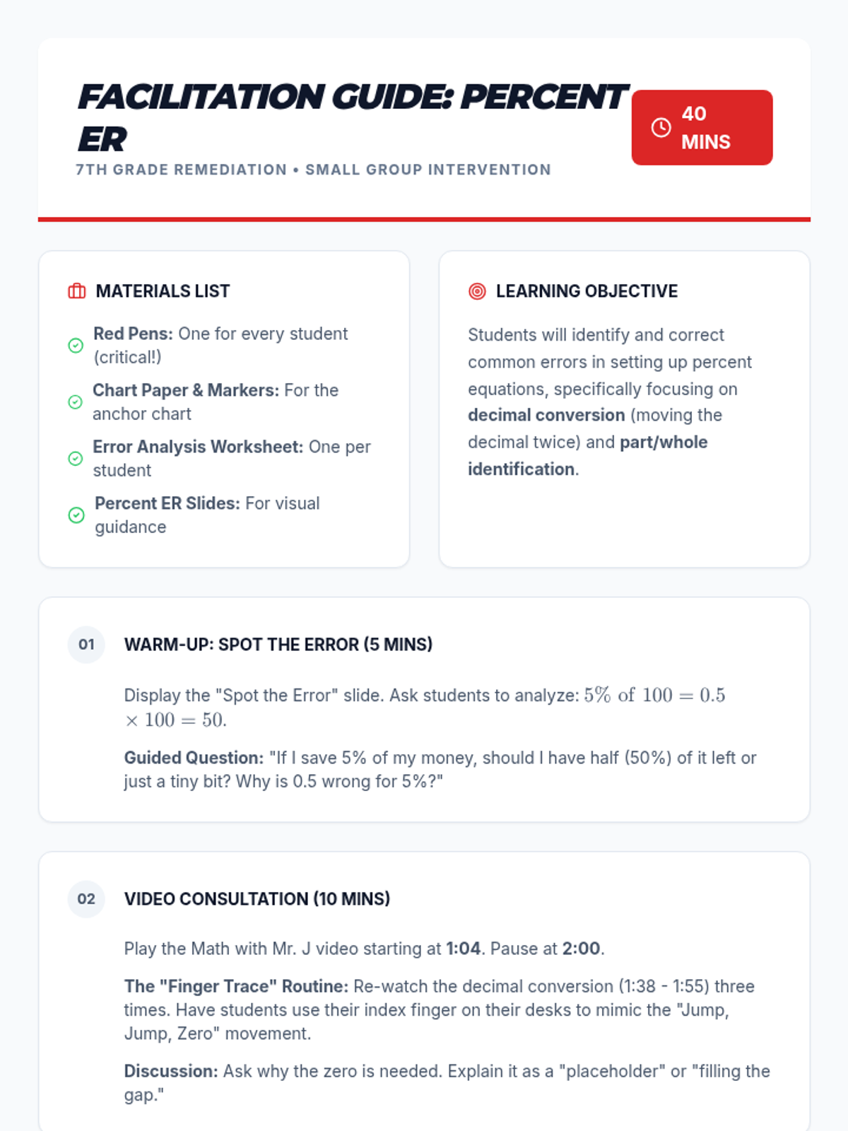 A 7th-grade remediation lesson focused on identifying and correcting common errors in percent equations, specifically decimal conversion and part/whole identification.