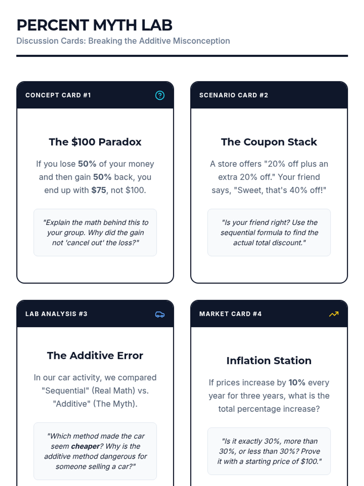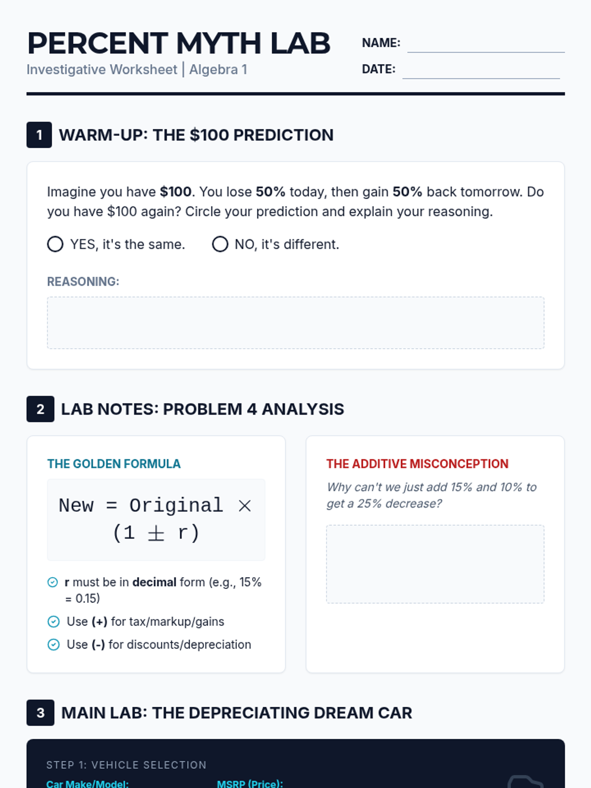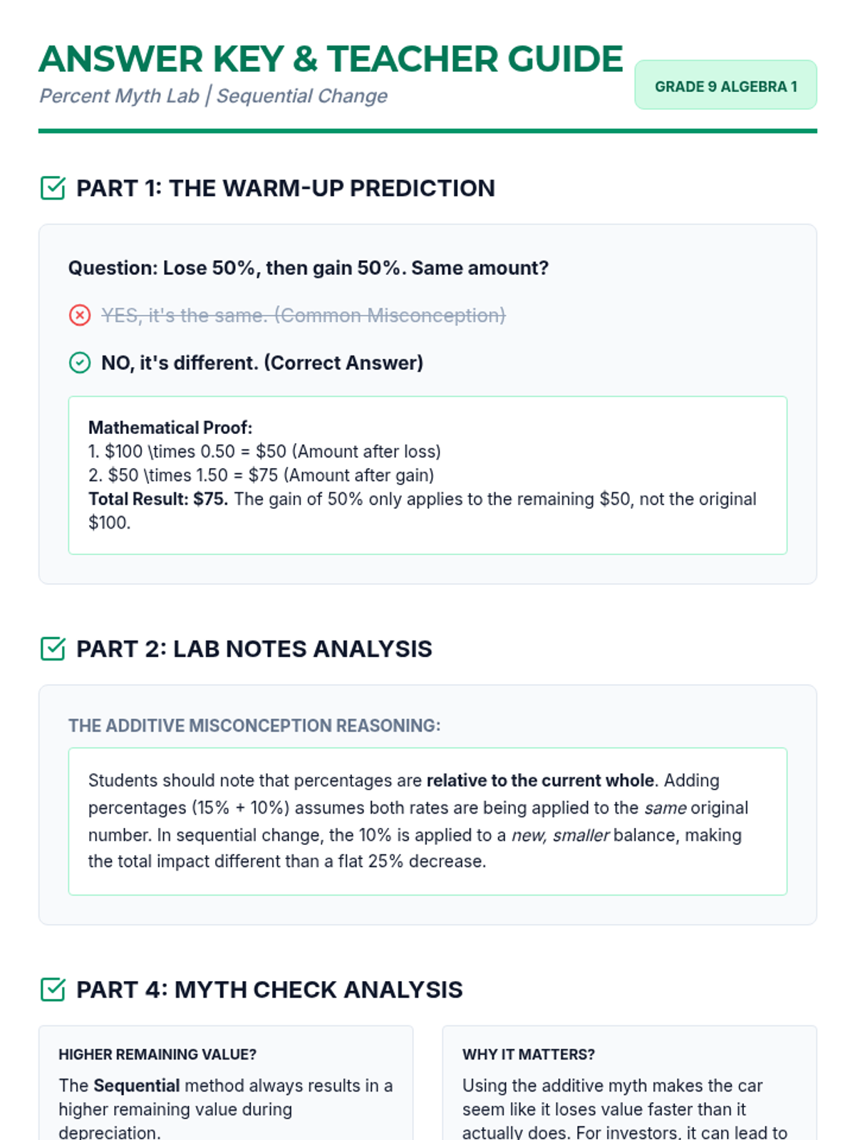 A 9th-grade math lesson focused on sequential percent change, debunking the misconception that percentages can be added together, and applying these concepts to real-world car depreciation and stock market scenarios.