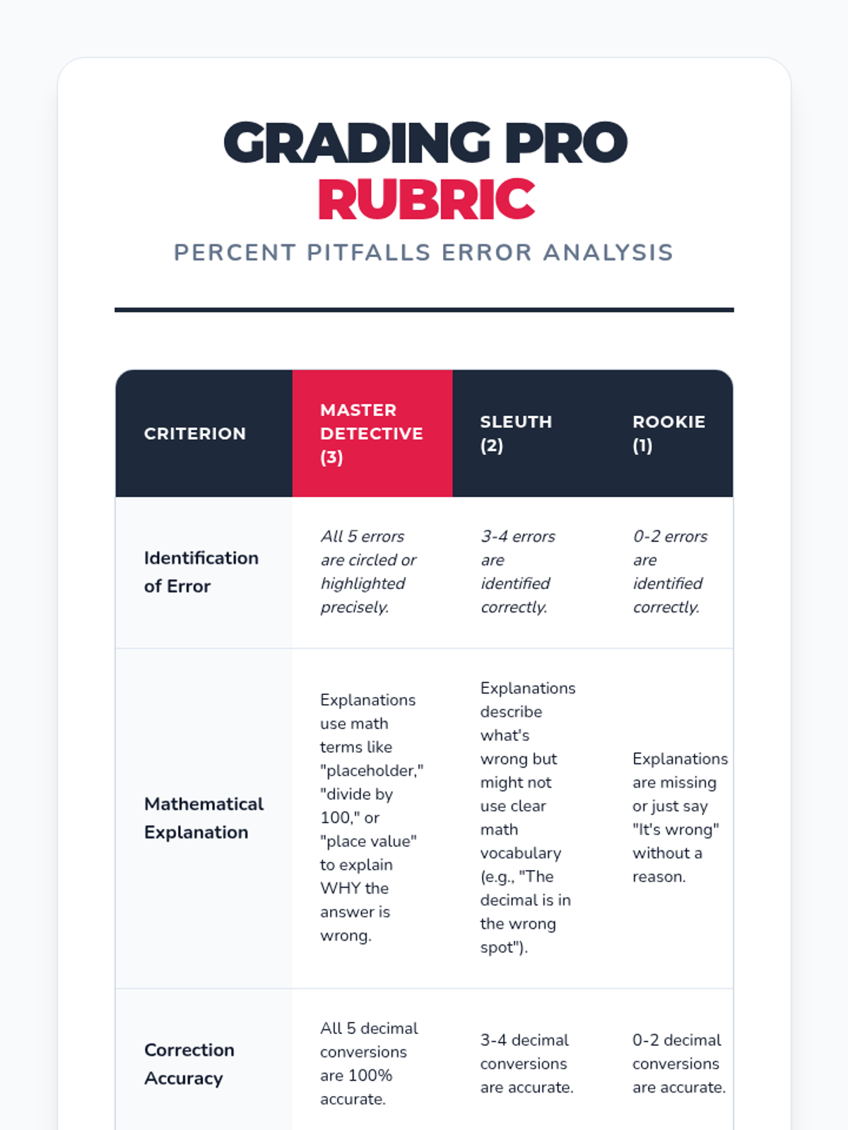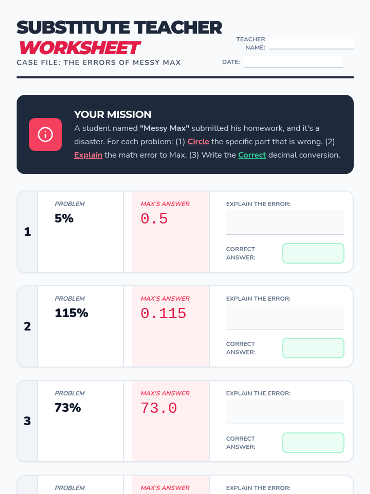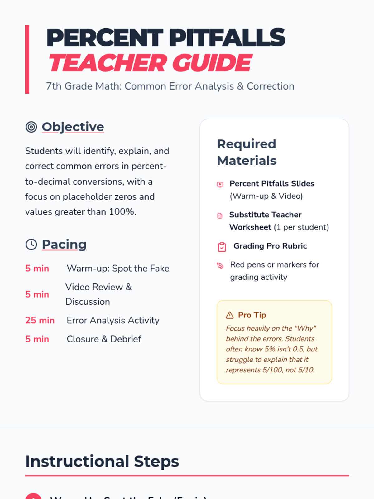 A middle school math lesson focused on identifying and correcting common misconceptions when converting percents to decimals, specifically addressing placeholder zeros and percents greater than 100.