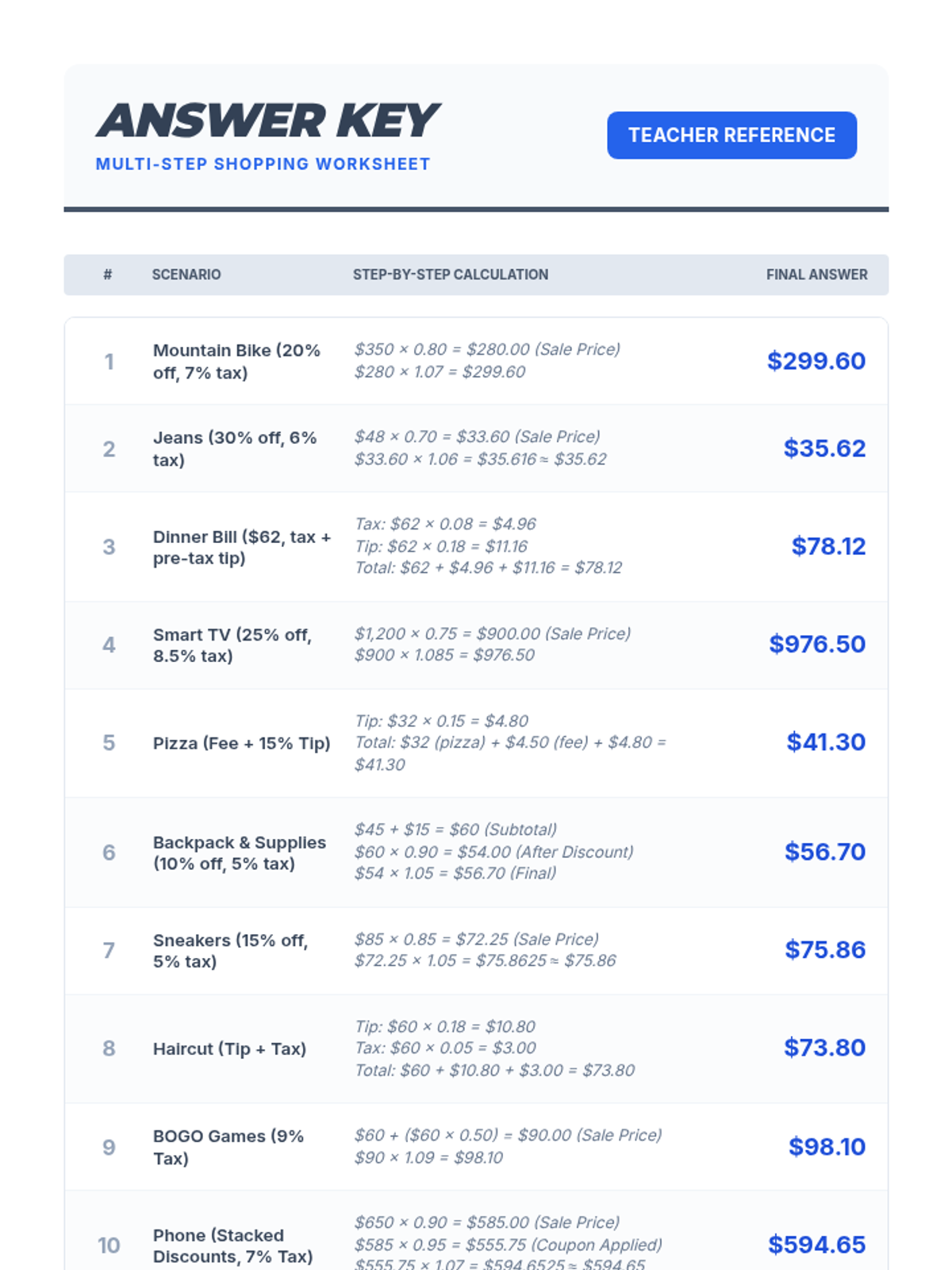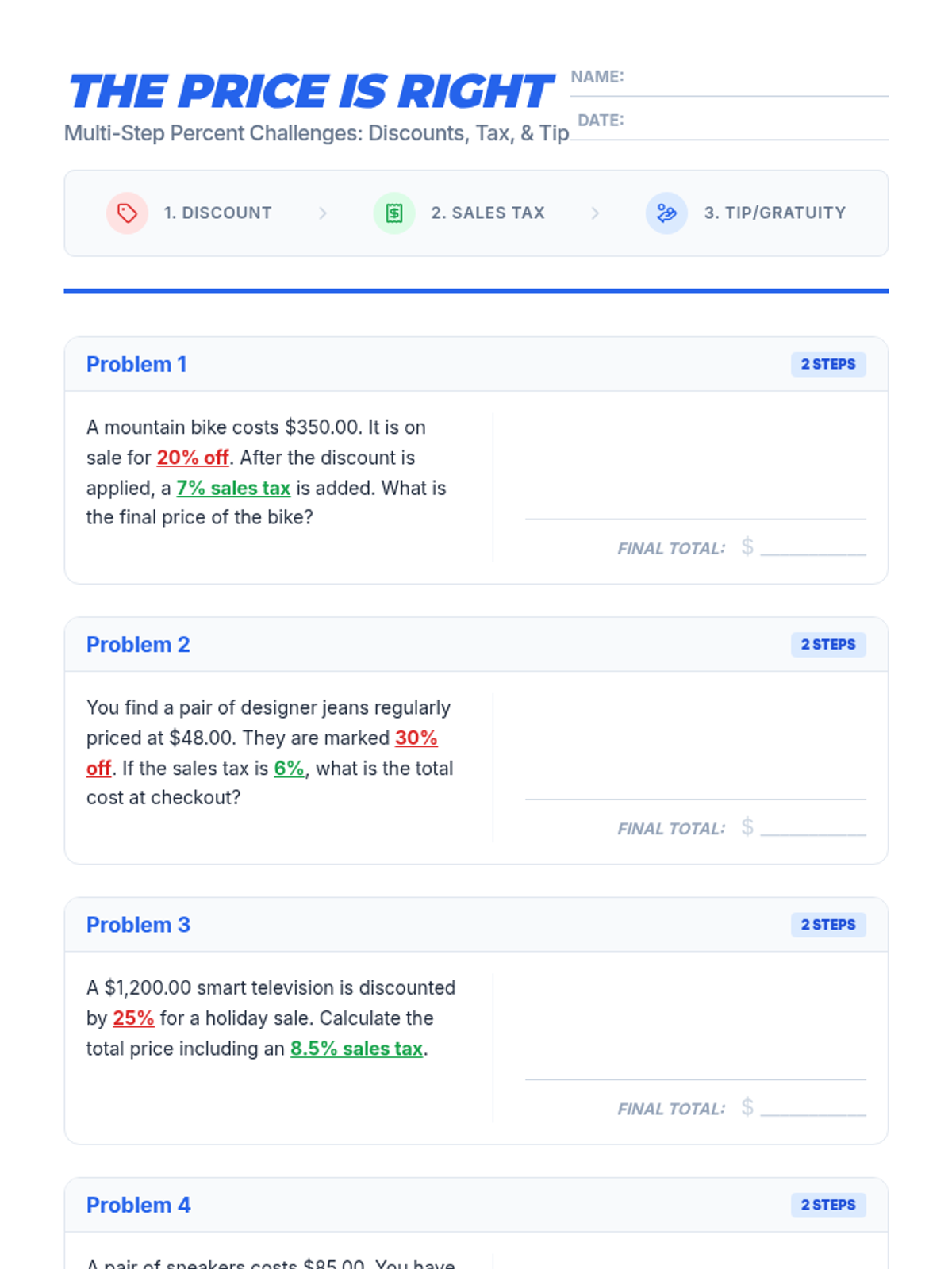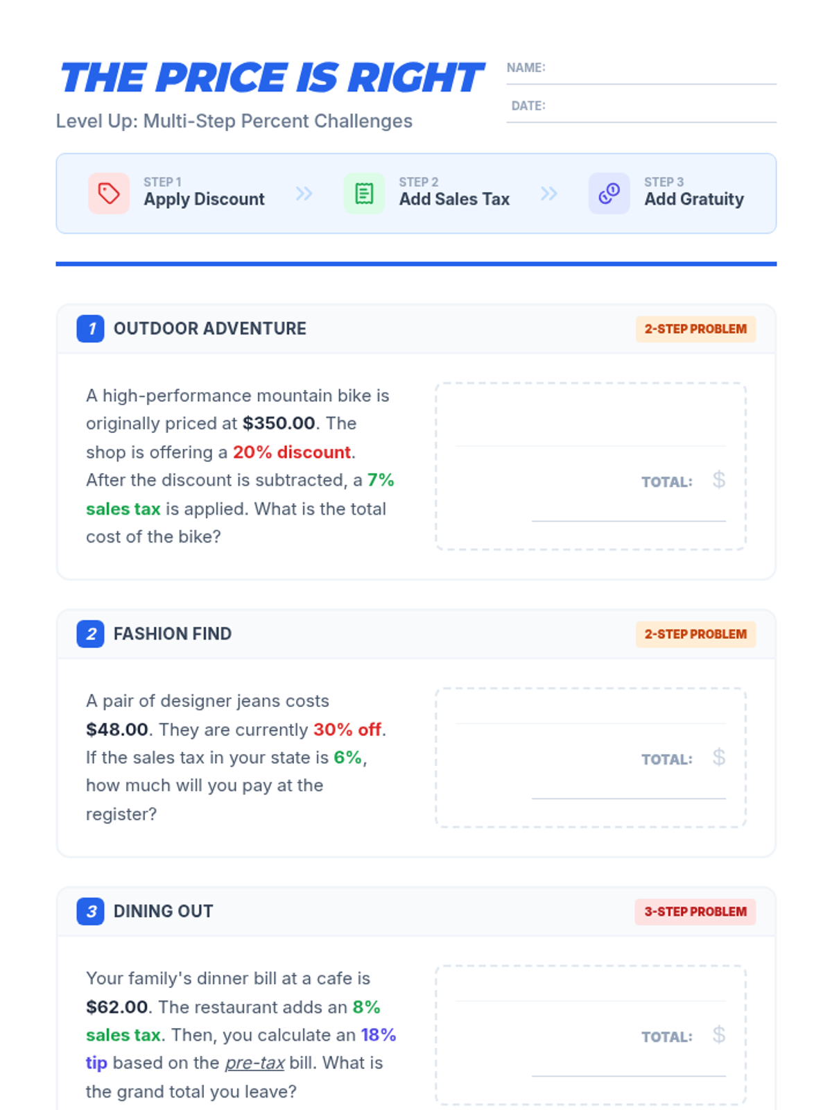 A practical math lesson for 7th-grade students on applying percentages to real-life shopping, including sales tax, gratuity (tip), and store discounts.