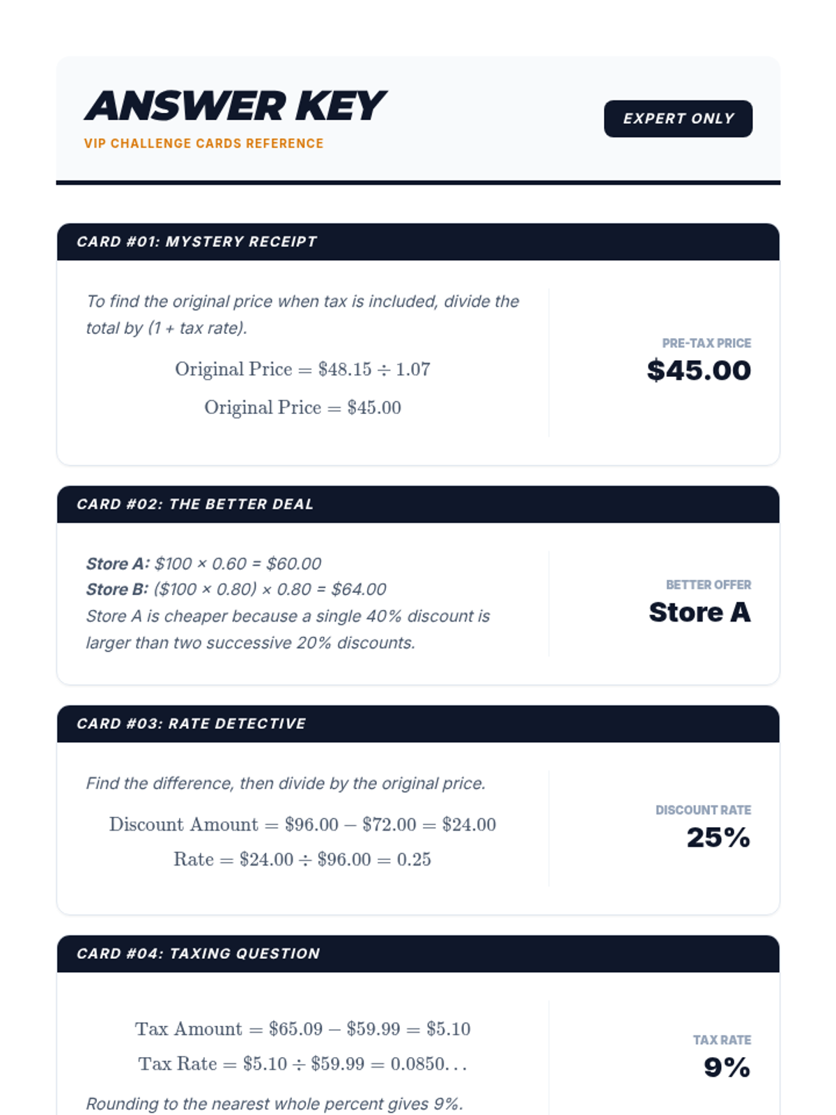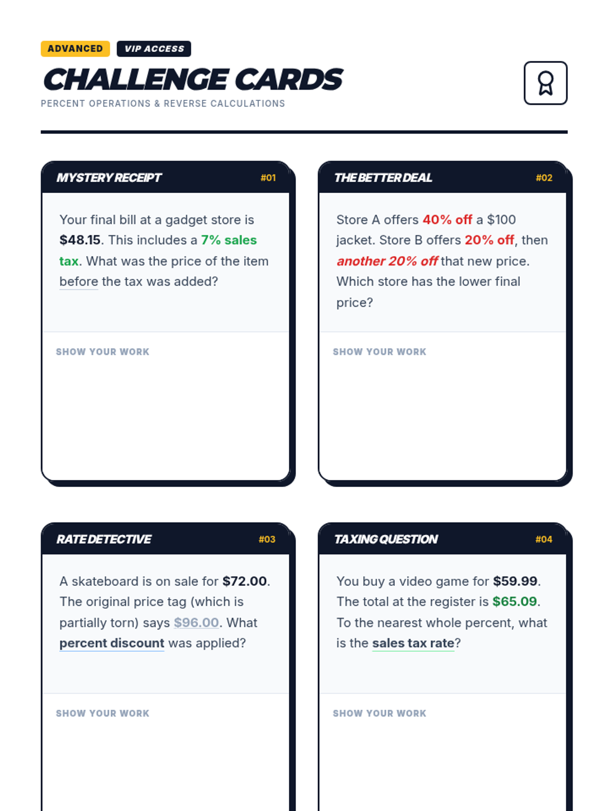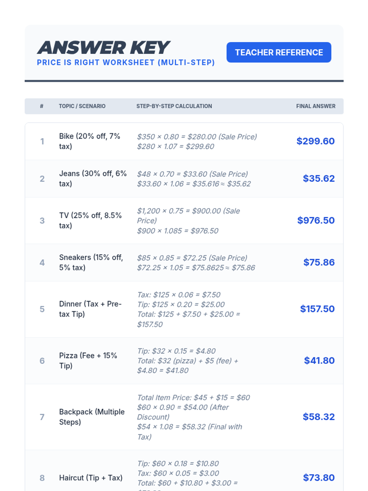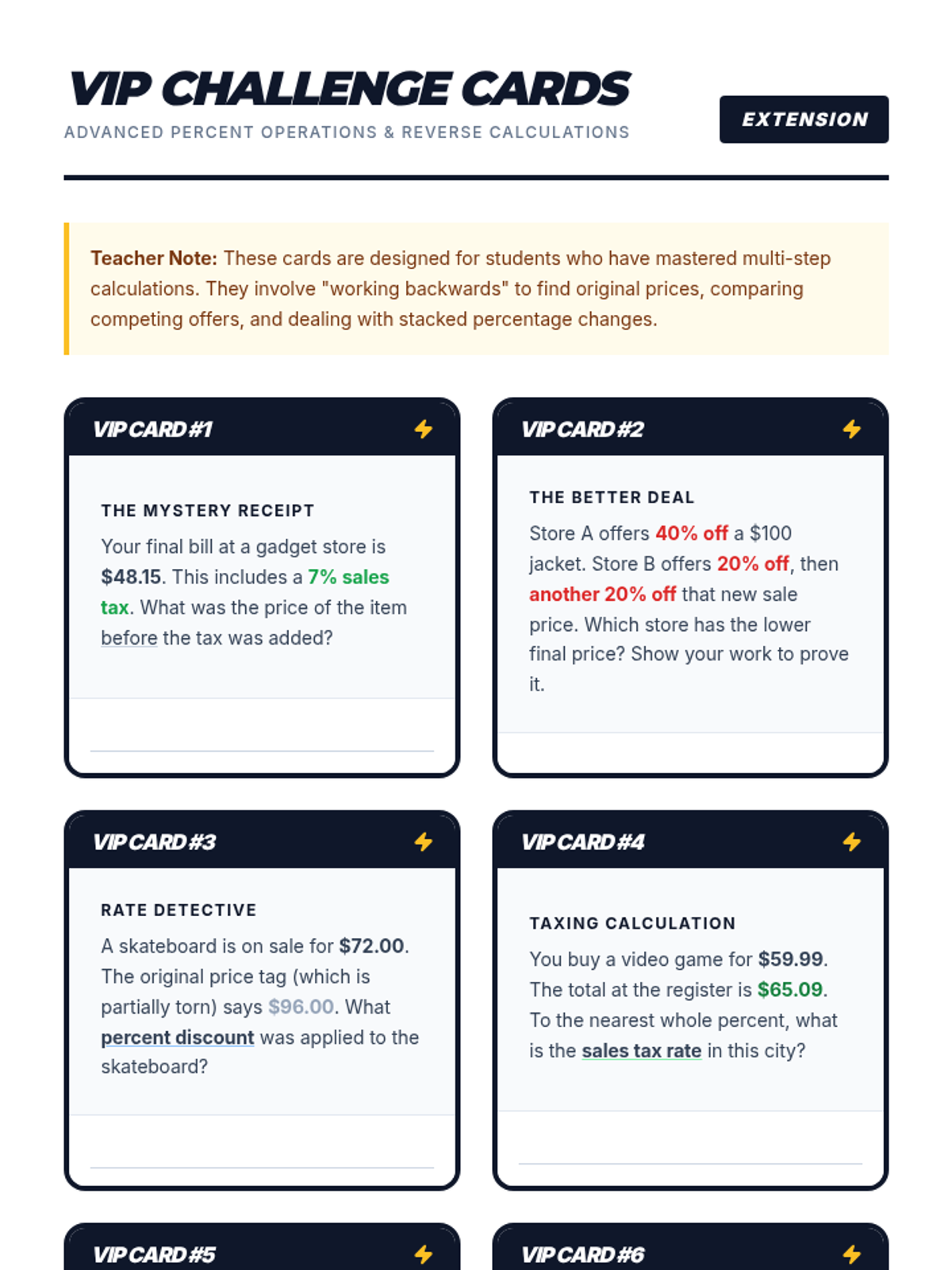 A practical math lesson for 7th-grade students on applying percentages to real-life shopping, including sales tax, gratuity (tip), and store discounts.