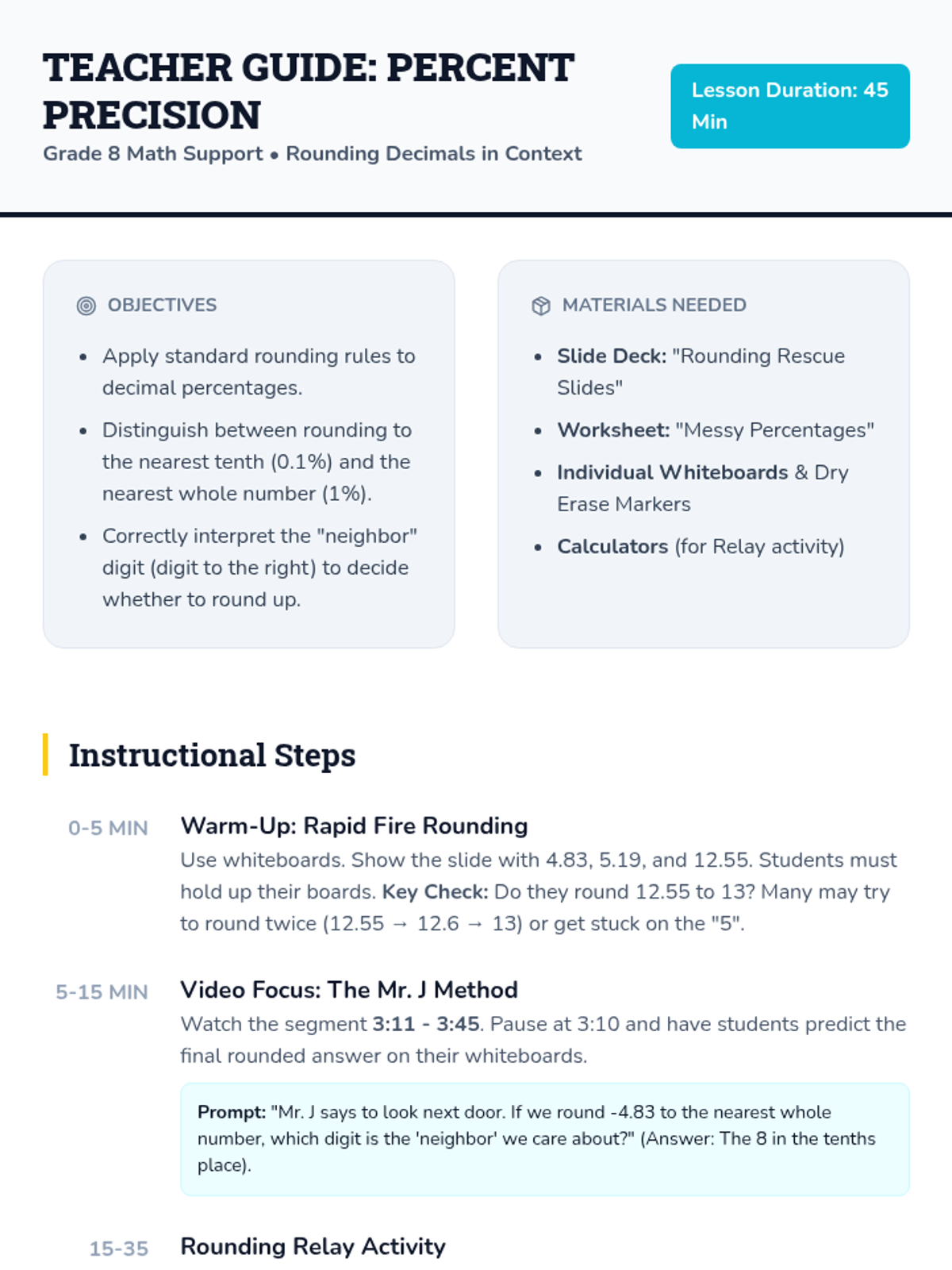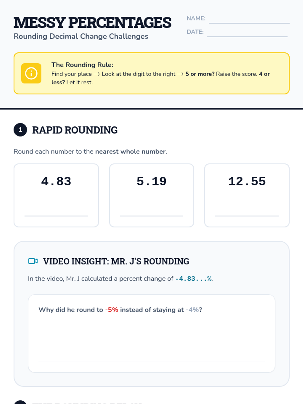 A support lesson focused on rounding decimals to the nearest tenth and whole number within the context of percent change calculations, featuring a video by Mr. J.