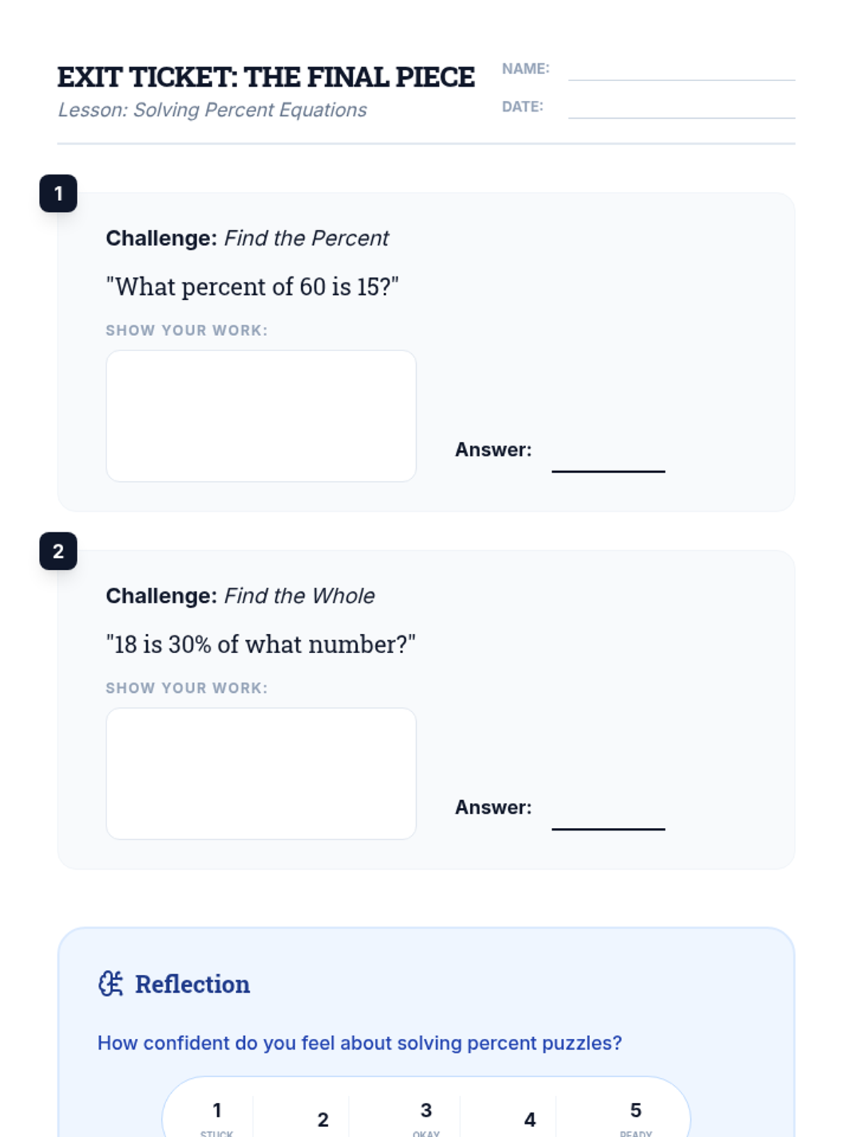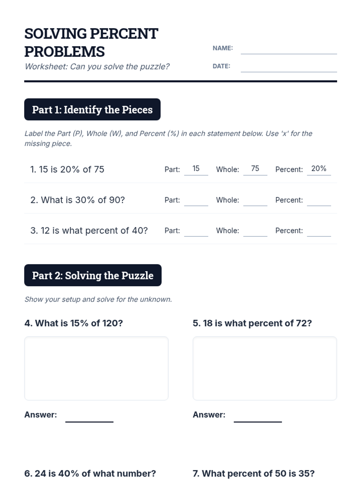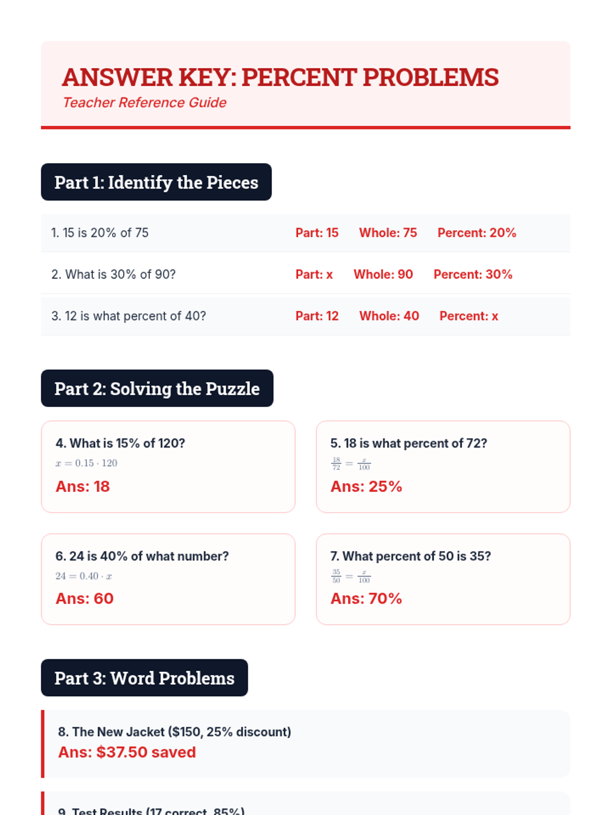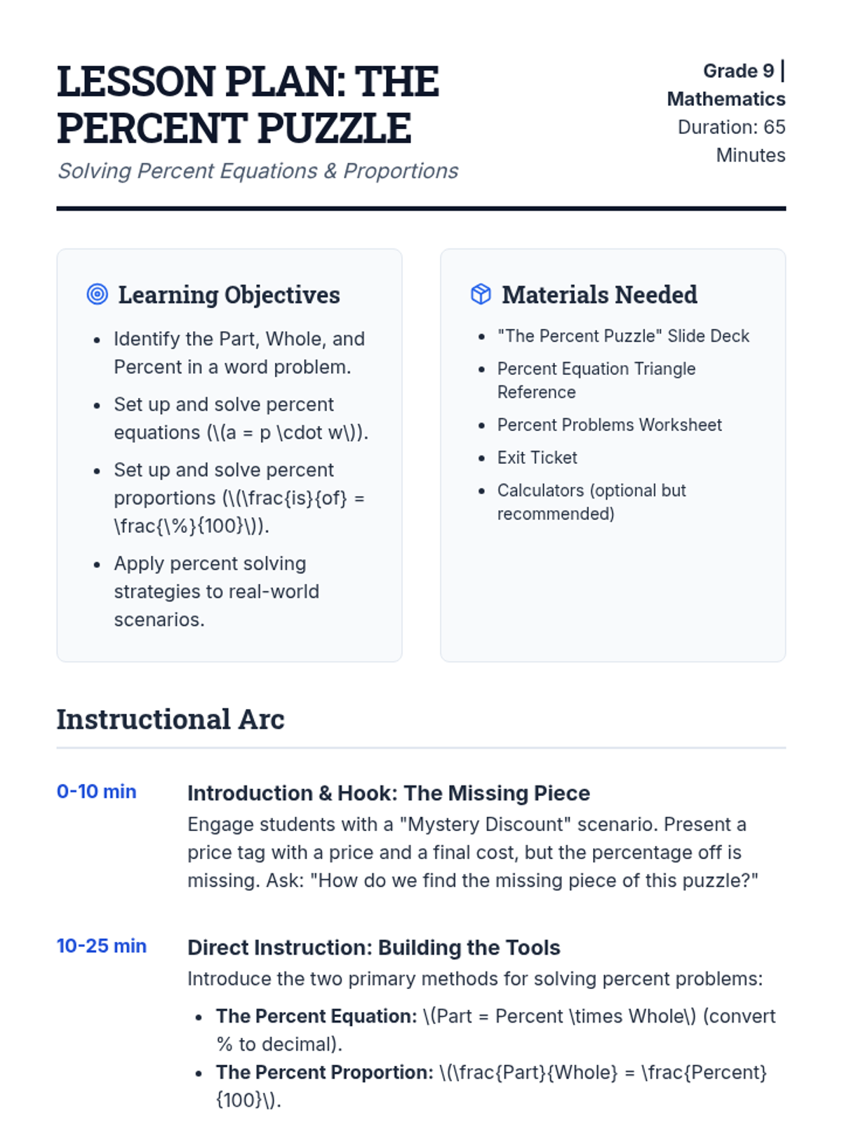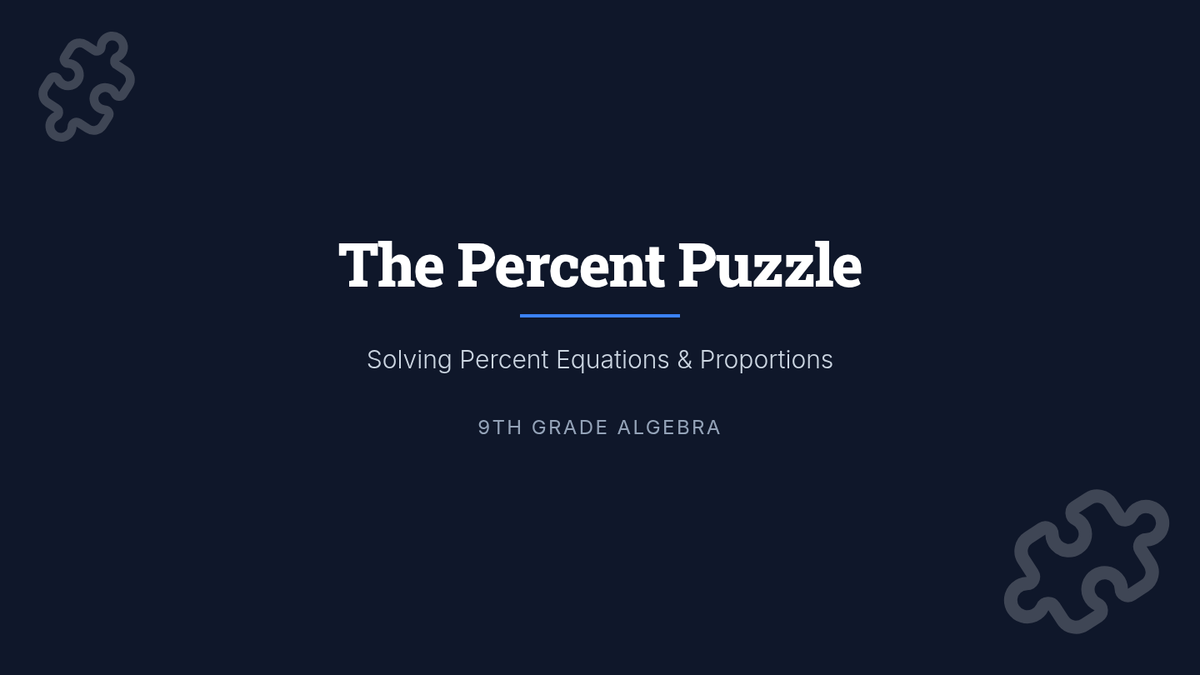 A comprehensive 65-minute lesson for 9th-grade students on solving percent equations and proportions, using a "Percent Puzzle" theme to engage students in finding missing parts, wholes, and percentages.
