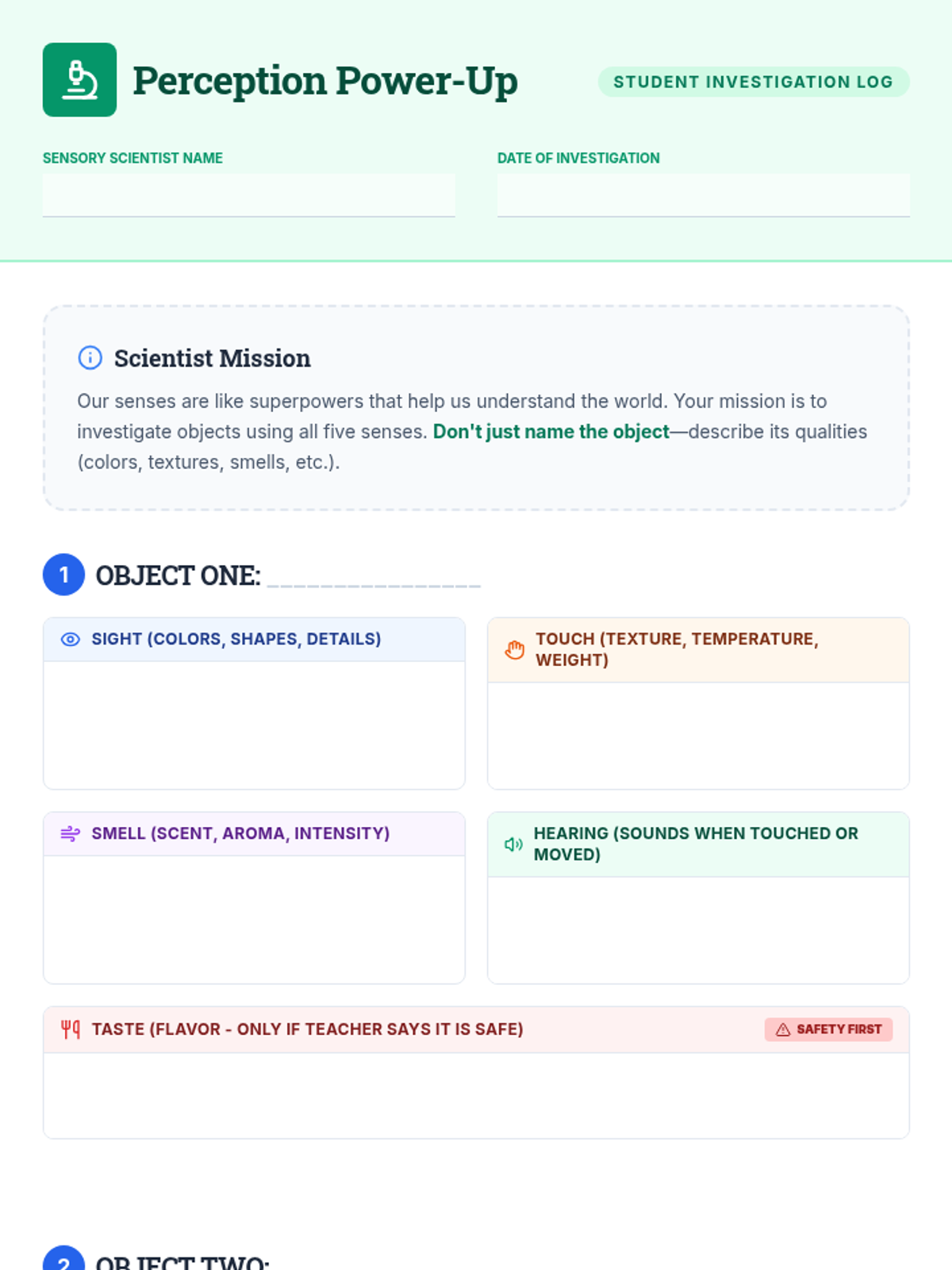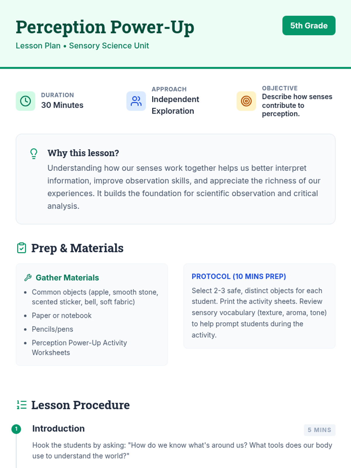 A 30-minute session where 5th-grade students become 'Sensory Scientists' to investigate how their five senses work together to shape their perception of common objects.