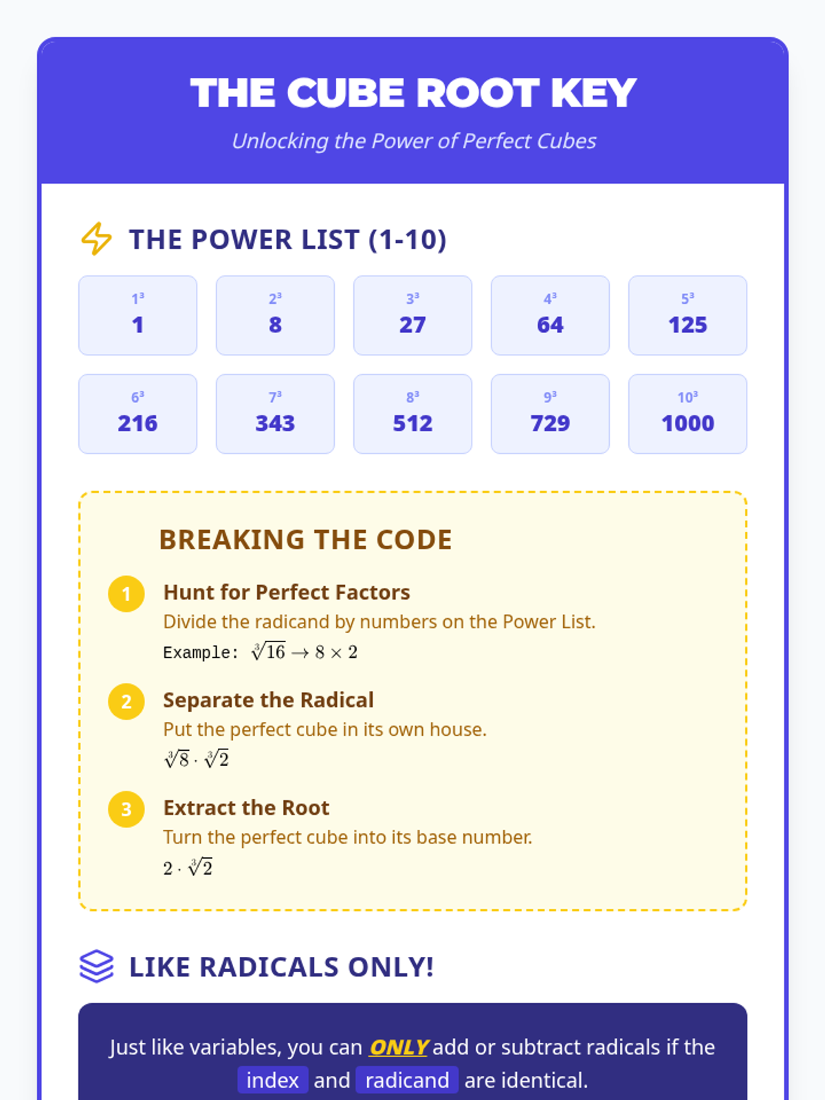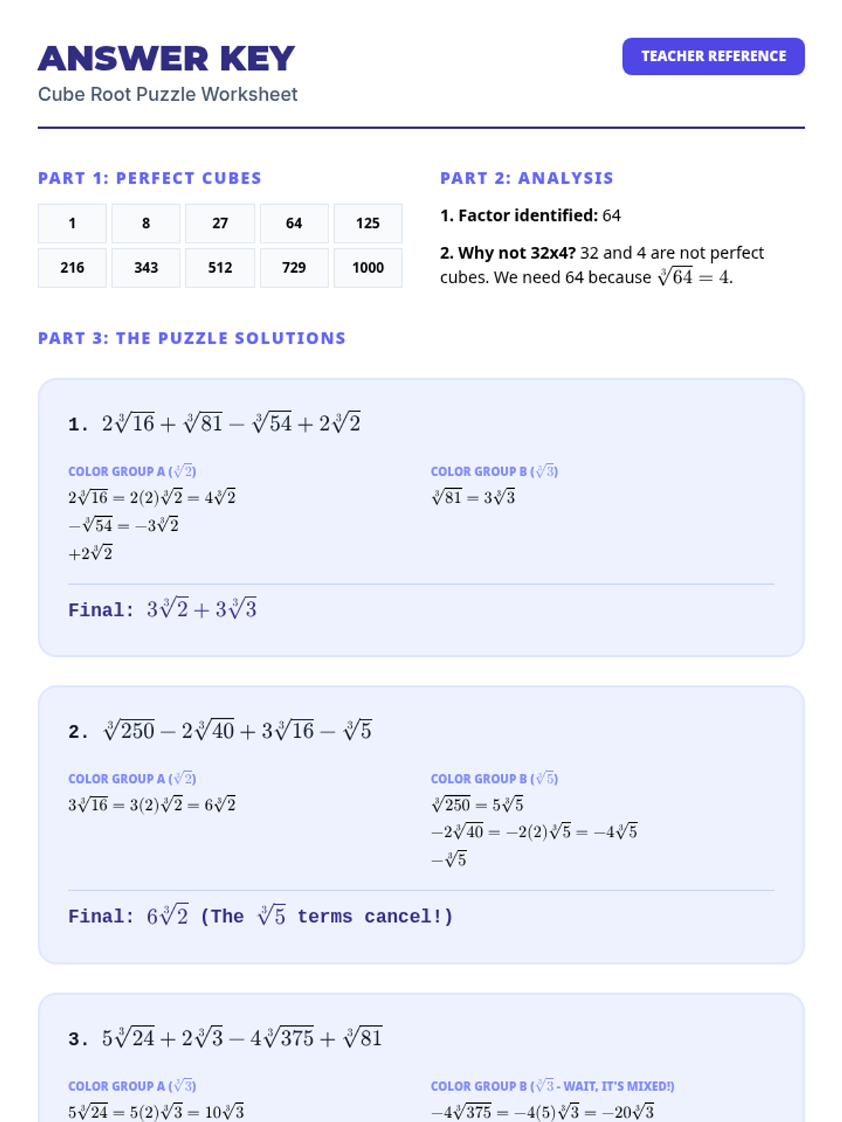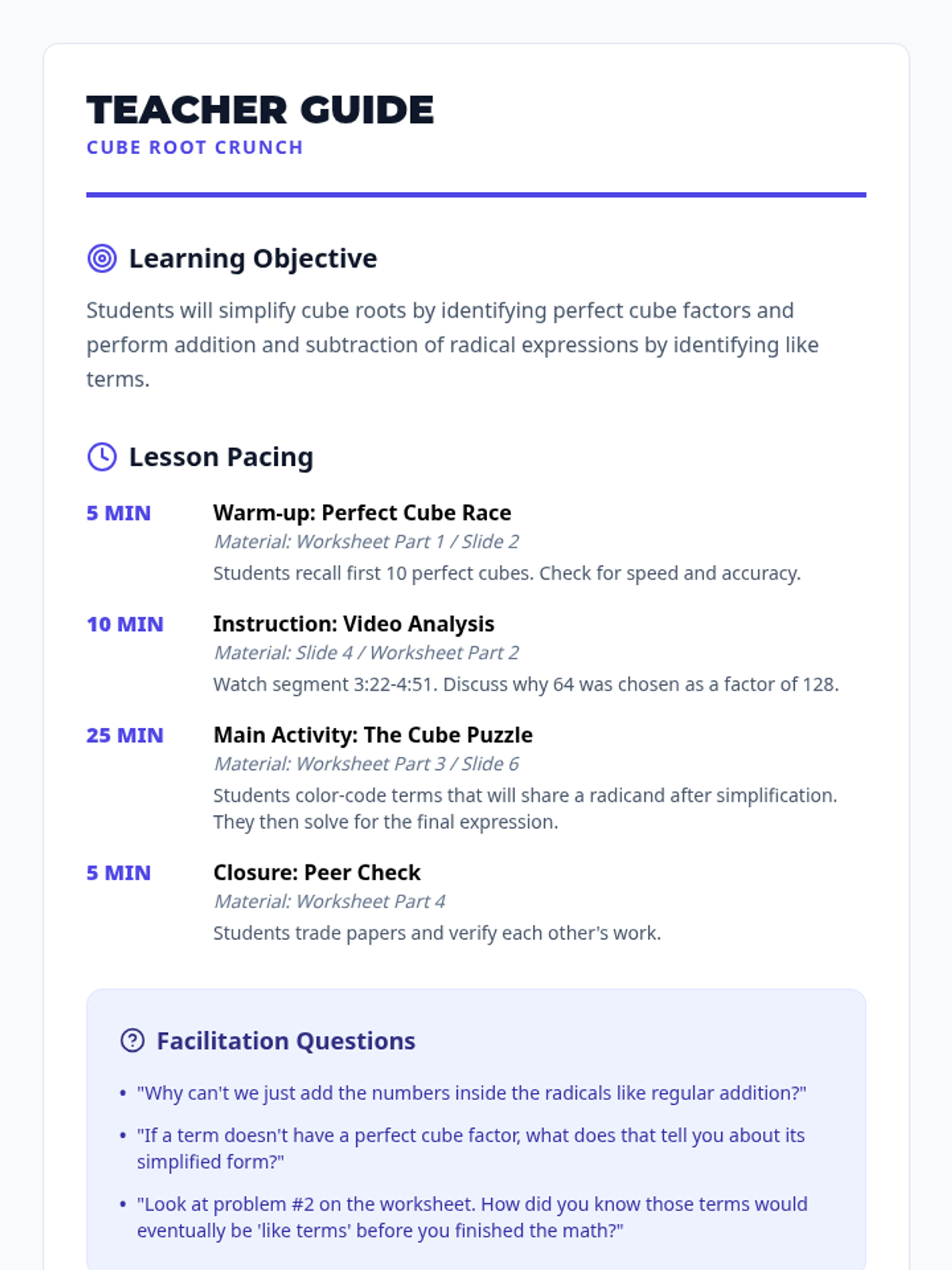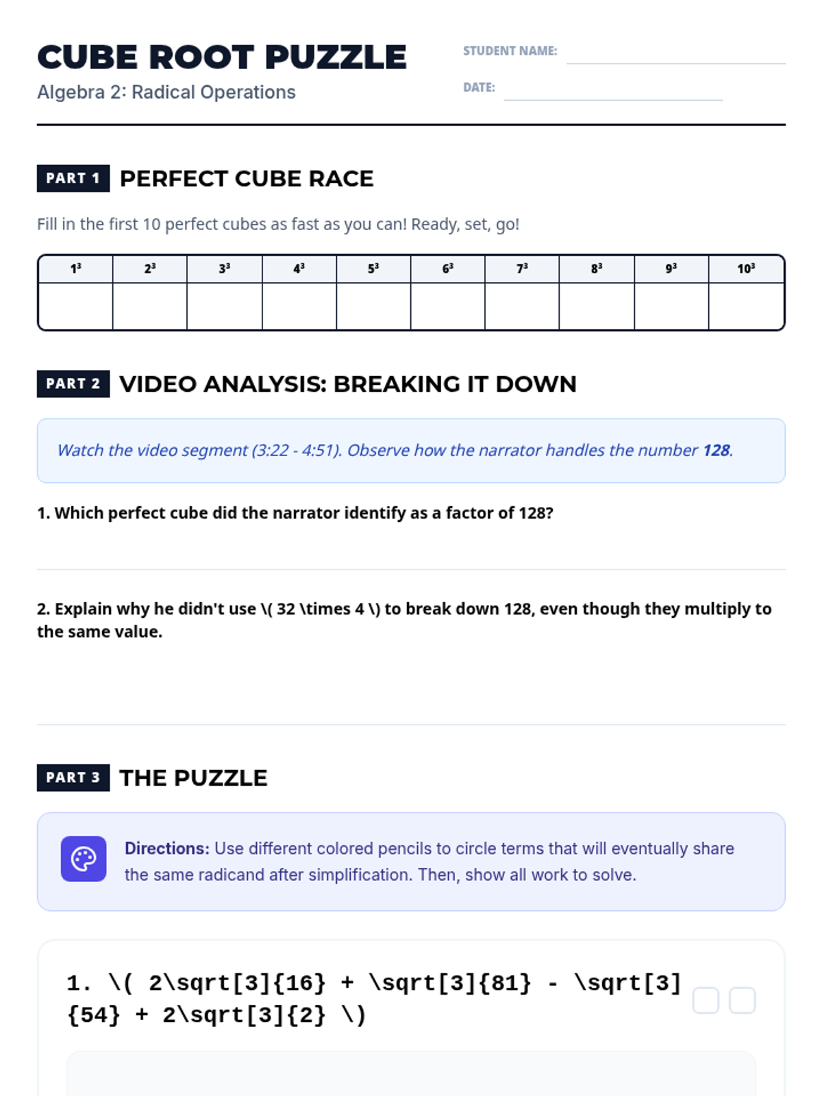 A comprehensive lesson for Algebra 2 students focused on identifying perfect cubes and performing operations with cube roots, featuring a video analysis and a color-coded simplification activity.
