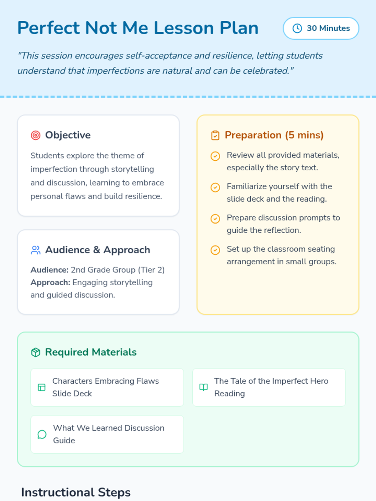 A 30-minute Tier 2 group lesson for 2nd grade students focused on self-acceptance and resilience through the story of an 'imperfect' hero. Students explore why flaws are strengths and how to embrace their own unique qualities.