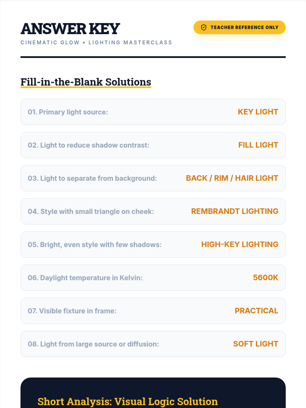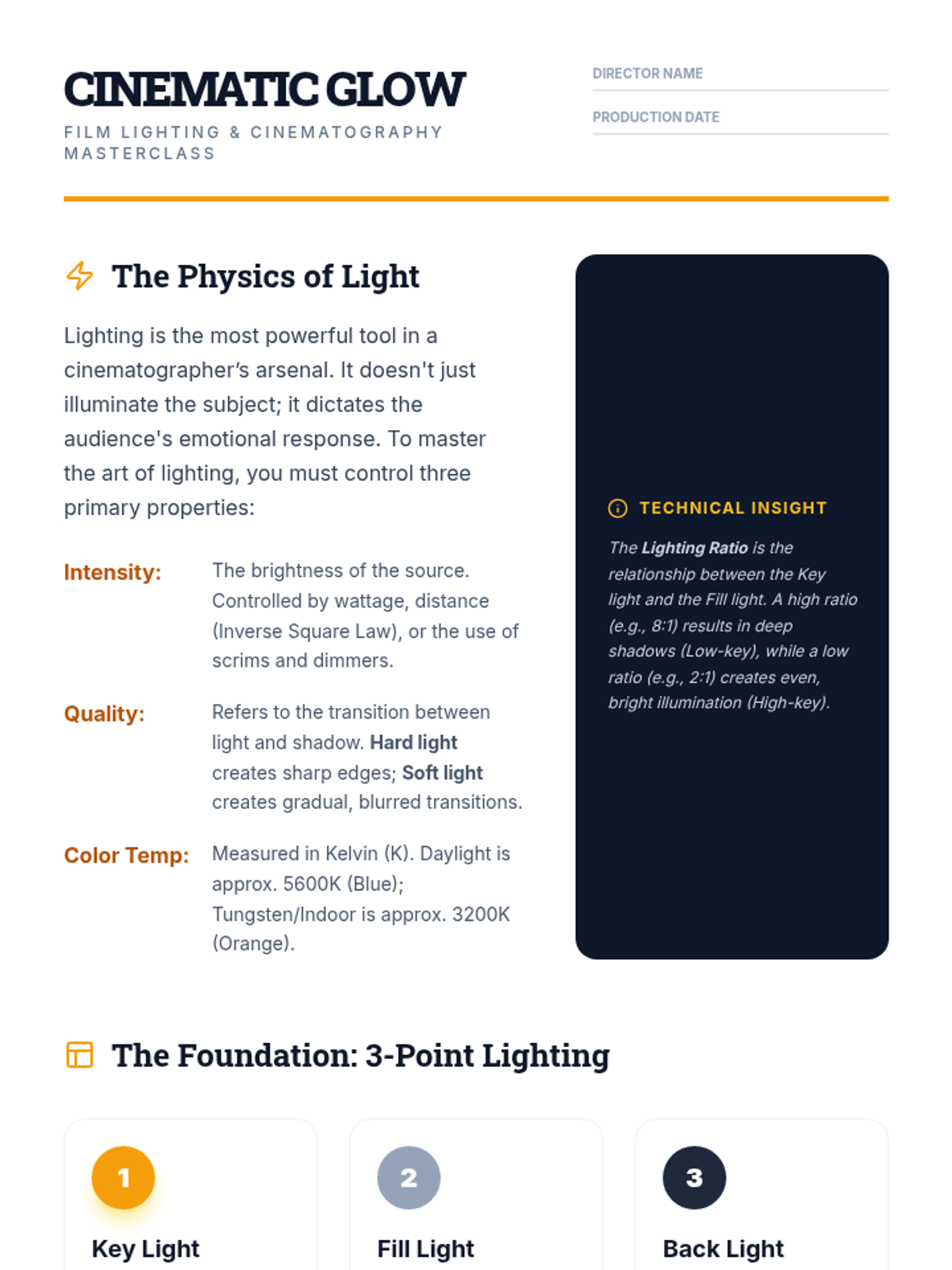 A deep dive into cinematic lighting, from the physics of light and 3-point setups to professional styles like Rembrandt and Butterfly lighting, including a hands-on assessment.