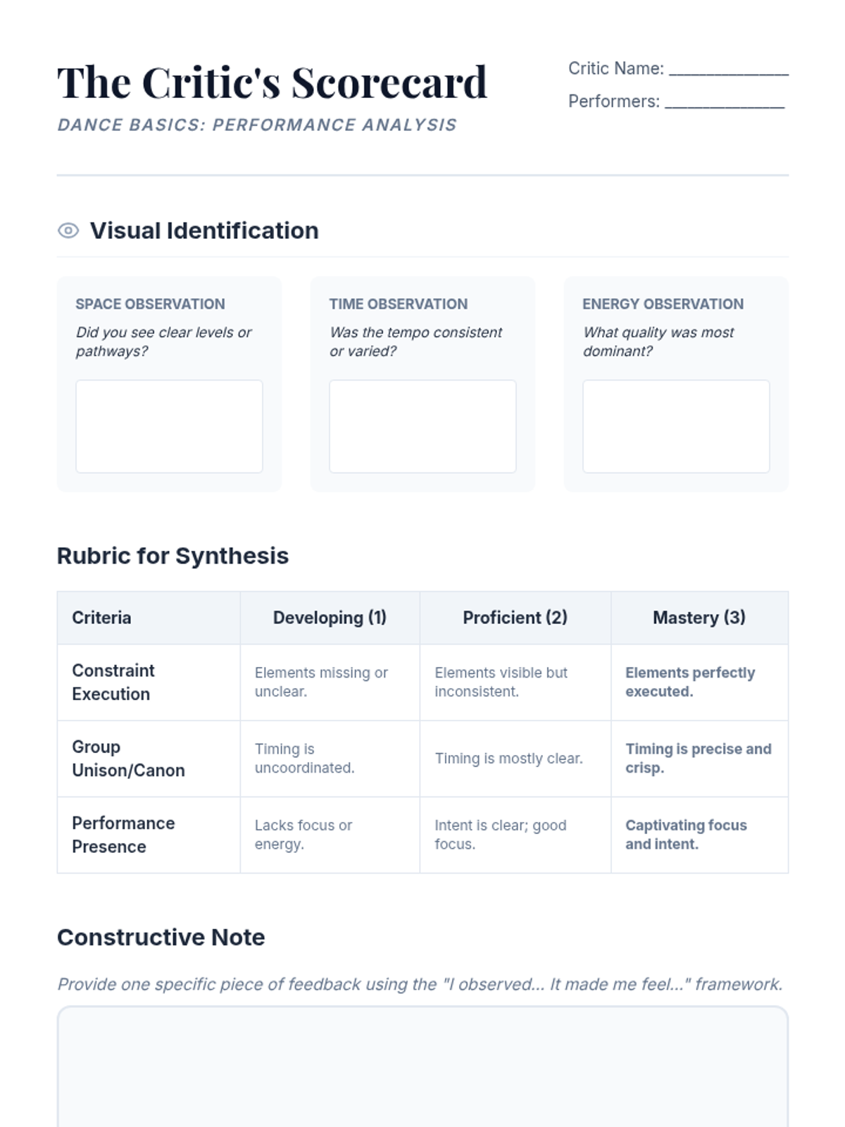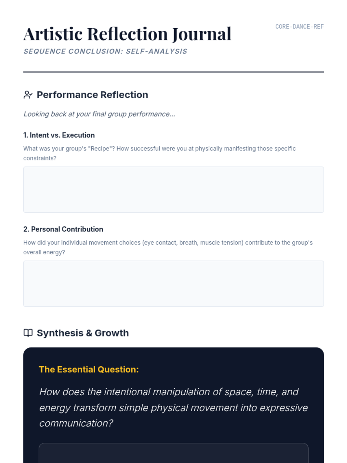 Performance of student phrases followed by structured peer critique and artistic reflection.