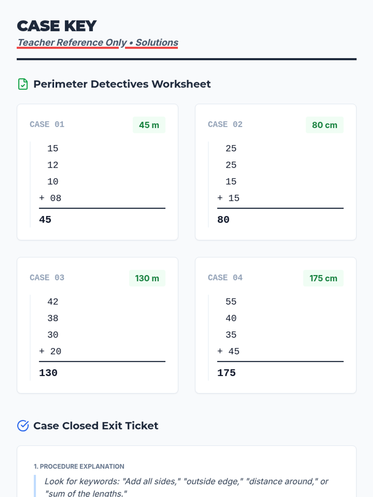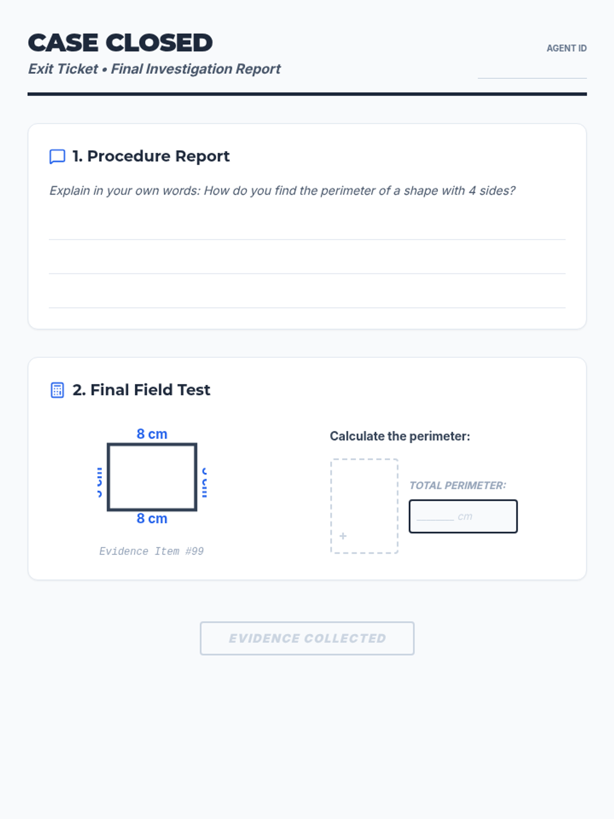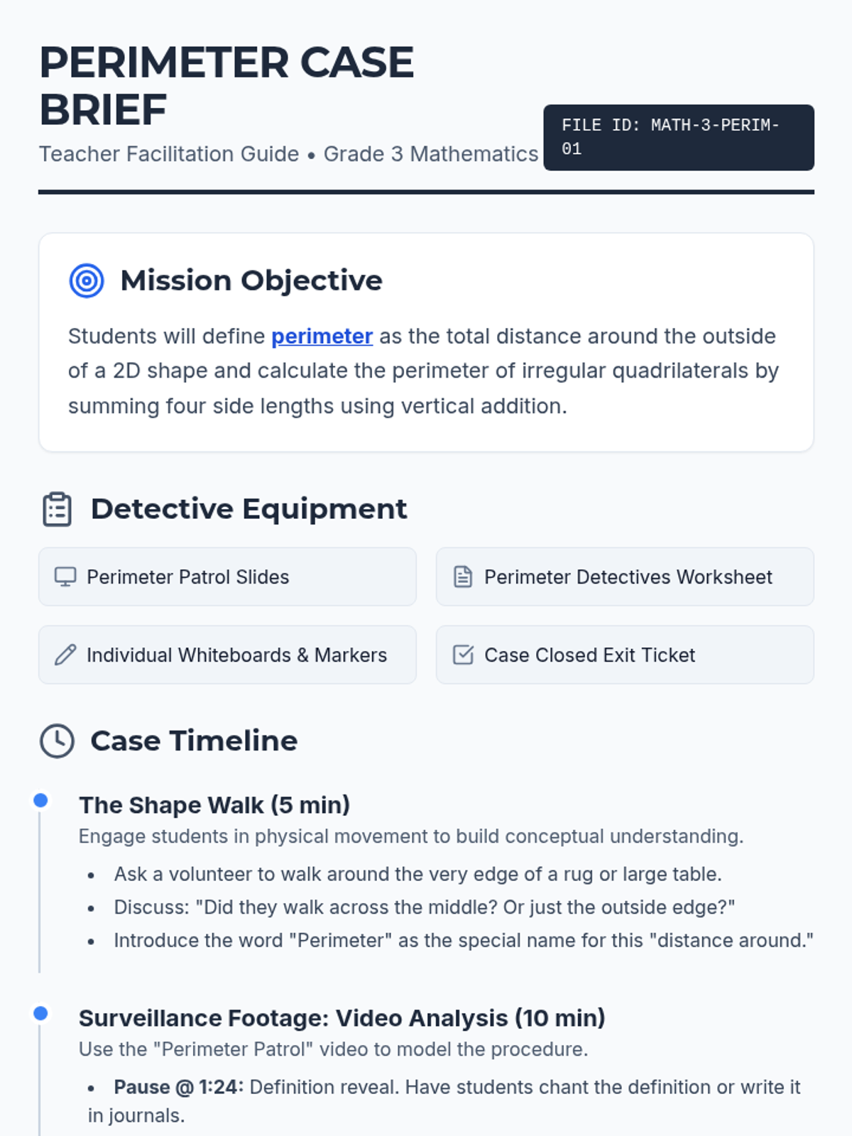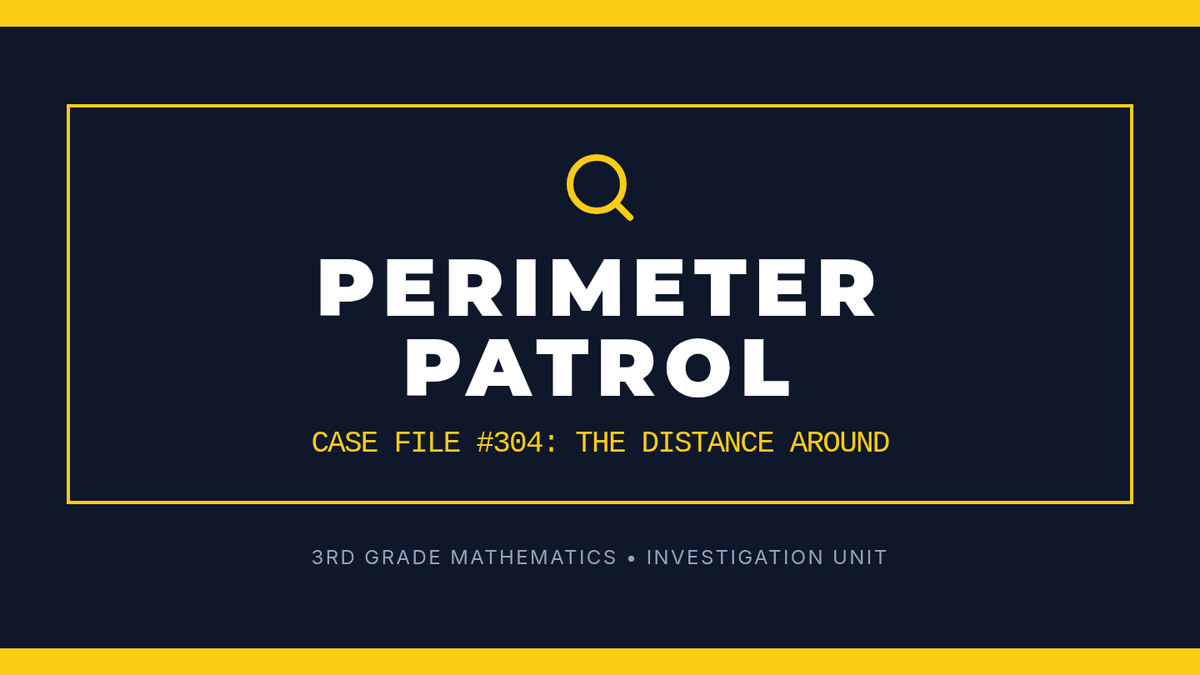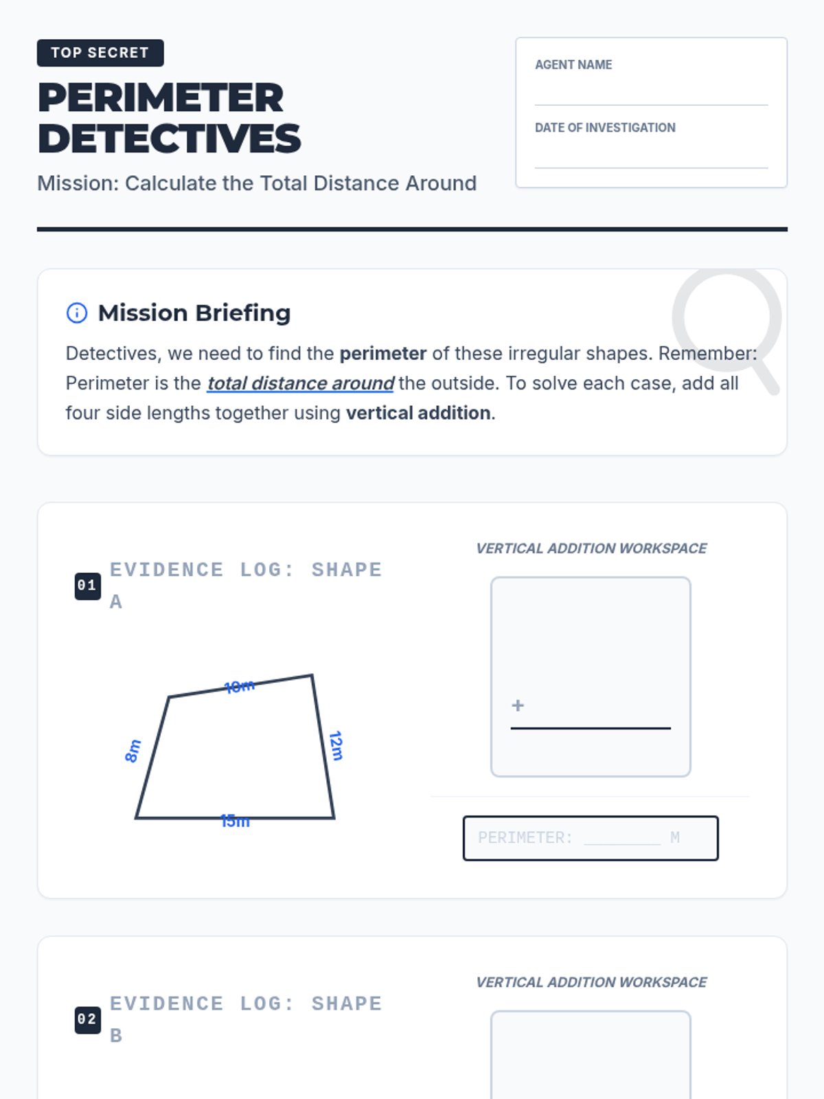 Students will investigate perimeter as the 'distance around' a shape. They will watch a guided video lesson, solve practice problems, and complete a detective-themed worksheet calculating the perimeter of irregular quadrilaterals using vertical addition.