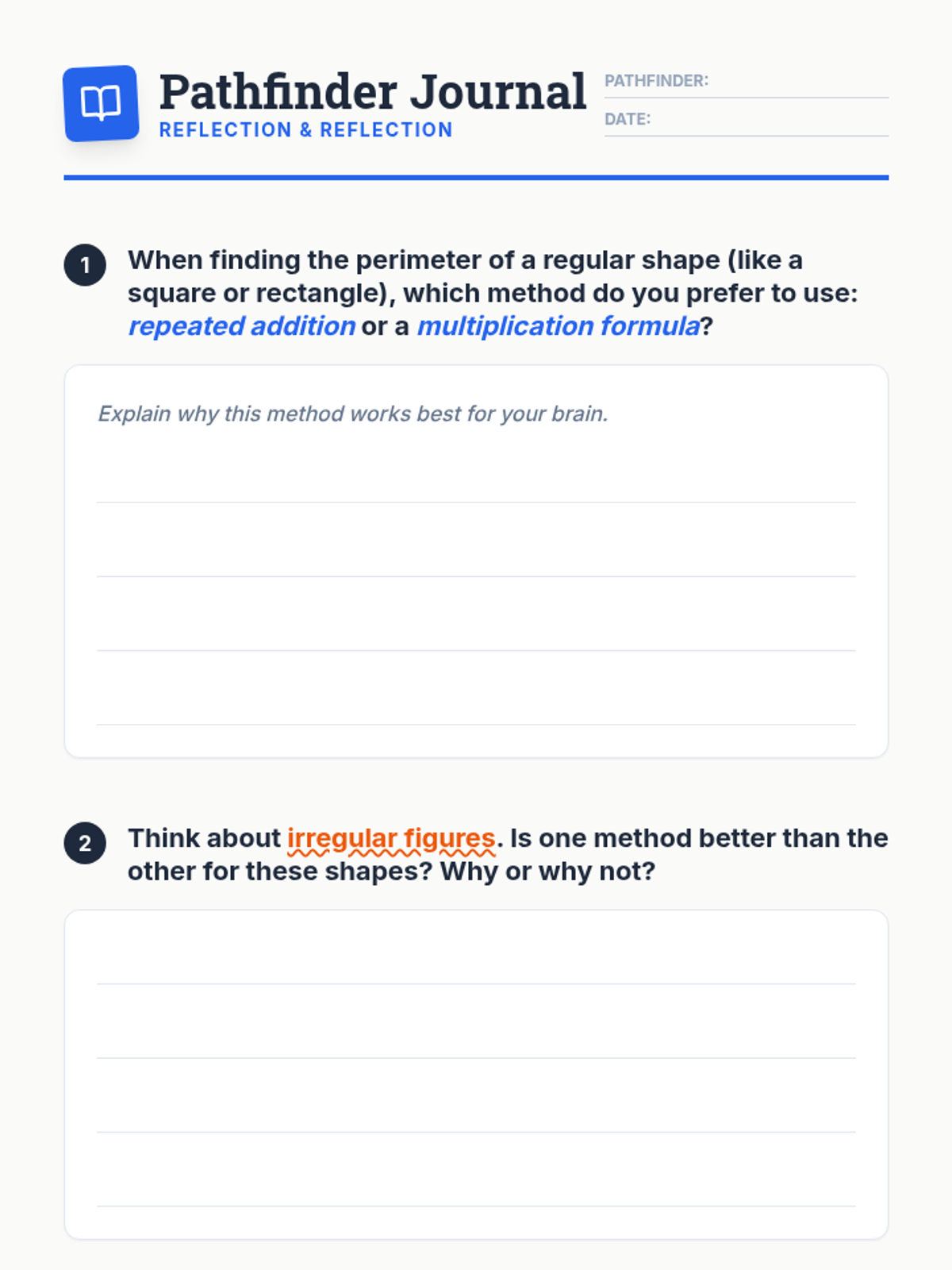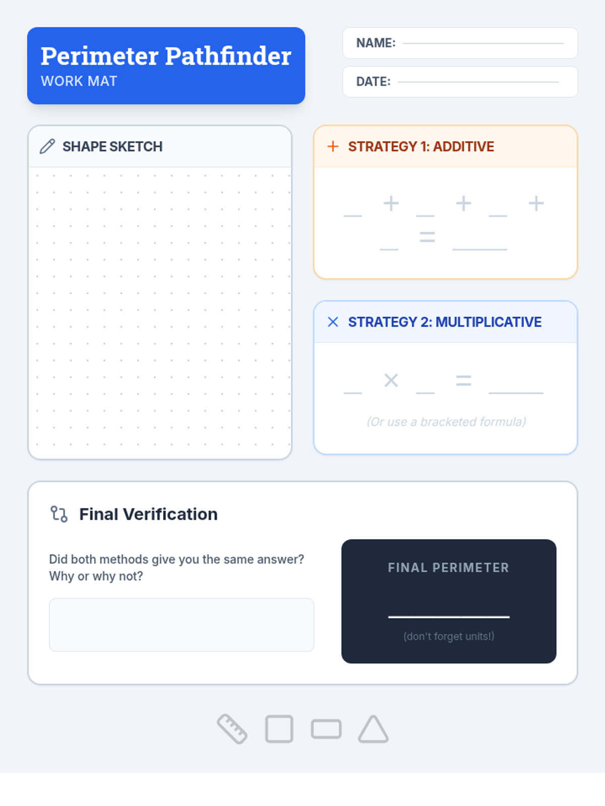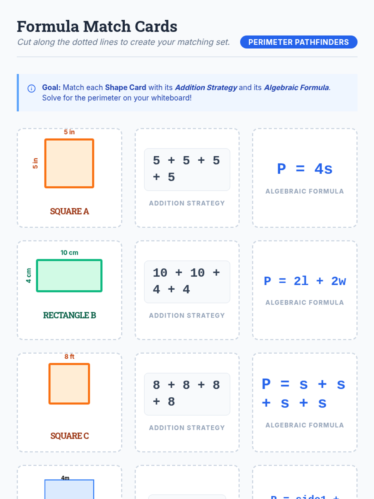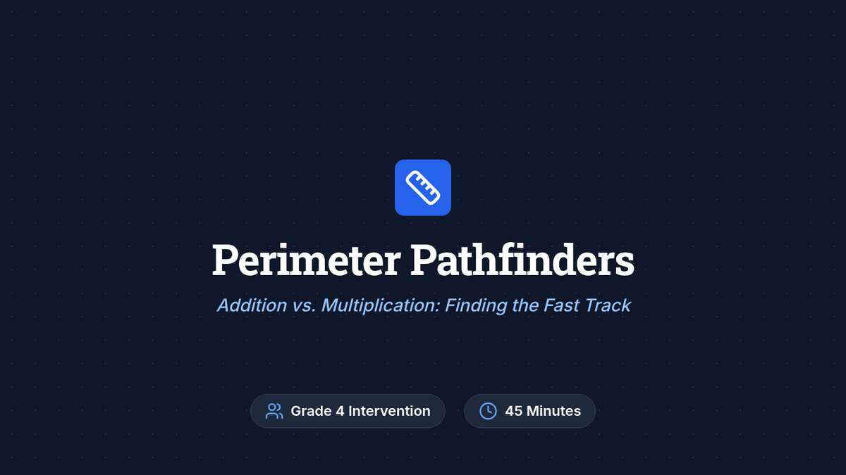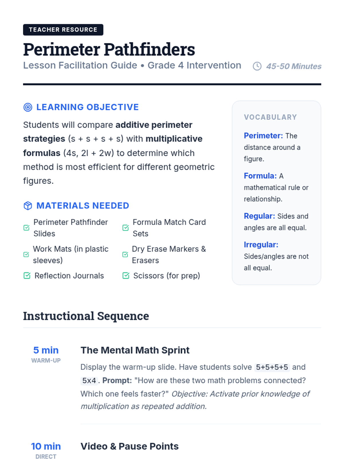 A 4th-grade intervention lesson comparing additive perimeter strategies with multiplicative formulas, using visual shapes and real-world connections.