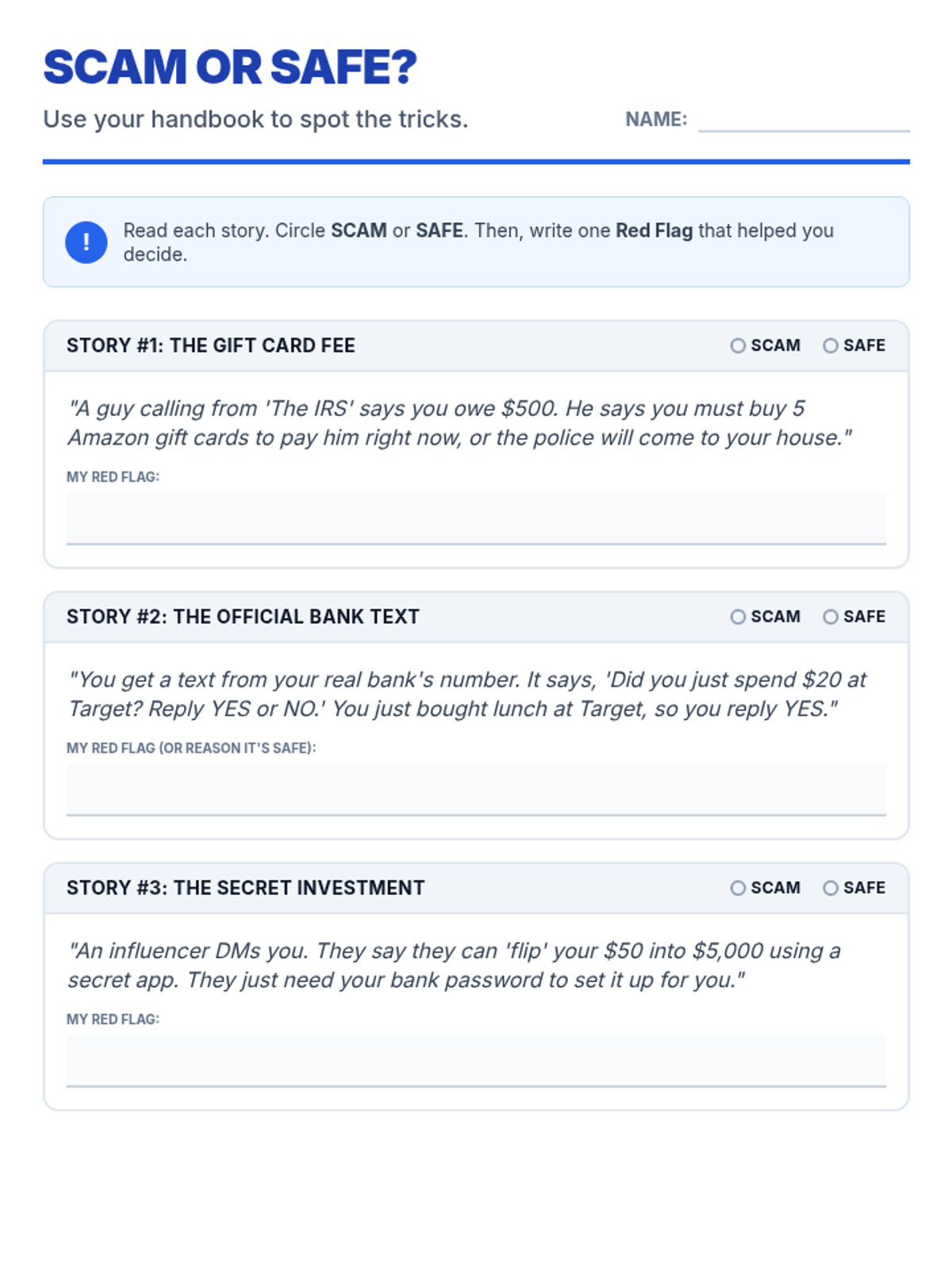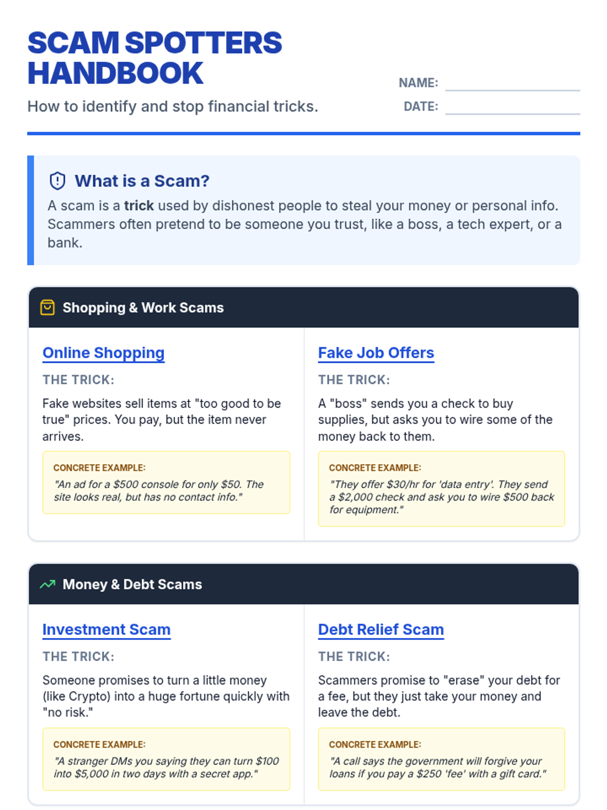 A lesson designed to help neurodiverse high school students identify and avoid common financial scams through plain language explanations and concrete, relatable examples.