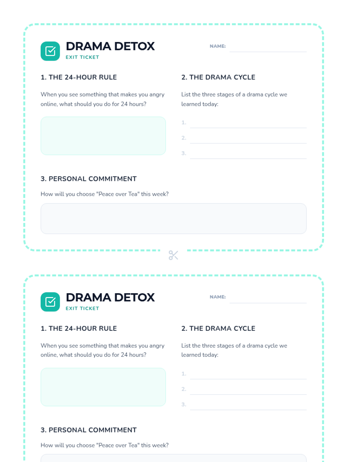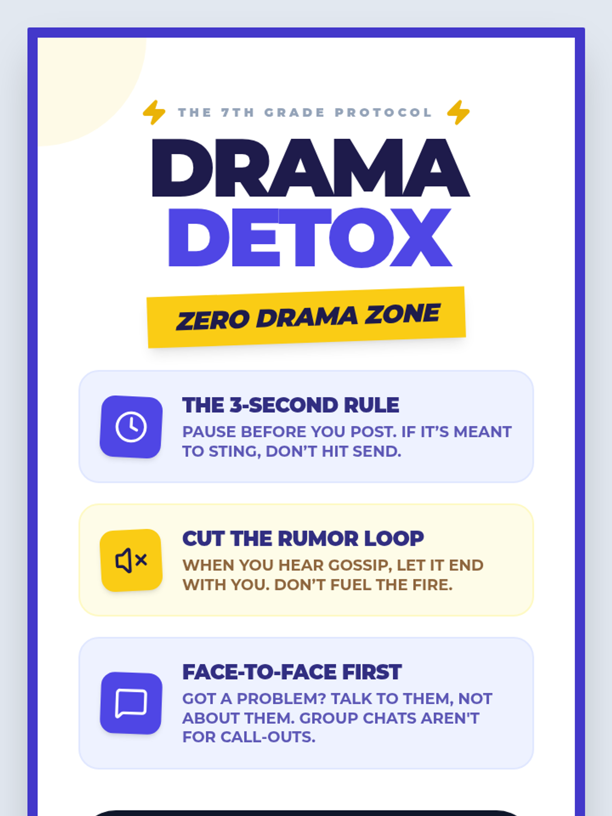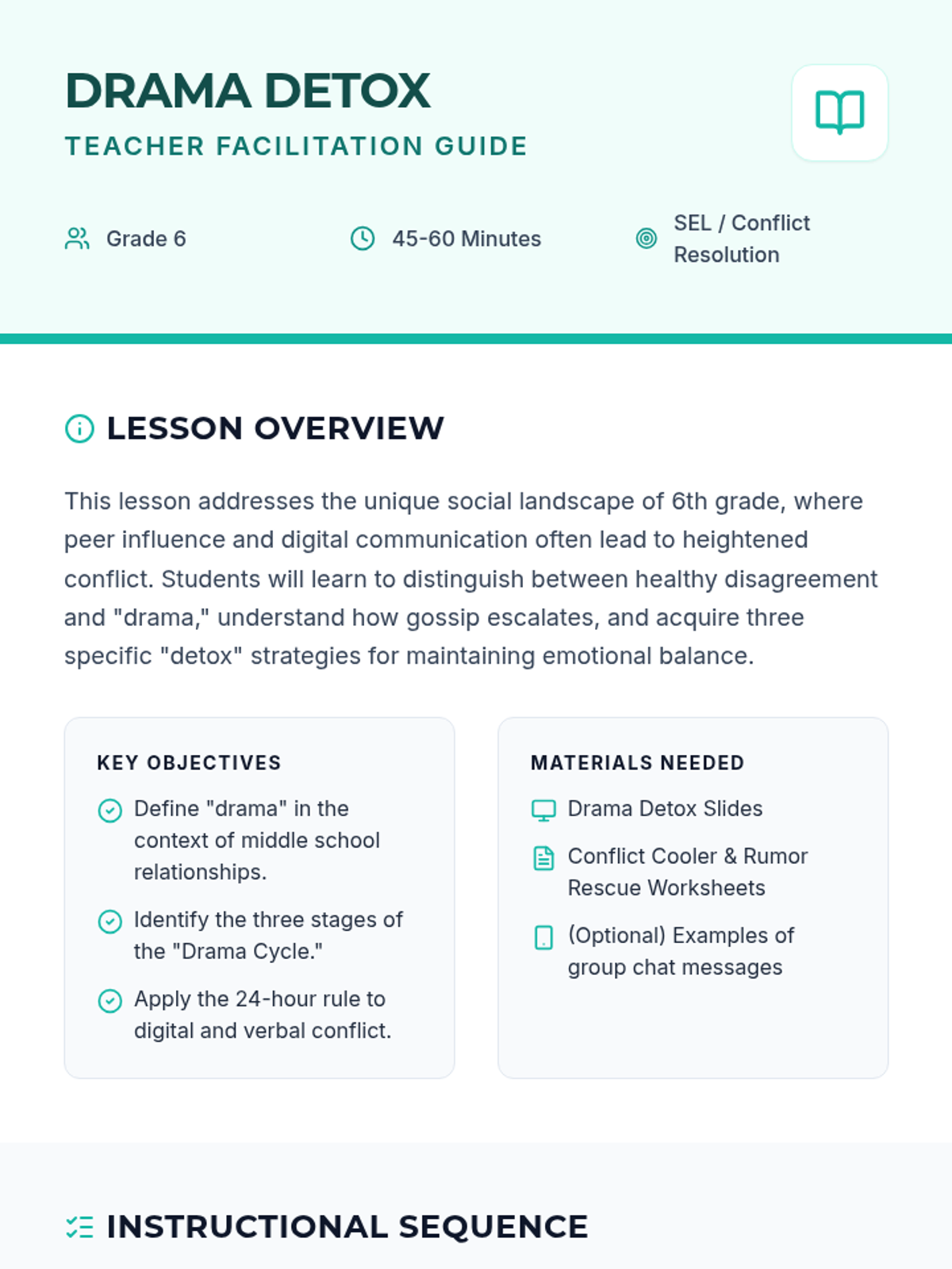 A comprehensive Social-Emotional Learning (SEL) lesson designed for 6th graders to identify, de-escalate, and avoid social drama. Students will learn the 'Drama Cycle' and practice practical strategies for maintaining healthy peer relationships both online and offline.