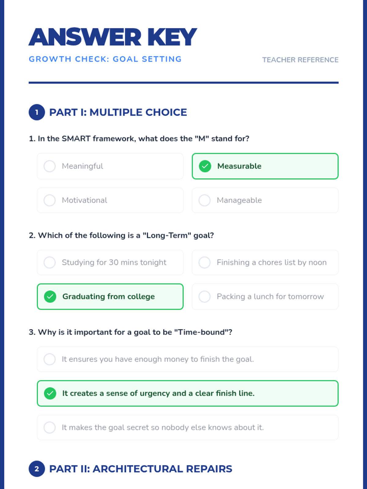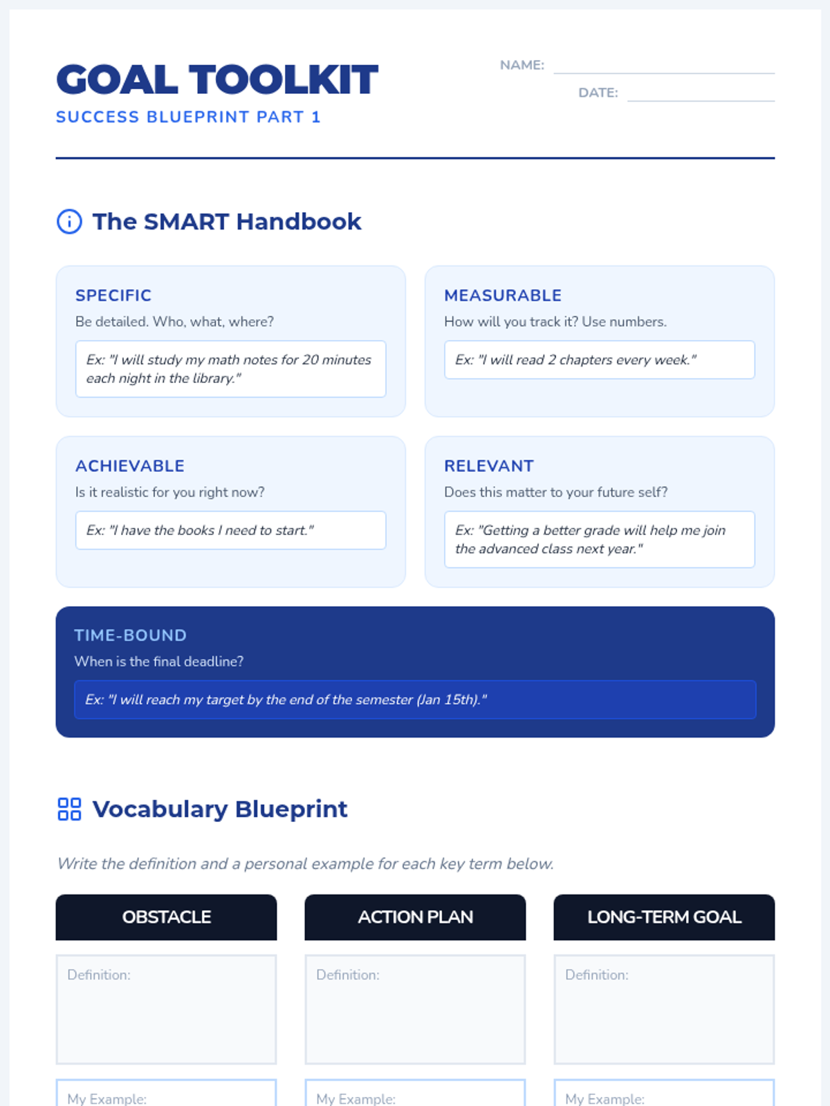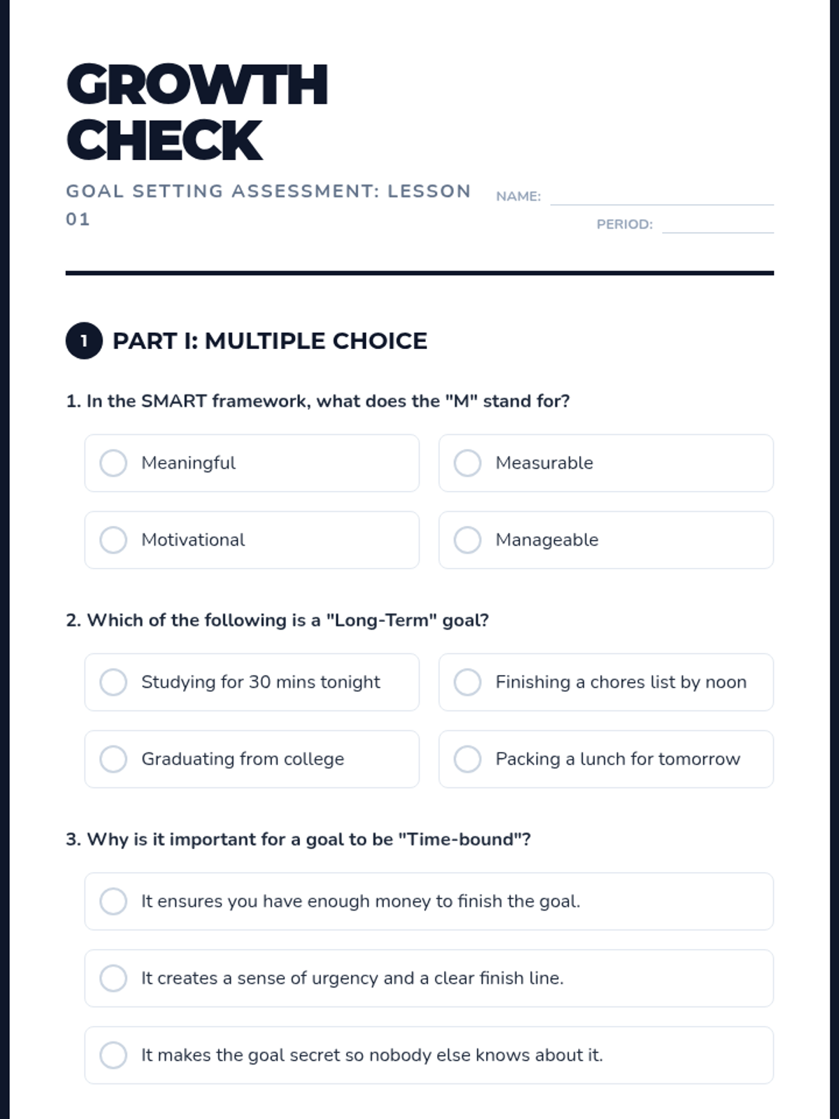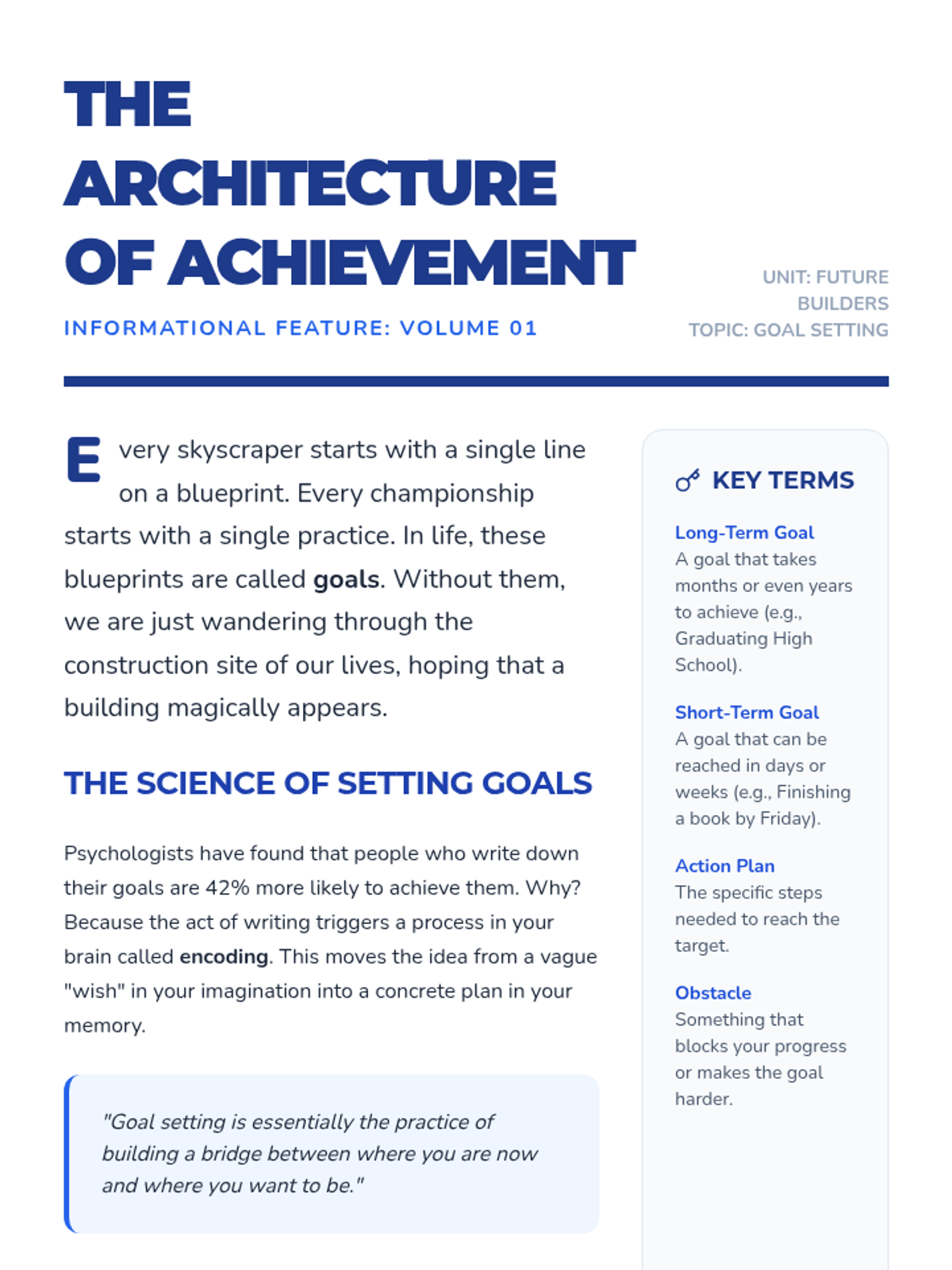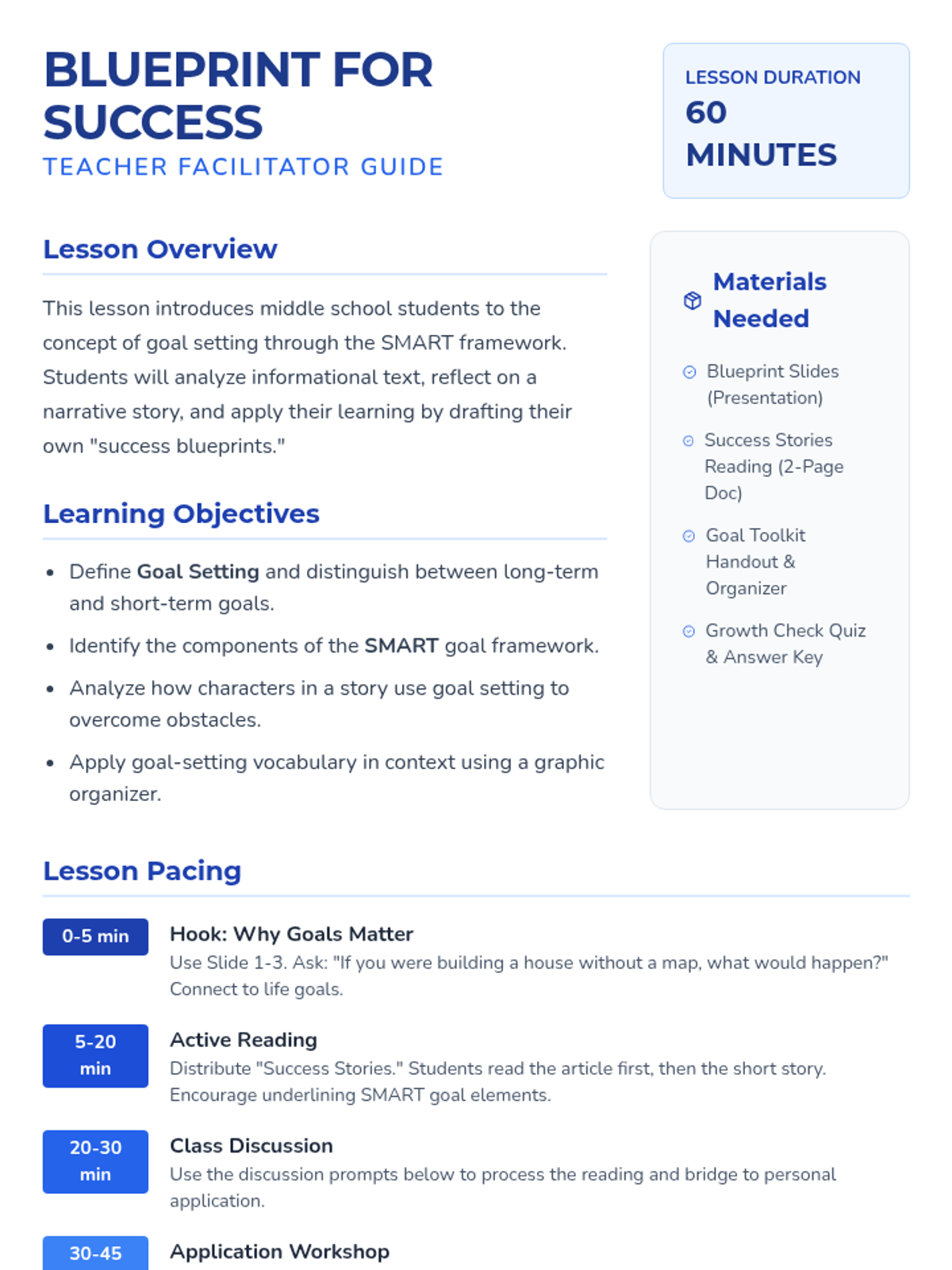 A comprehensive lesson teaching middle schoolers the fundamentals of goal setting using the SMART framework, featuring informational reading, narrative examples, and practical application.