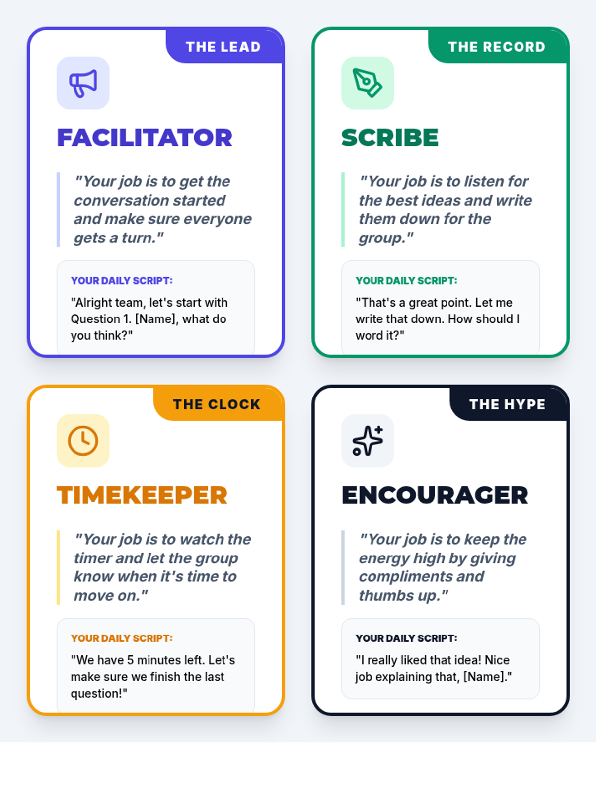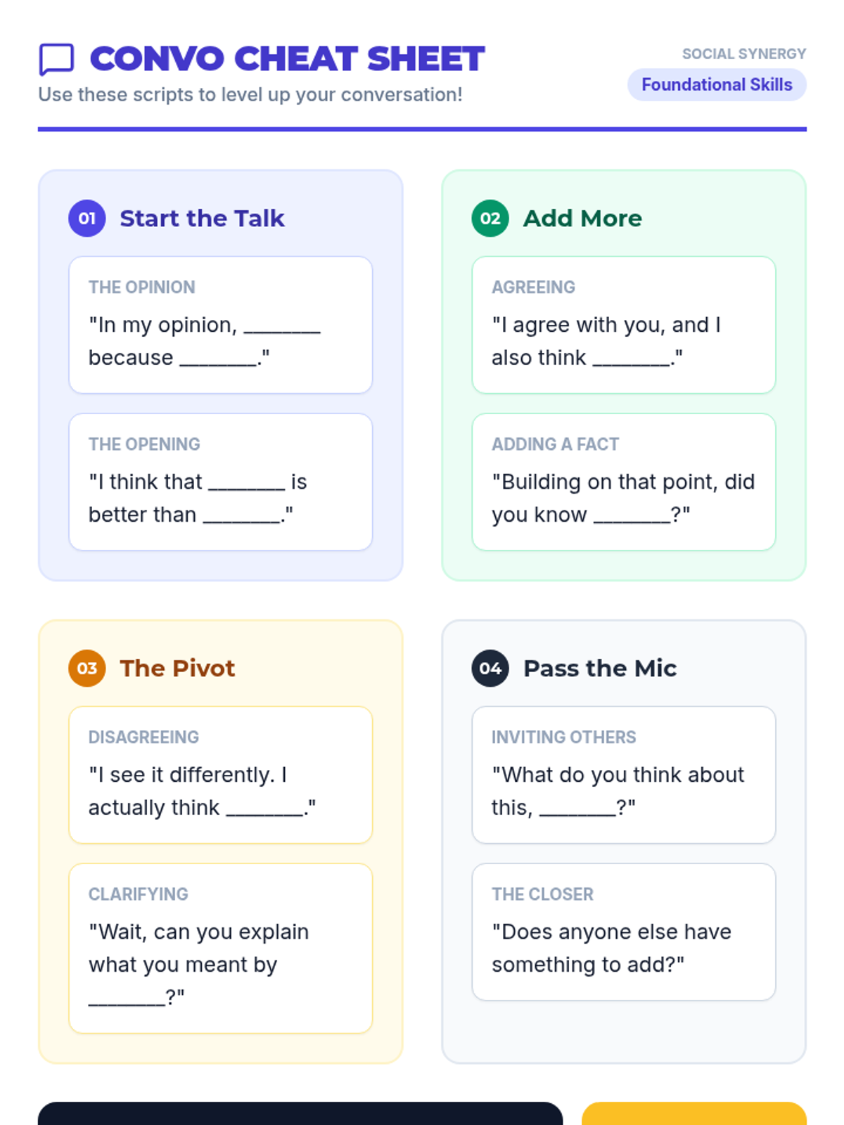 A relaxed, 20-minute 1-on-1 mentorship session introducing communication styles through a "cheat sheet" guide and conversational role-plays.
