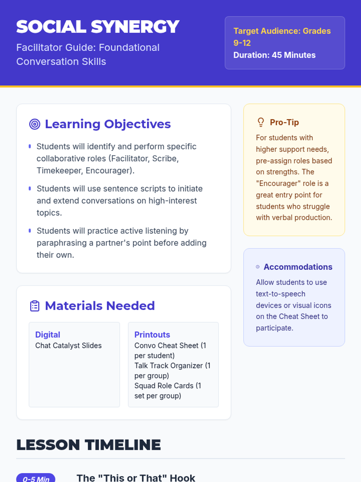 A 45-minute high school lesson focused on teaching students how to engage in meaningful conversation and collaborate effectively using specific roles and sentence scripts.
